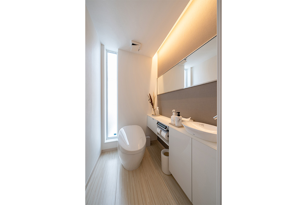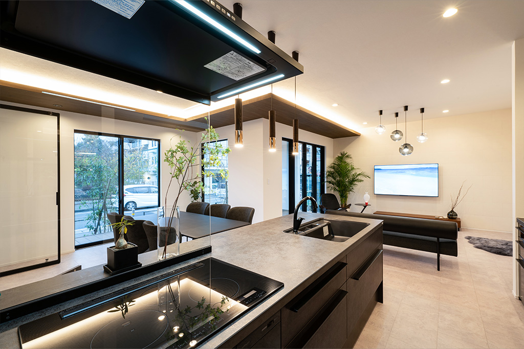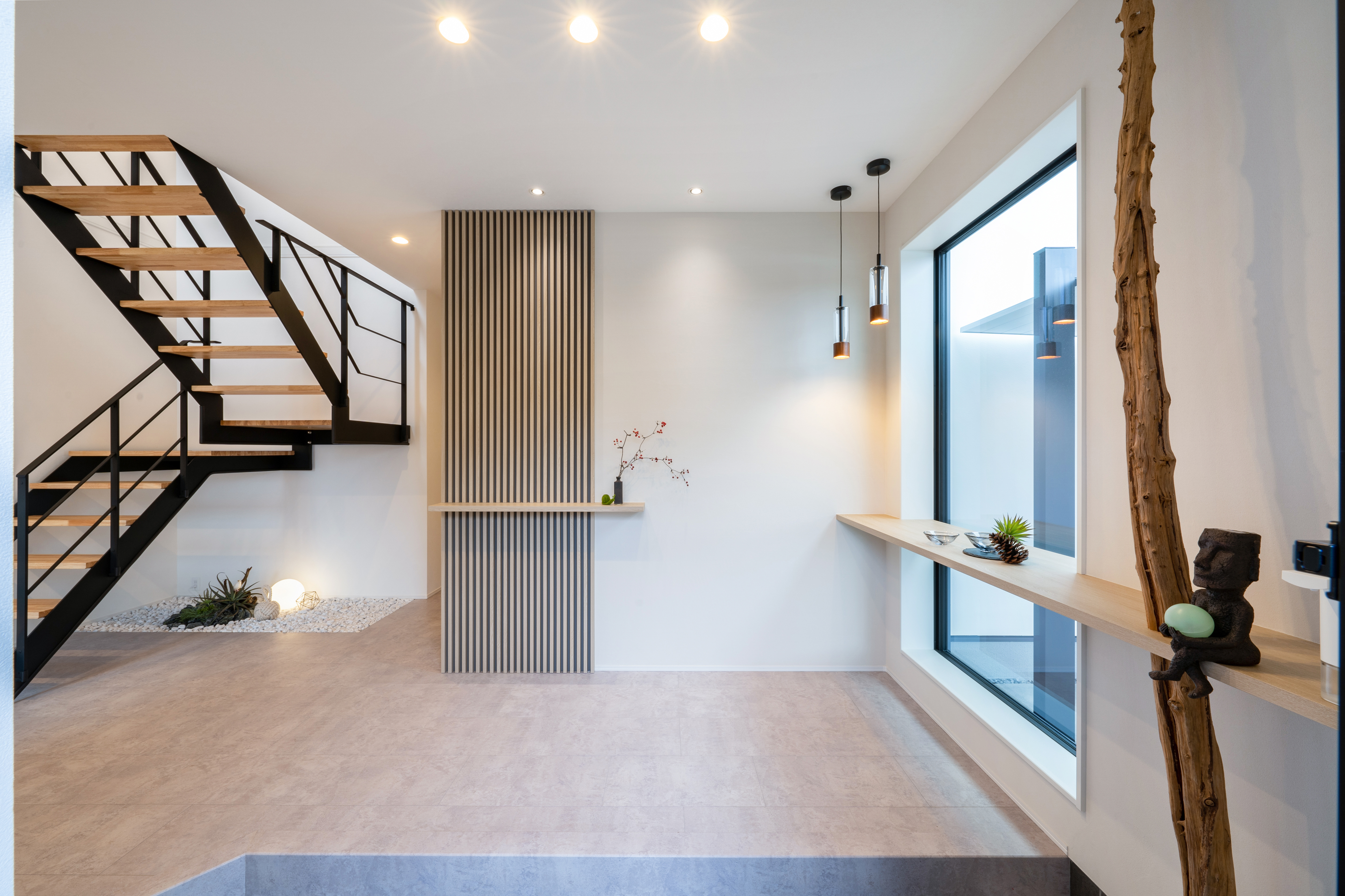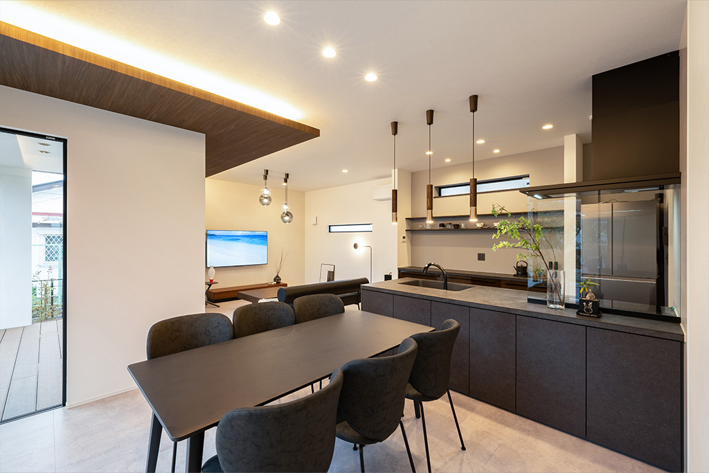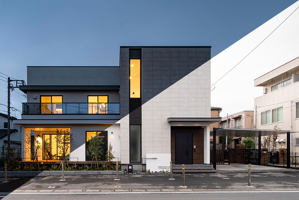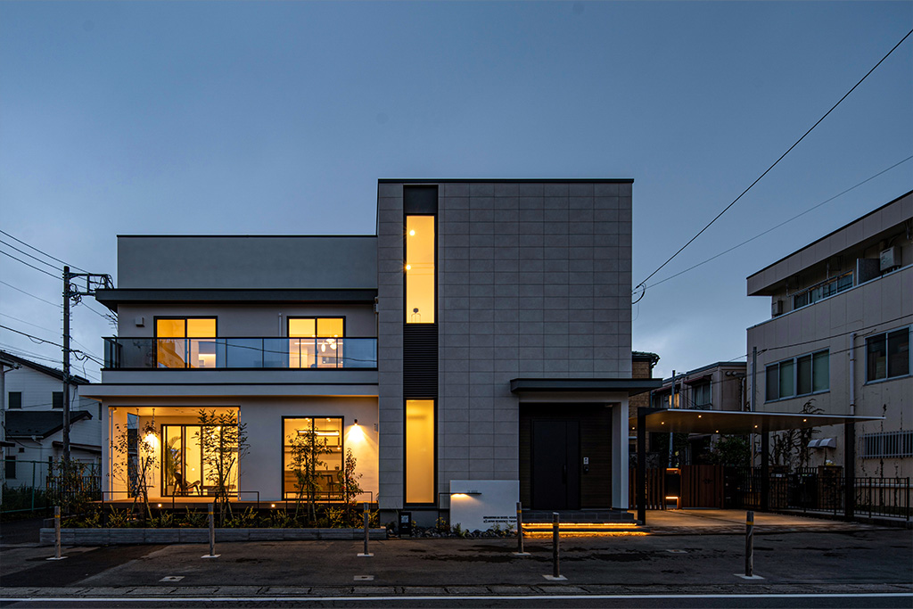 家の顔となる外観は、白を基調としたシンプルかつシャープな外観デザイン。木目調横格子やタイルの重厚感をアクセントに、ブラックの玄関ドアなどで引き締め効果も!夜には照明によって日中と異なる雰囲気も味わえます。