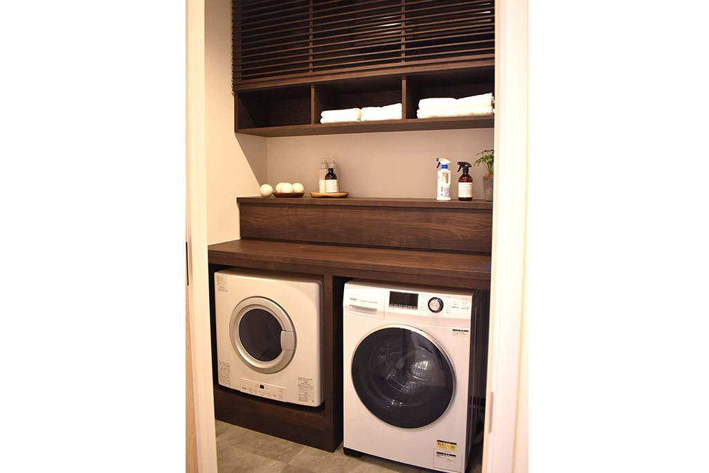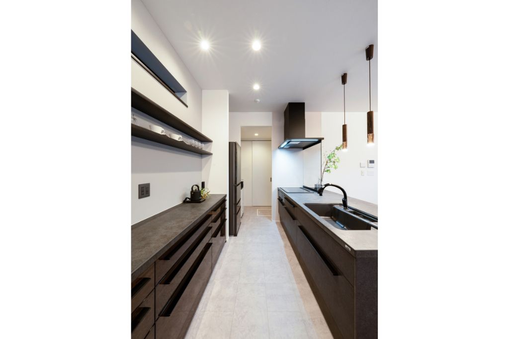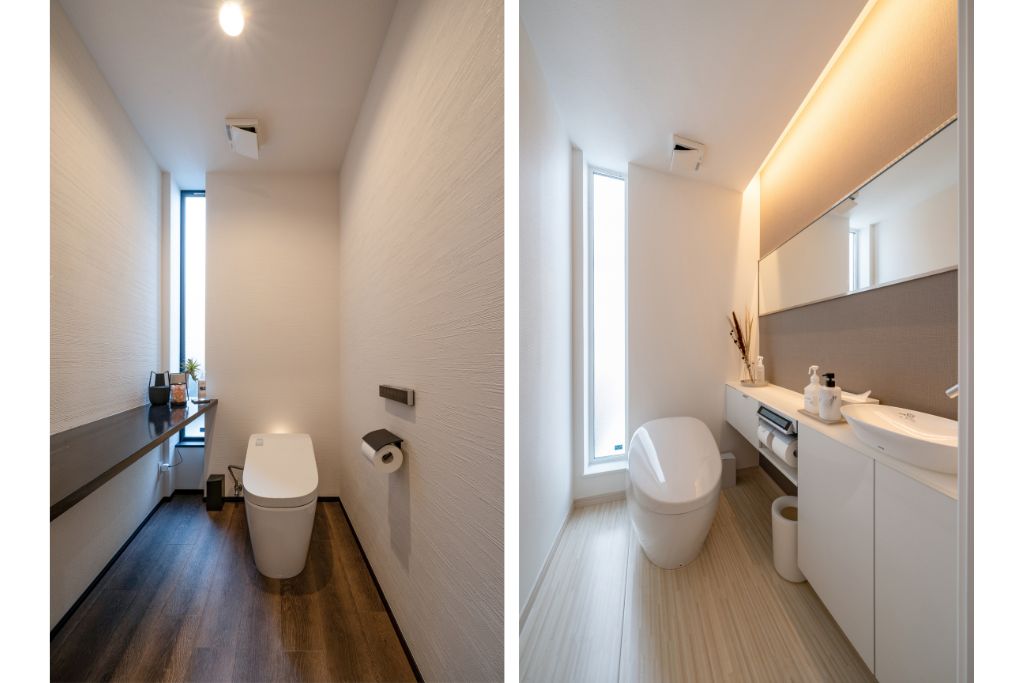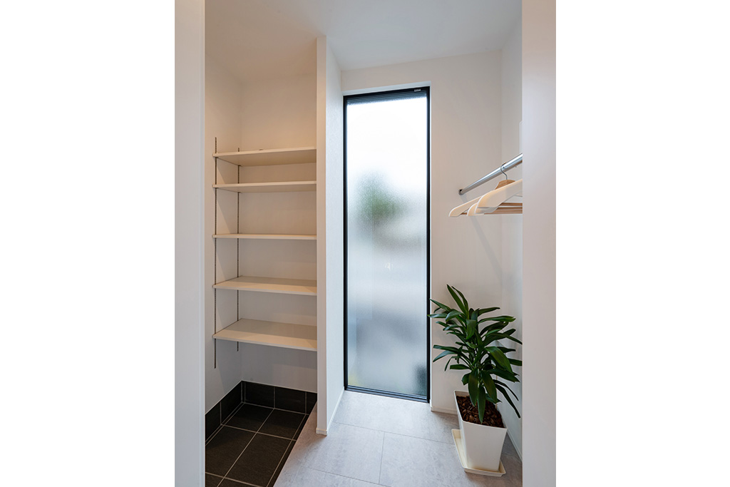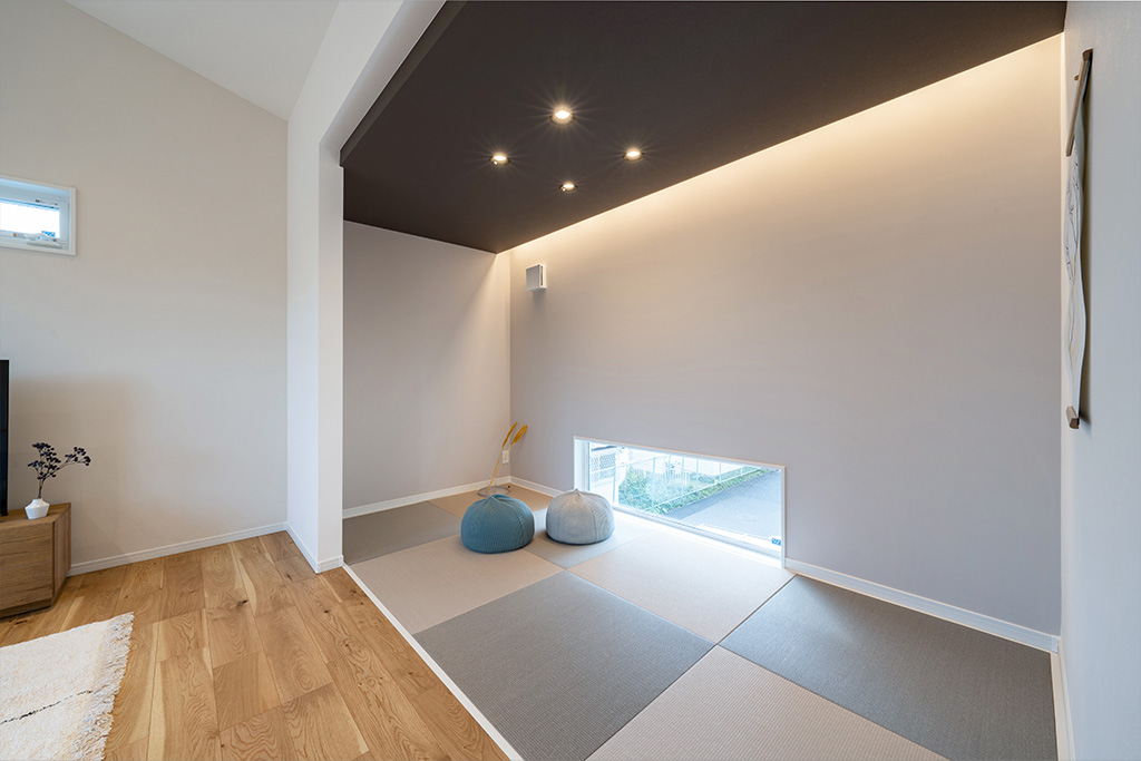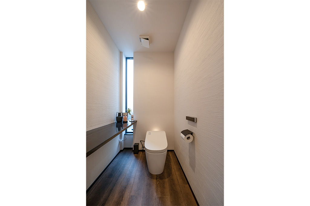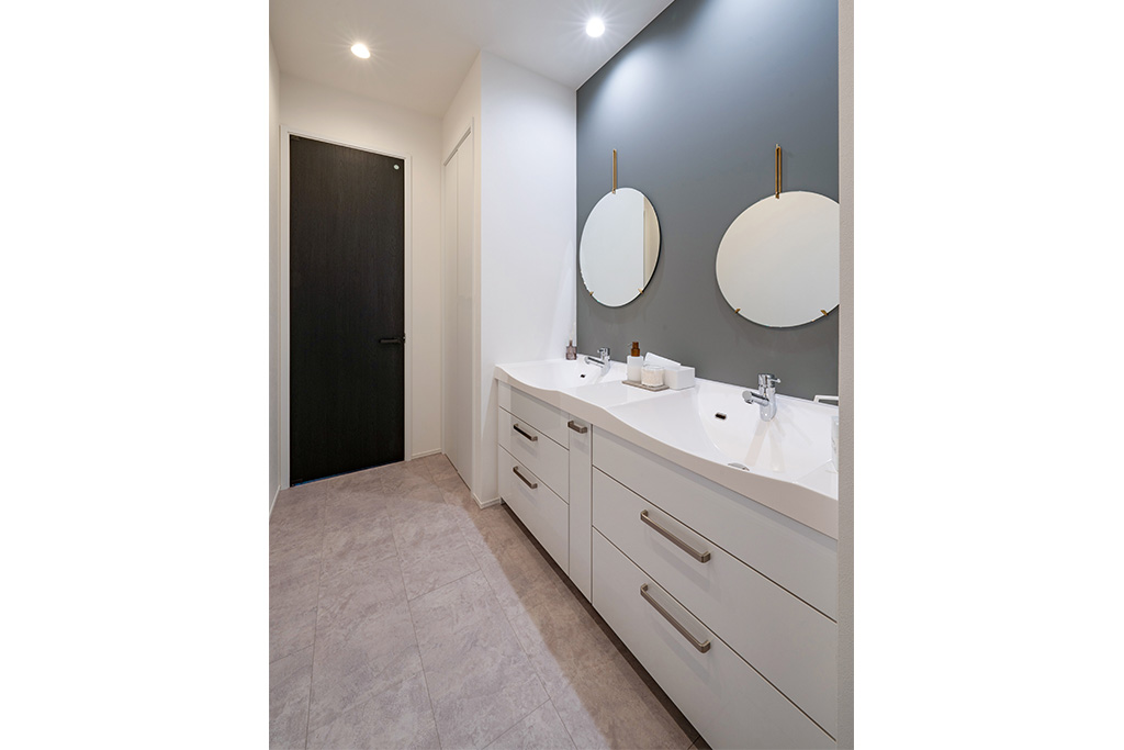 家の顔となる外観は、白を基調としたシンプルかつシャープな外観デザイン。木目調横格子やタイルの重厚感をアクセントに、ブラックの玄関ドアなどで引き締め効果も!夜には照明によって日中と異なる雰囲気も味わえます。