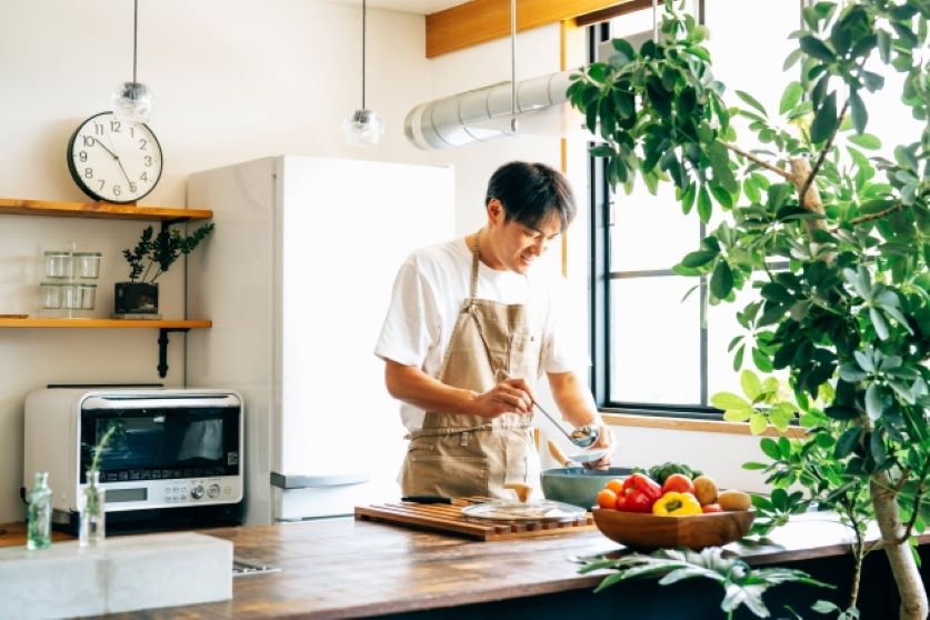 キッチンの使い方をイメージすると、使いやすい配置が決まってきます。そこからキッチン全体のデザインを考え、リビングやダイニングとのつながりをイメージすることで、住宅全体のデザインへと発展させることができるでしょう。