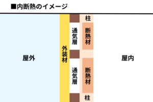 内断熱工法は、木造なら構造材、鉄骨造なら補強材やコンクリート材の内側に断熱材を施し、内壁材で蓋をするようなイメージの工法です。