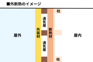 外断熱工法は、木造なら構造材、鉄骨造なら補強材やコンクリート材の外側に断熱材を、断熱材の外に外壁材を施す工法です。