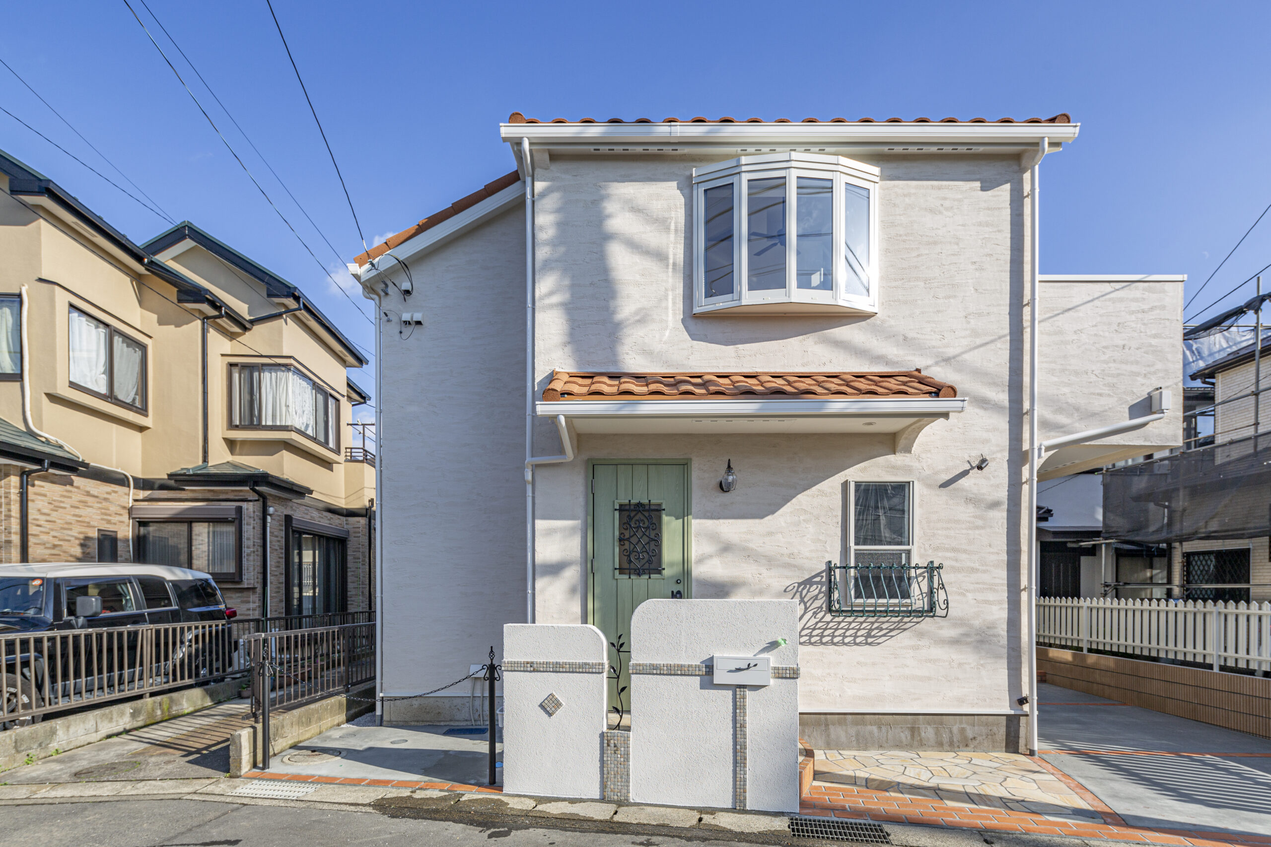 屋根にはディーズルーフィング「ローマン」を採用し、南欧スタイルを象徴する鮮やかなオレンジが外観のアクセントに。1階窓にはニチハ・トレセのフラワーボックスを設置し、深いグリーンに塗装してアンティークな雰囲気をプラス。玄関ドアのリーフグリーンとも調和し、外観全体にやさしい統一感が生まれています。