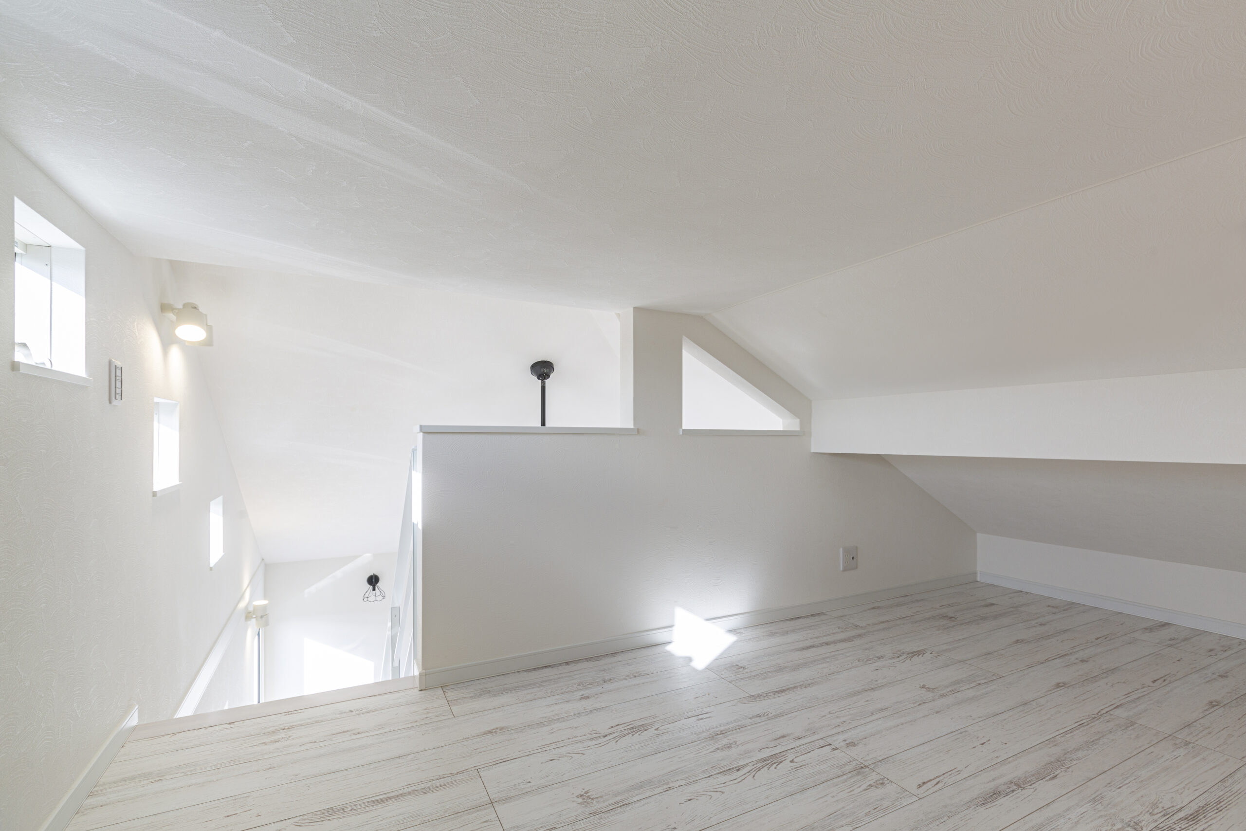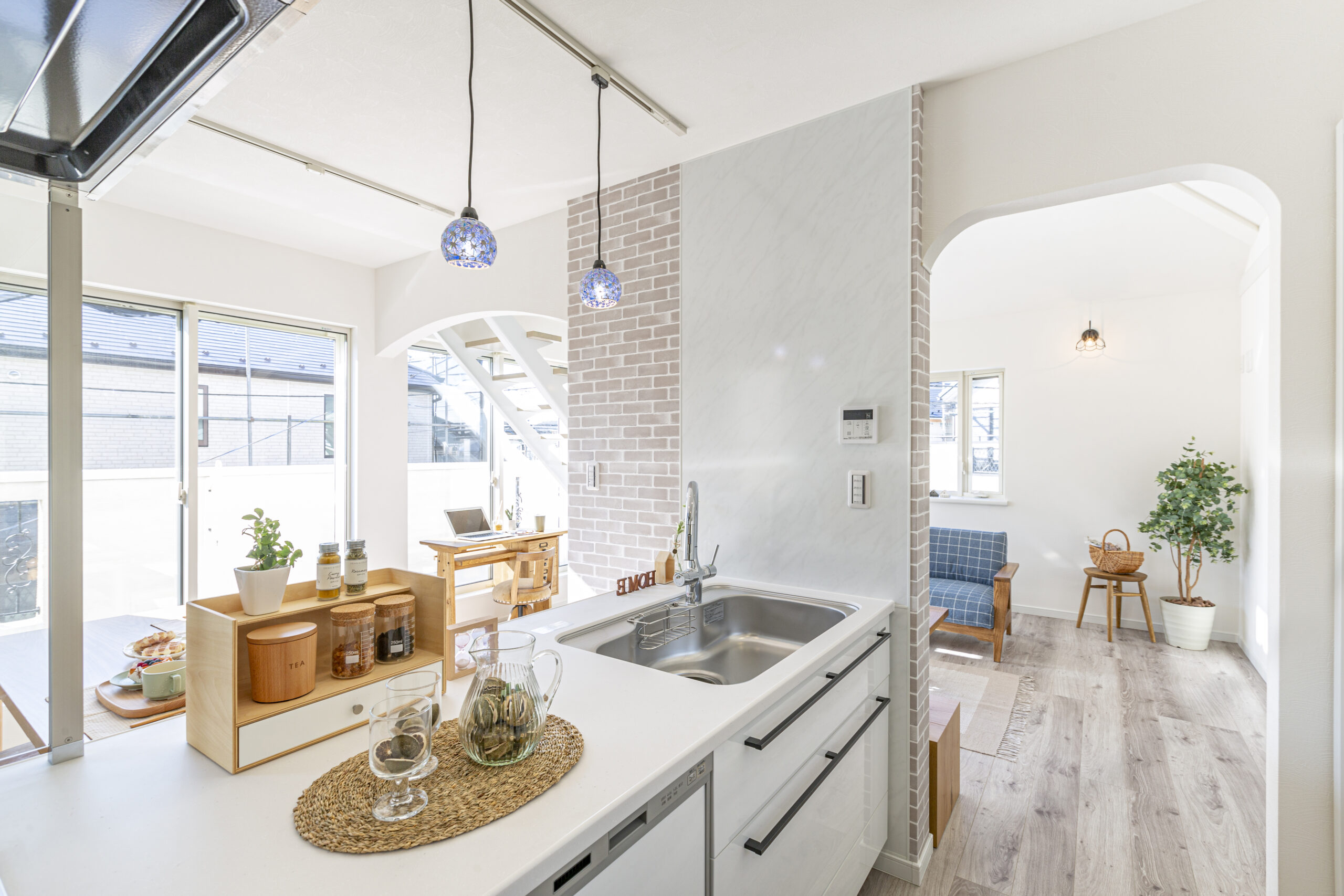 • ロフトにつづくスリット階段とレンガ調のアクセントクロスが目を引くLDK。シーリングファンや各ライトがおしゃれ度アップさせ、吹き抜け仕様で明るいリビングになっています。