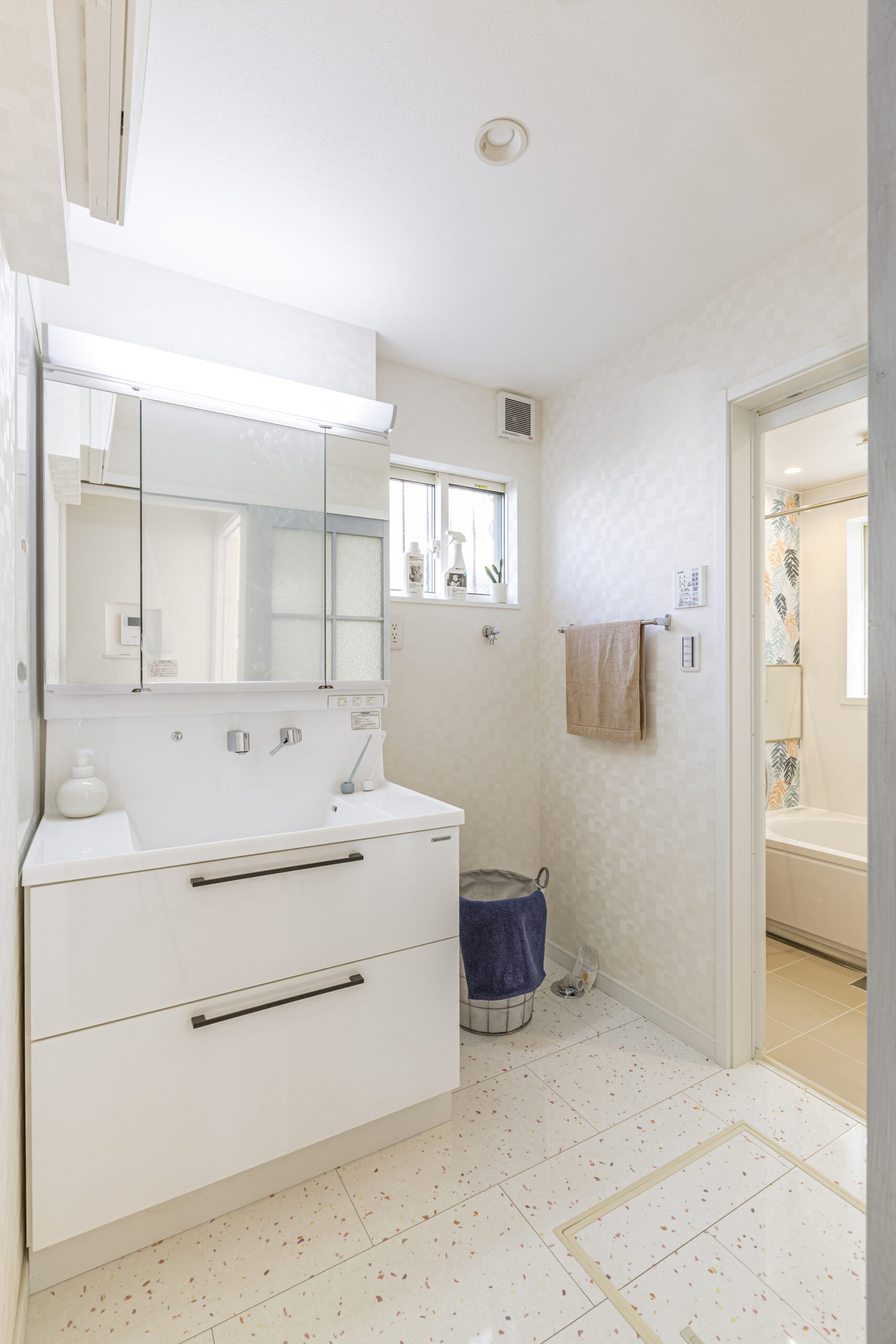 • 洗面脱衣所は、大理石長の床材でらるハピアフロア石目柄のテラゾー柄で、ここでも可愛らしさが出る空間となっています。