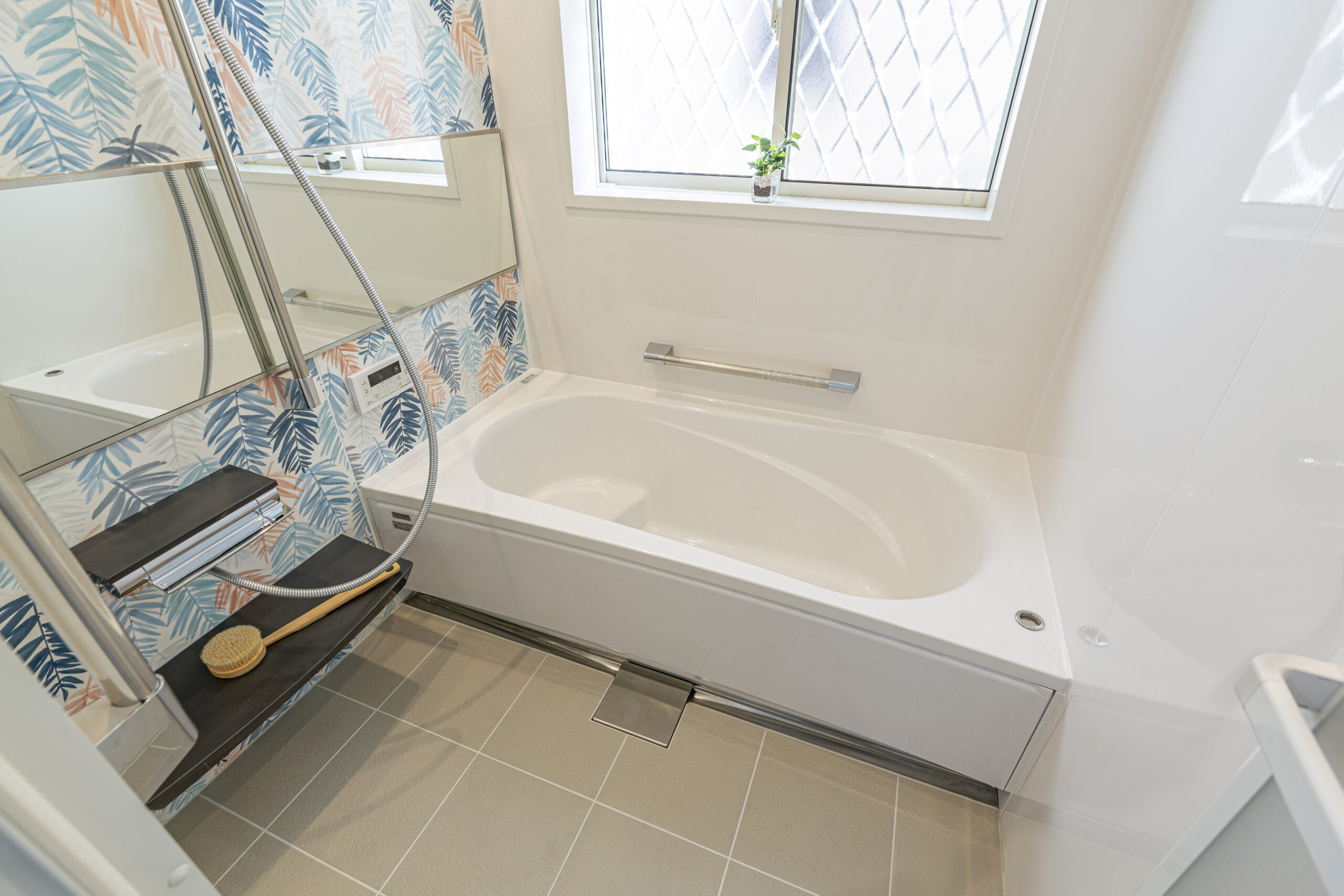 • 浴室はタカラスタンダードのリラクシアPタイプを採用。浴室パネルは、ボタニカルミックスで鮮やかな印象に。