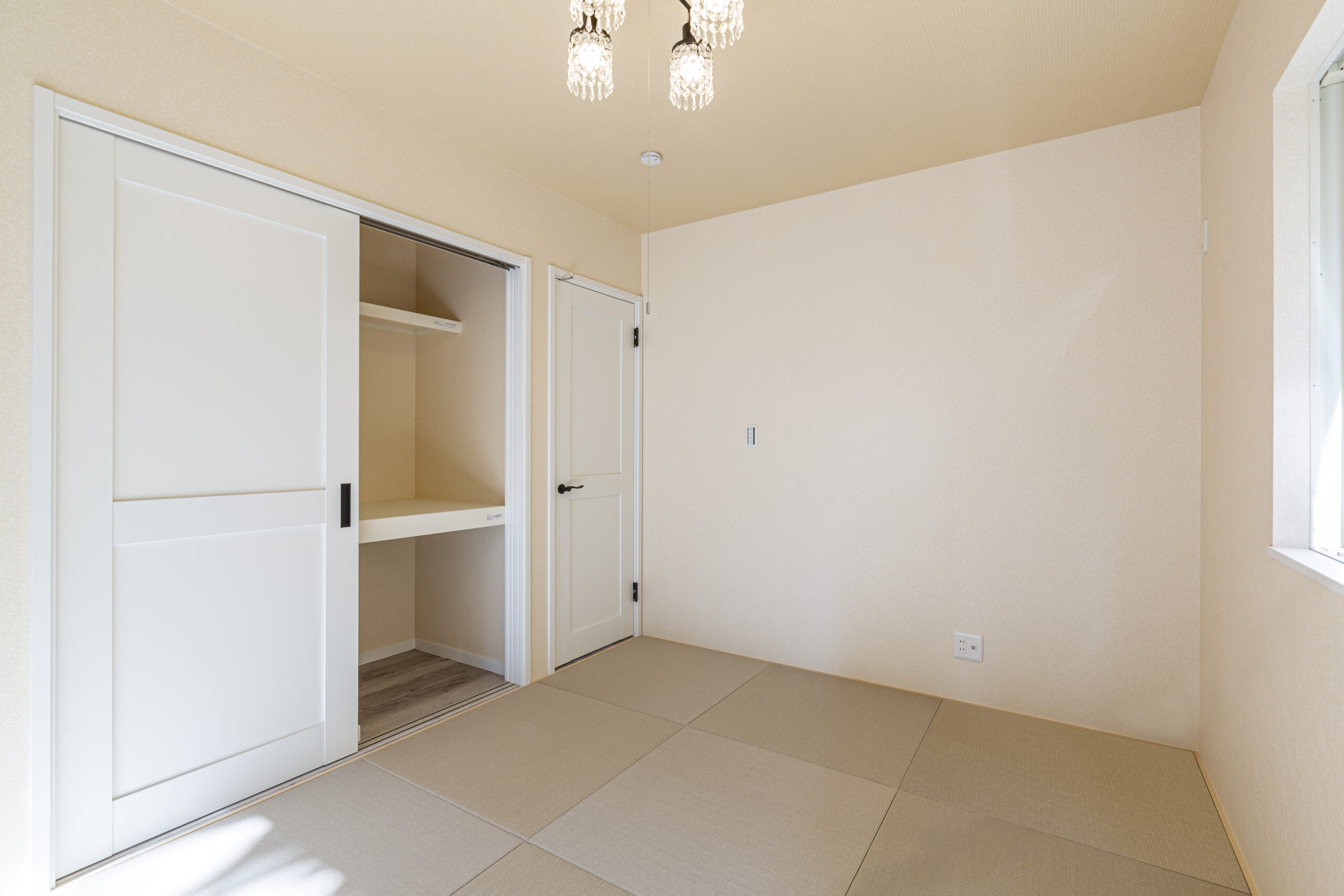 和室には“灰桜色”の畳を採用し、ベージュ×ホワイトを基調とした優しいトーンで南欧スタイルに馴染む和室デザインに。