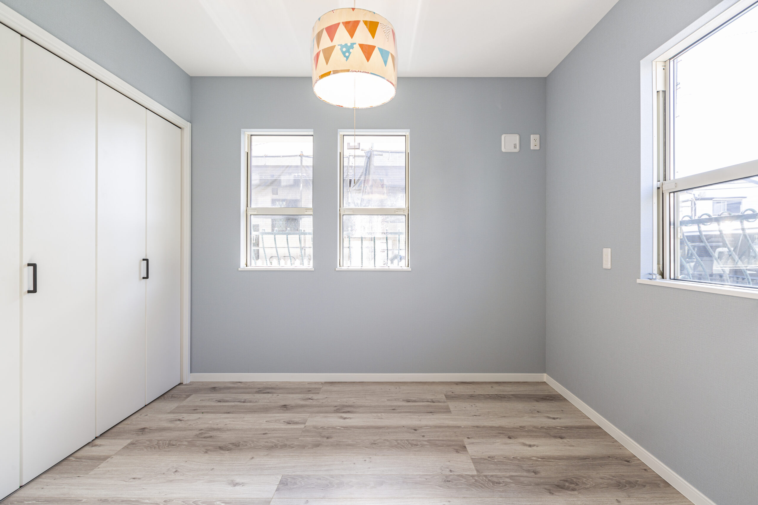 • 一方洋室は、明るめなグレー系のカラーを採用(リリカラLB9431)。床のラシッサDフロア ホワイトオークと可愛いデザインのライトと相まって、主張しすぎない可愛らしさがある洋室となっています。