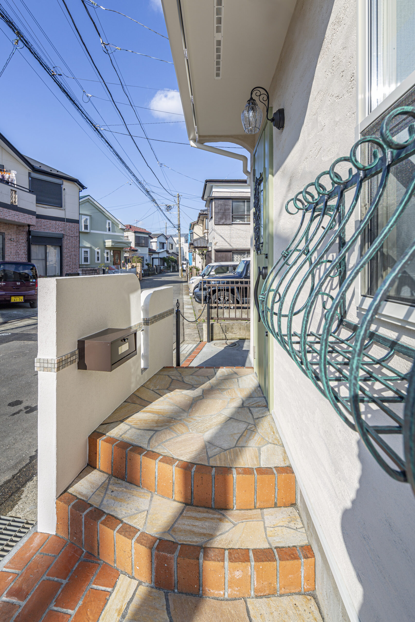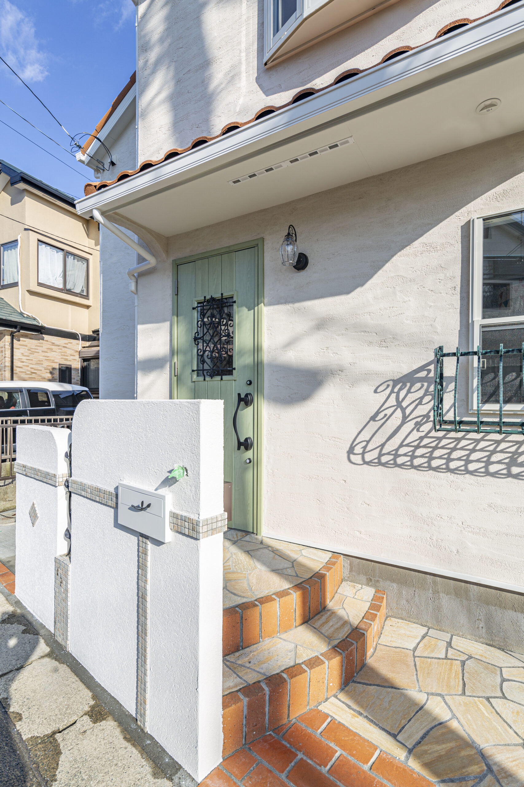• リーフグリーンの玄関ドアが明るさを演出している玄関ポーチ。屋根とリンクした鮮やかなオレンジ色のレンガが外観の統一感を生み出します。