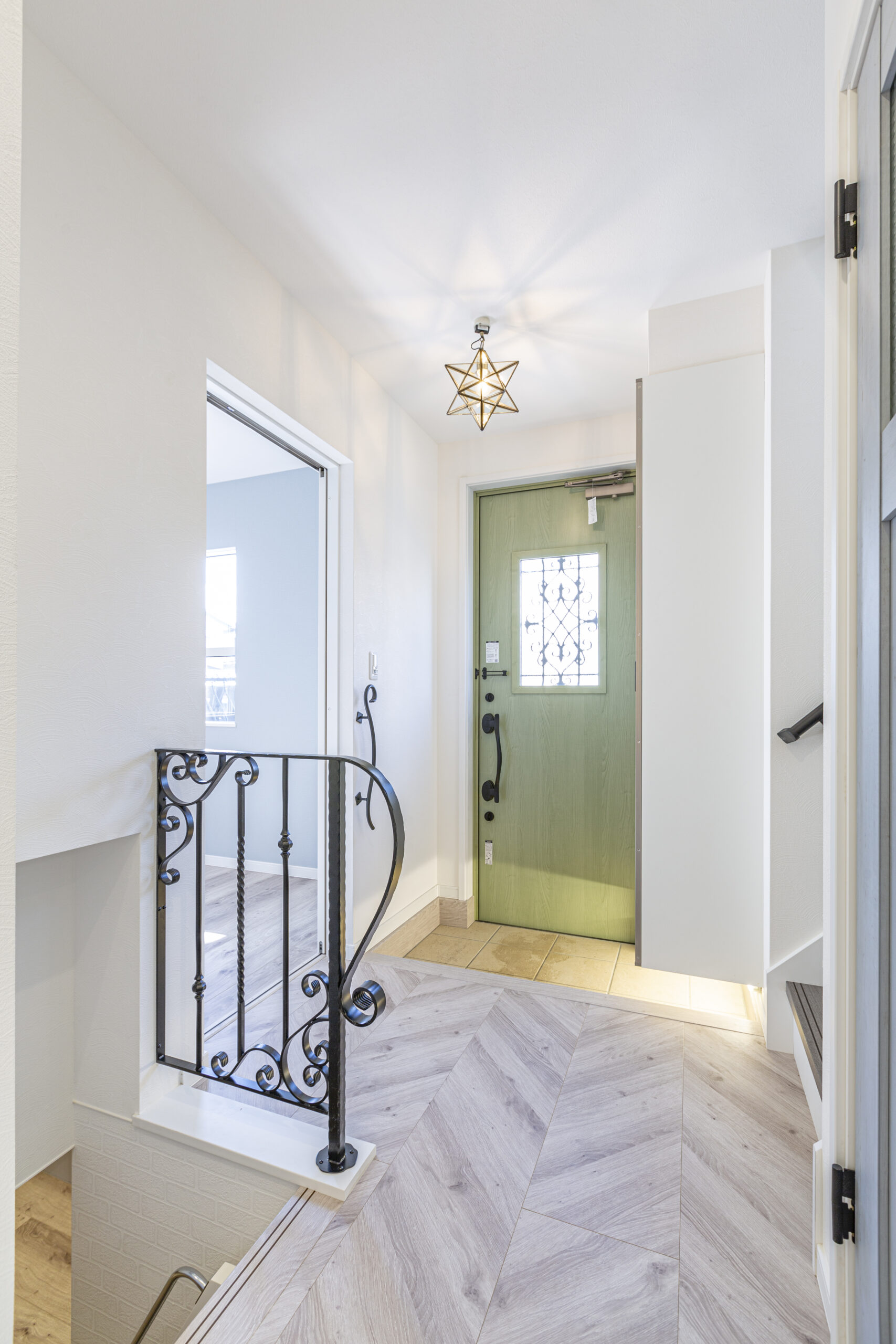 • 室内に入って玄関ホールの天井には、大人気の星形ライト。シェードの影が壁に映ると、おしゃれ度がグッとあがった玄関ホールになります。