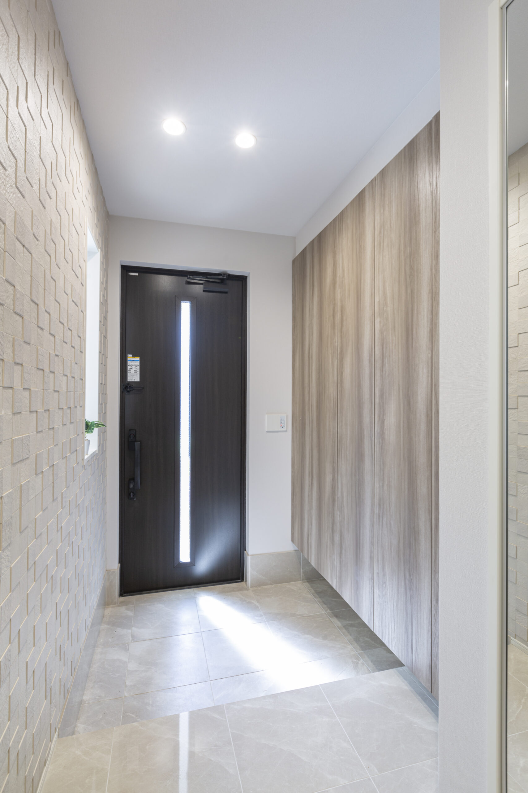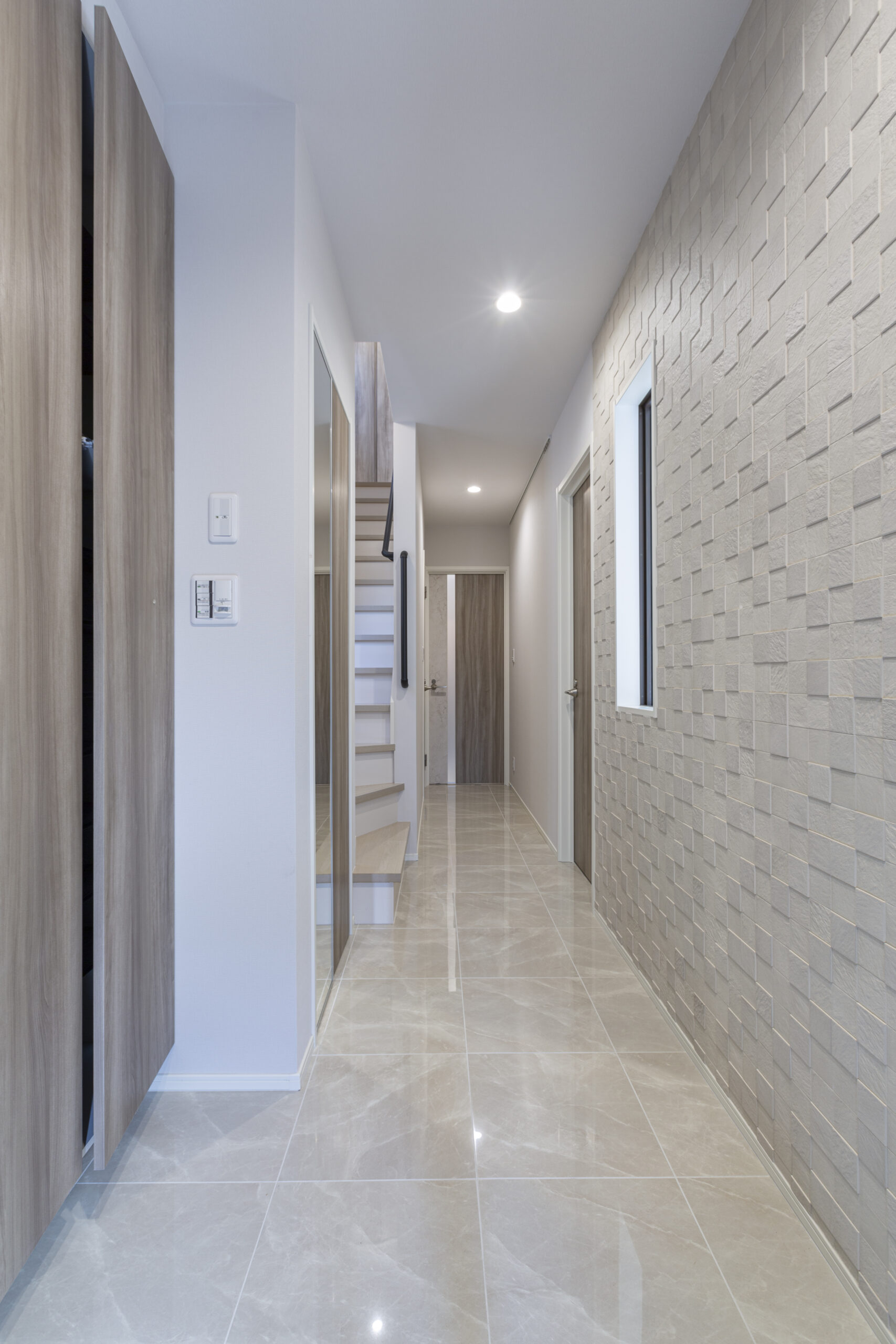 玄関ホールの片面の壁には、LIXILエコカラットプラスのペトラスクエア(ライトグレー)を採用。協調しすぎない凸凹デザインがデザイン性を高めています。 床は、ADVANのセラミカエコストーン(グレージュマット)を使用しており、壁素材と相まって高級感を演出しています。