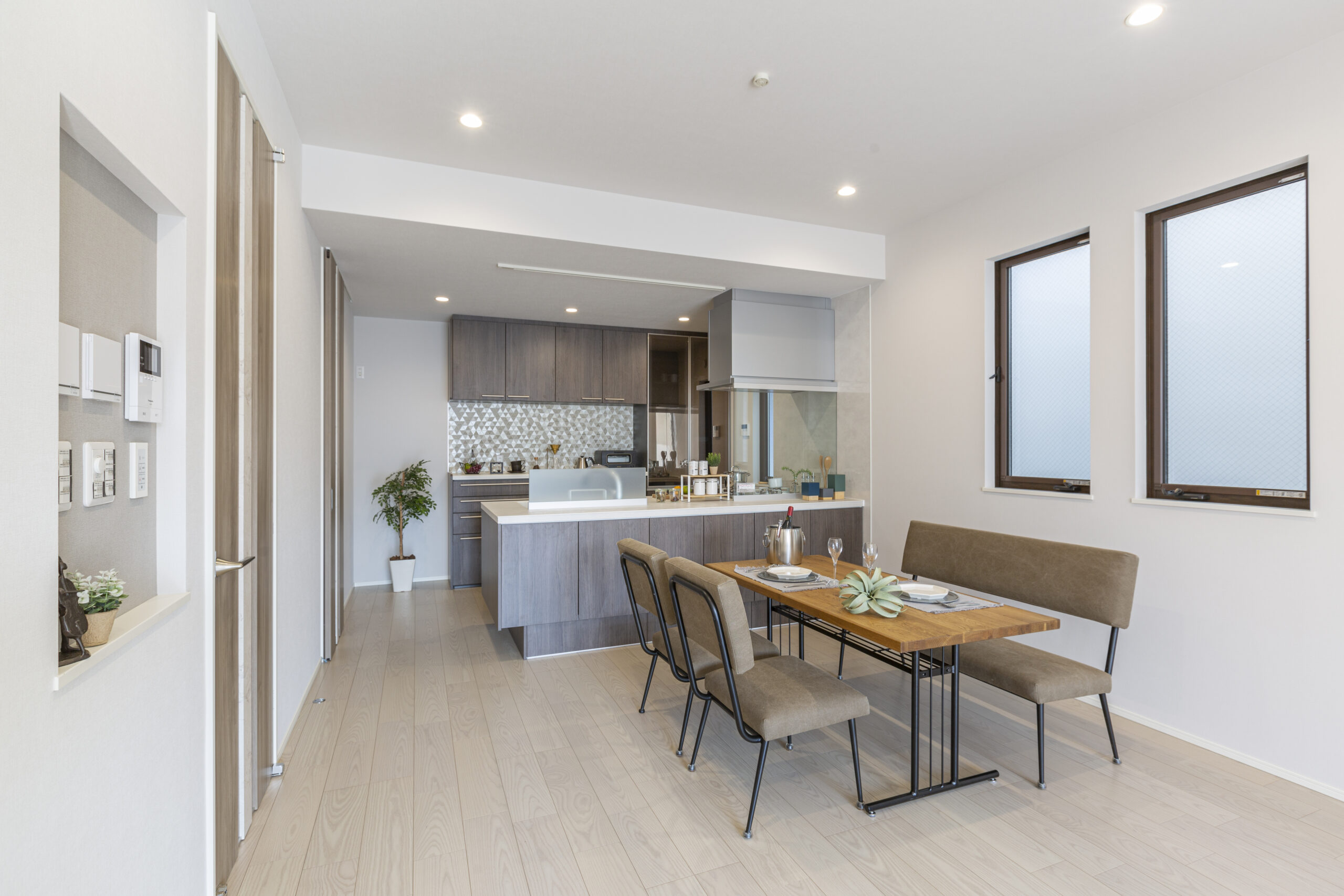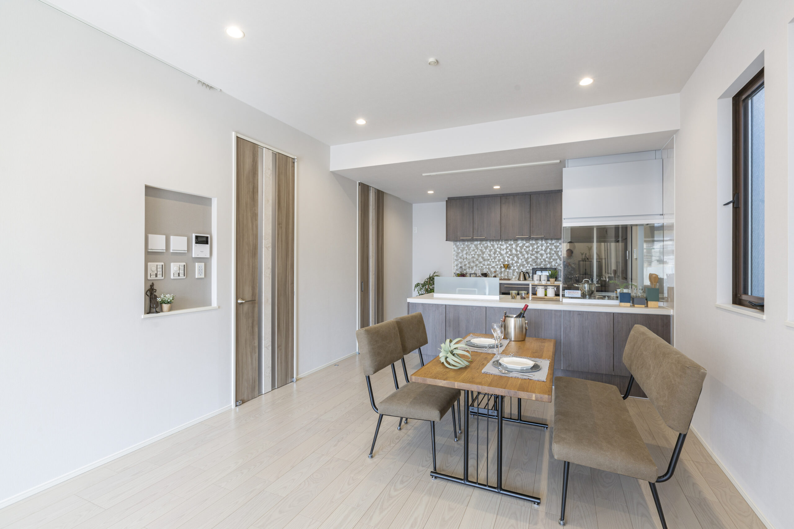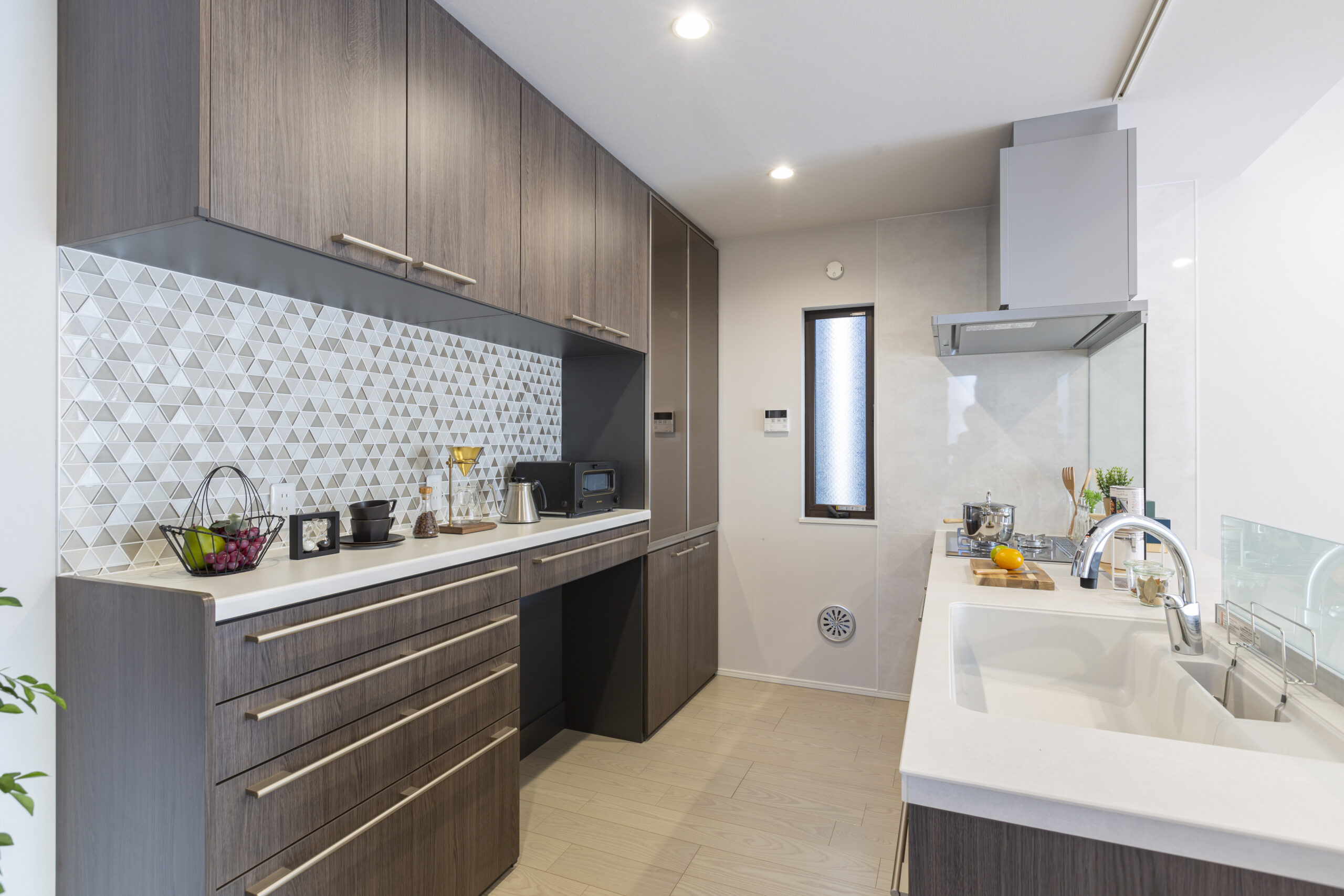 キッチンスペースの扉などは“ディープグレイン”というカラーを採用。 カップボード上の壁にはLIXILパールミックスのモザイクタイルを施し、“ディープグレイン”という暗すぎることのない奥行がある色味とマッチしています。