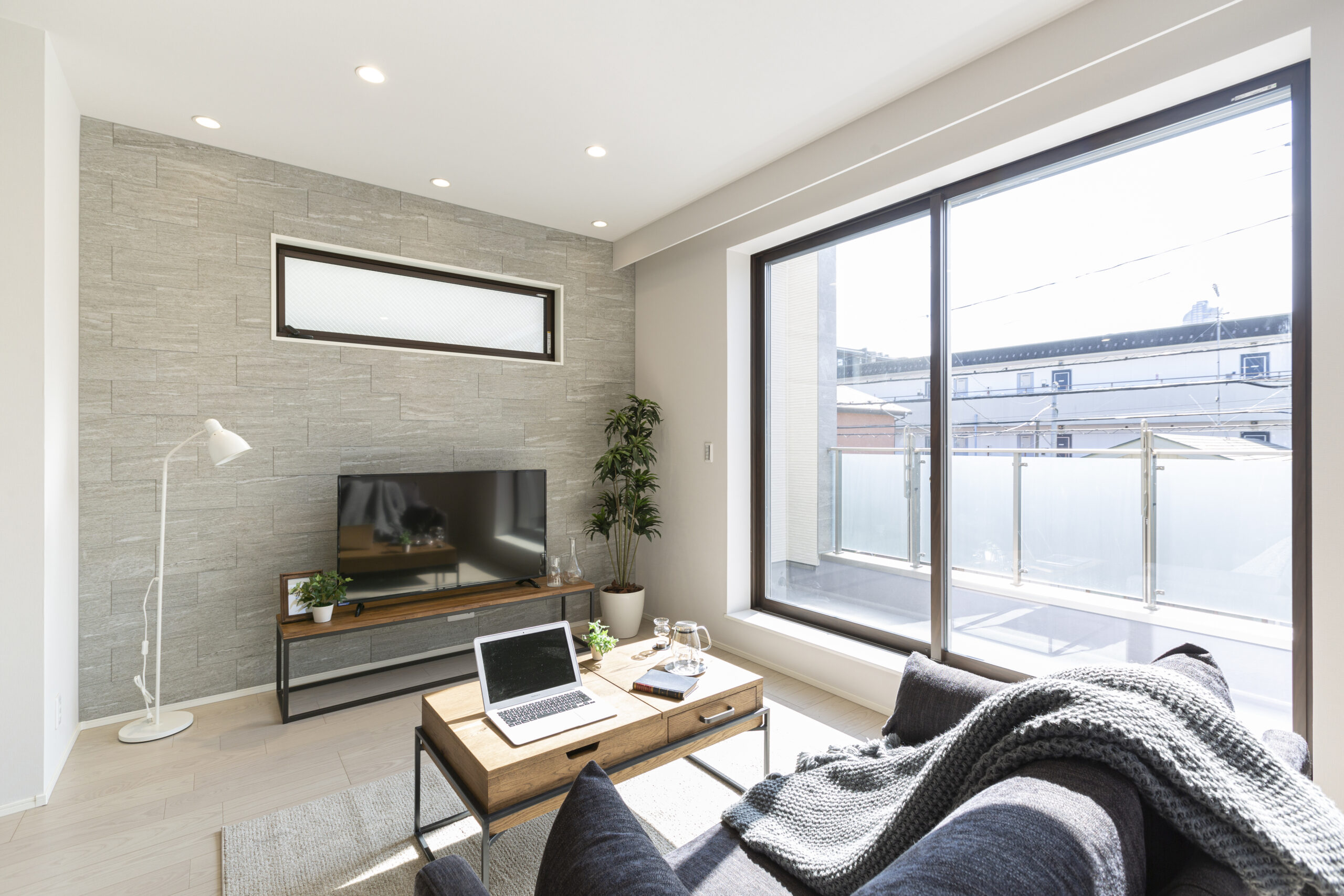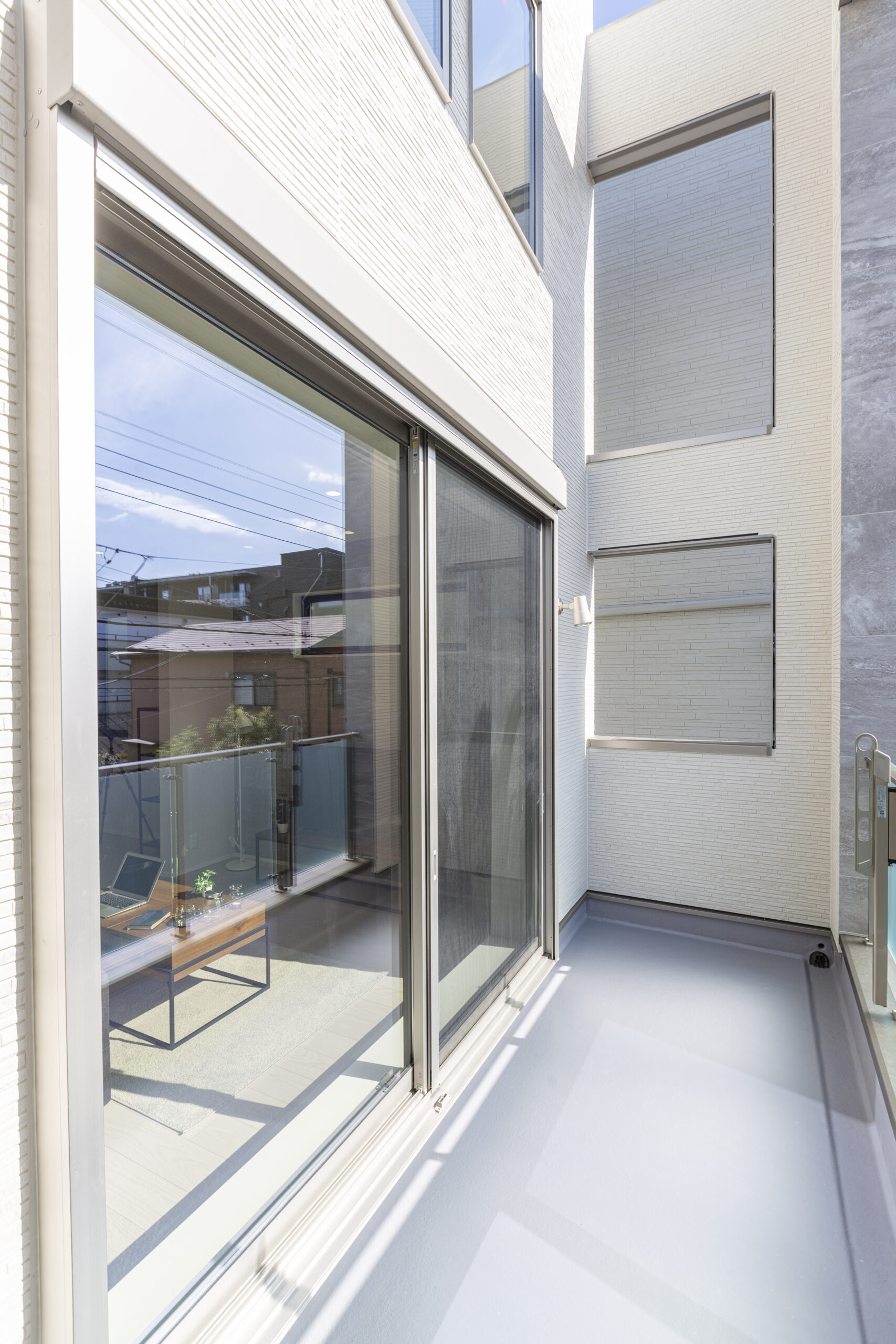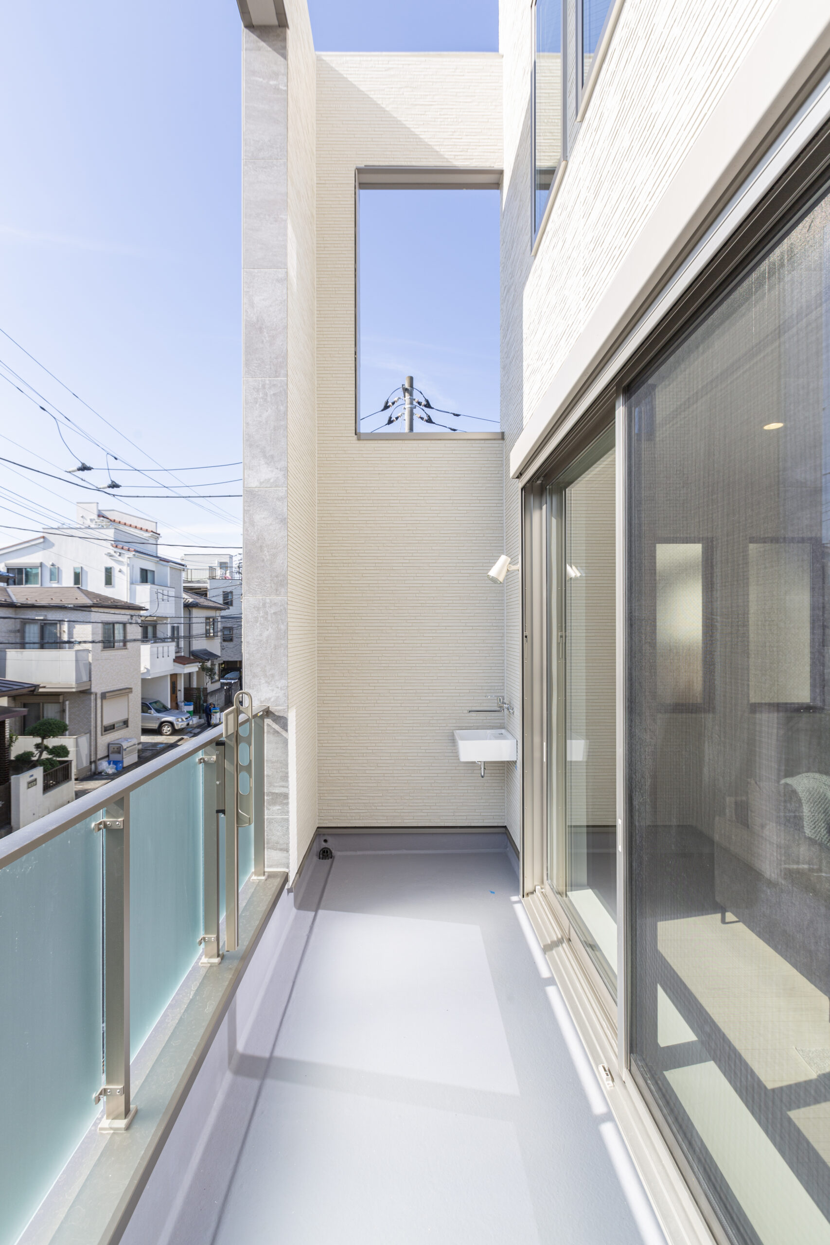 バルコニーは、目隠しと構造的な問題で両サイドに高く壁を設置していますが、家全体のテーマを崩すことがないデザインとなっています。