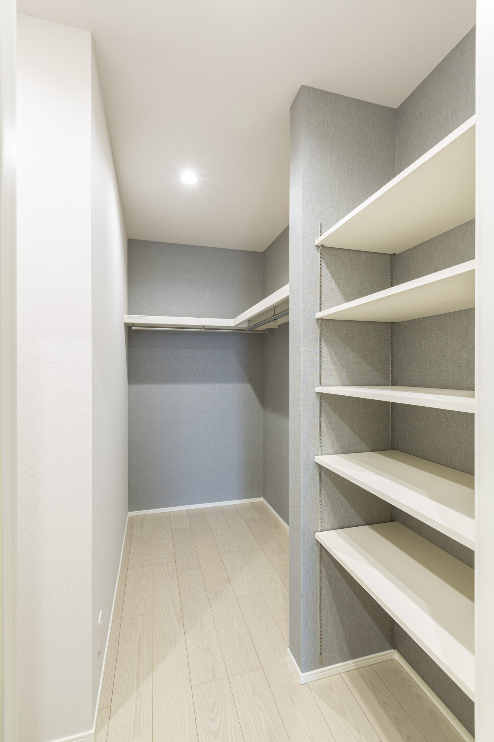 寝室の収納もW.I.Cでしっかり確保。あえてW.I.C外にラックも設置することで、見せる収納と見せない収納の使い分けができるようにしています。