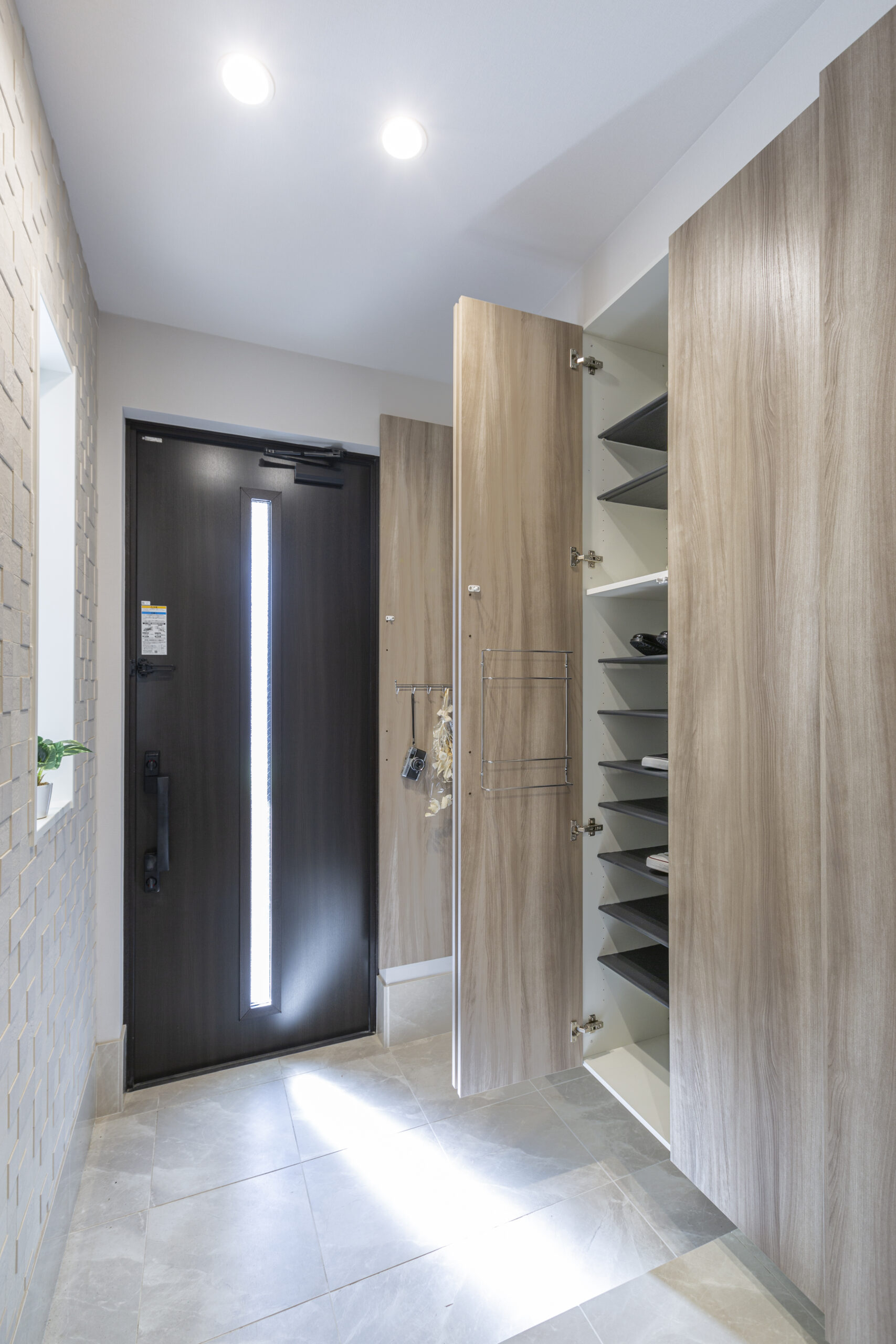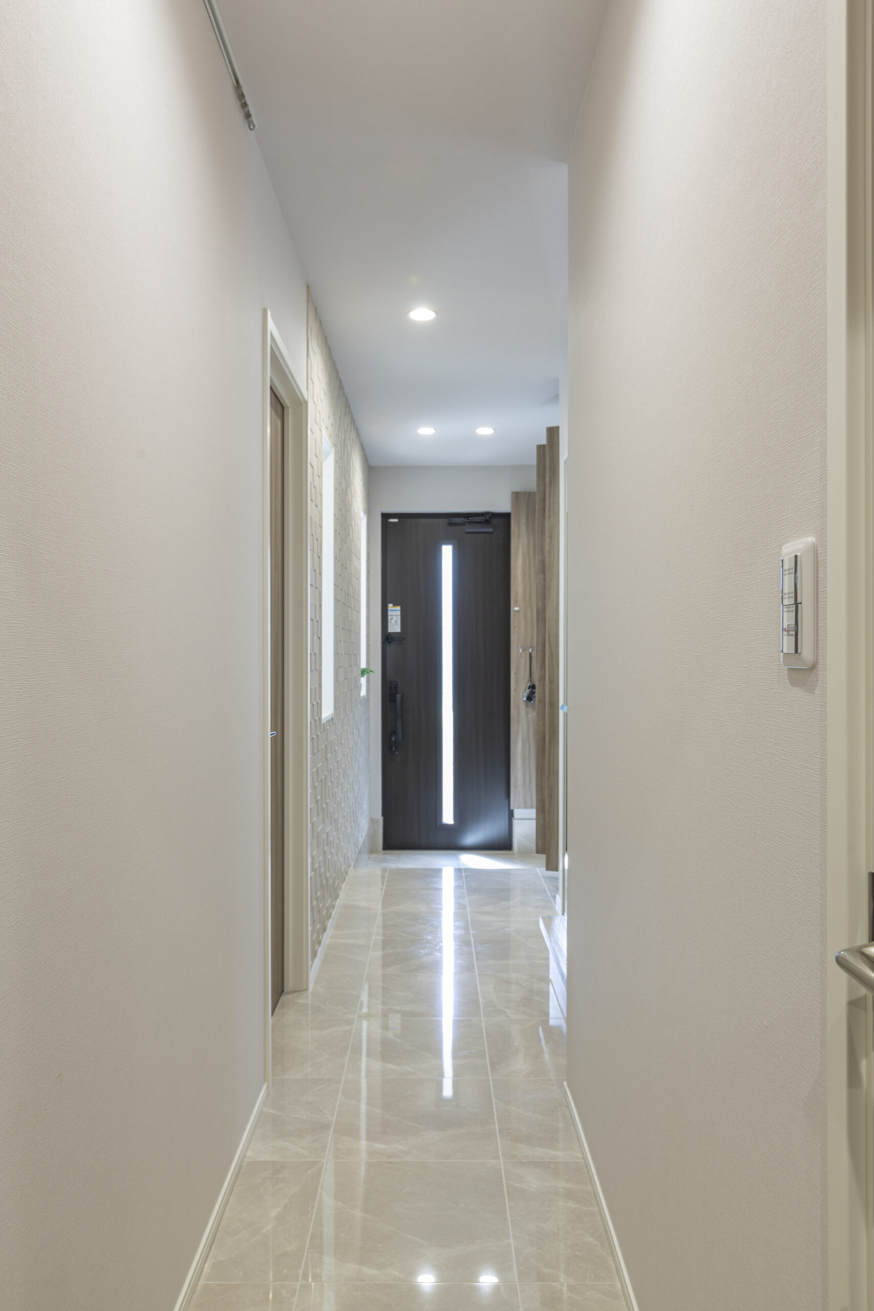 玄関ホールの壁には、LIXILエコカラットプラス「ペトラスクエア(ライトグレー)」をアクセントとして採用。