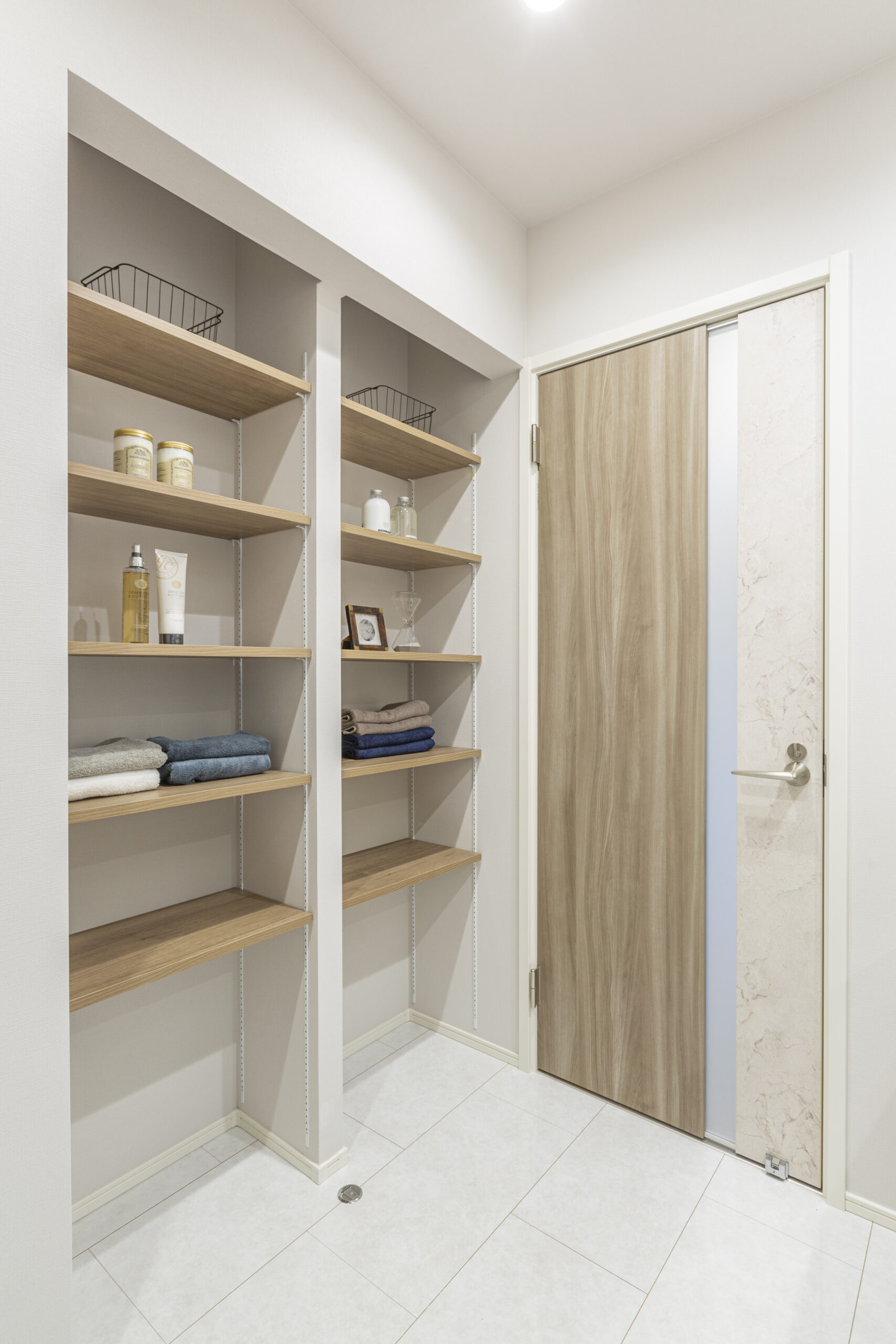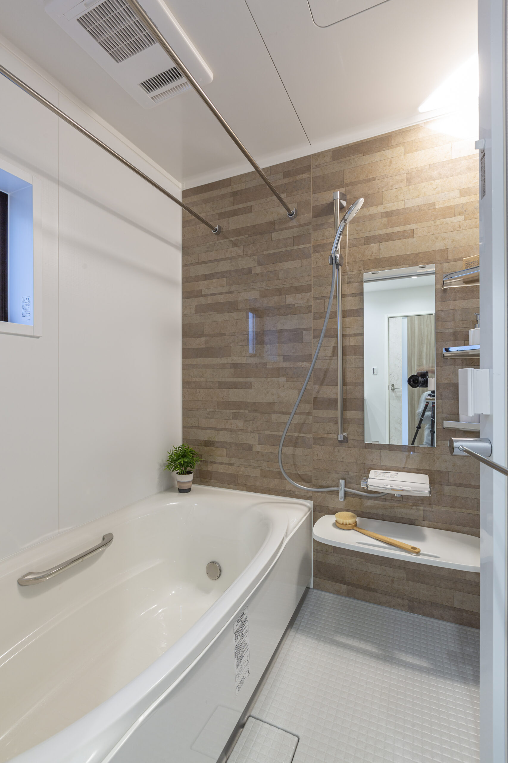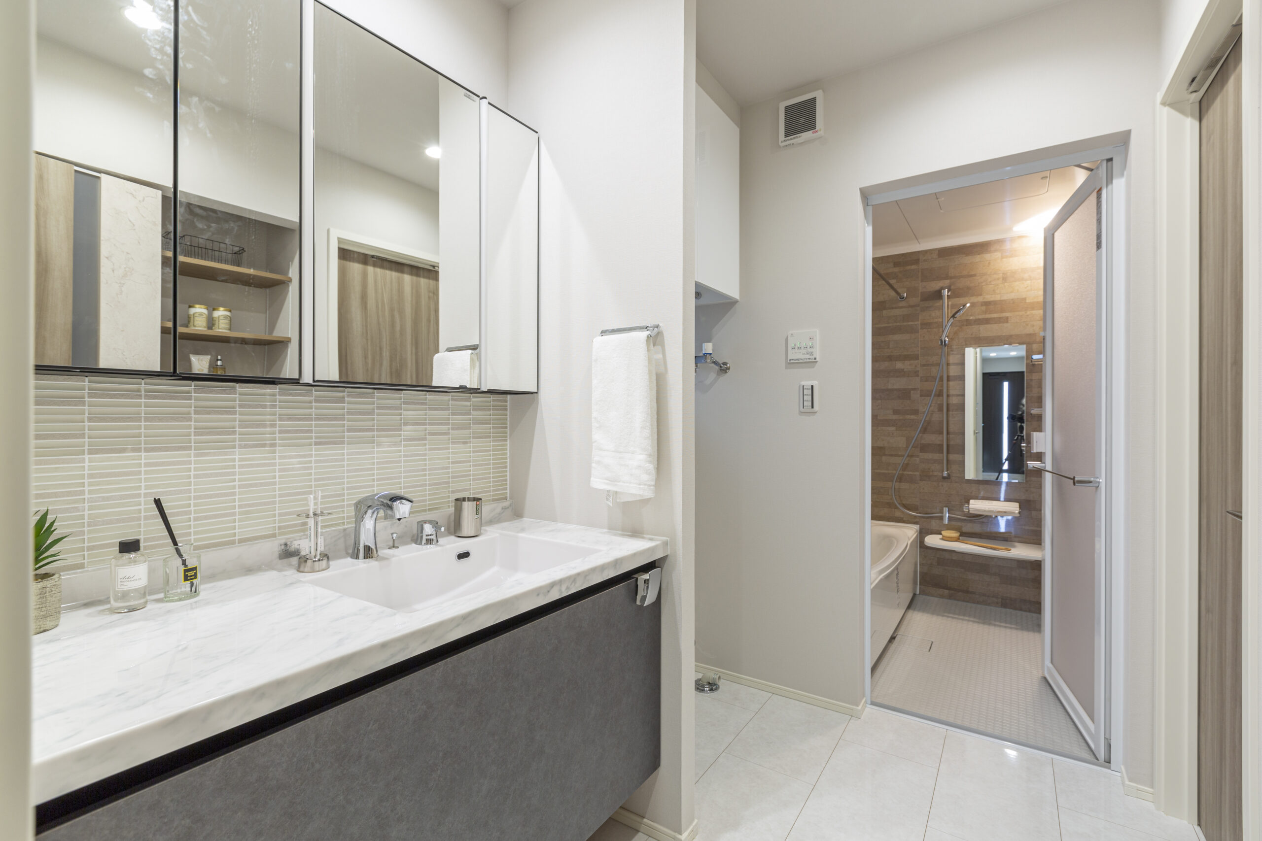 浴室は木目を再現した壁パネルを採用し、浴室内までに木のぬくもりを感じるような内装に仕上がっています。洗面台では、洗面ボウル横にスペースを取ったり、リネン庫を確保したりなど、機能性も重視しています。