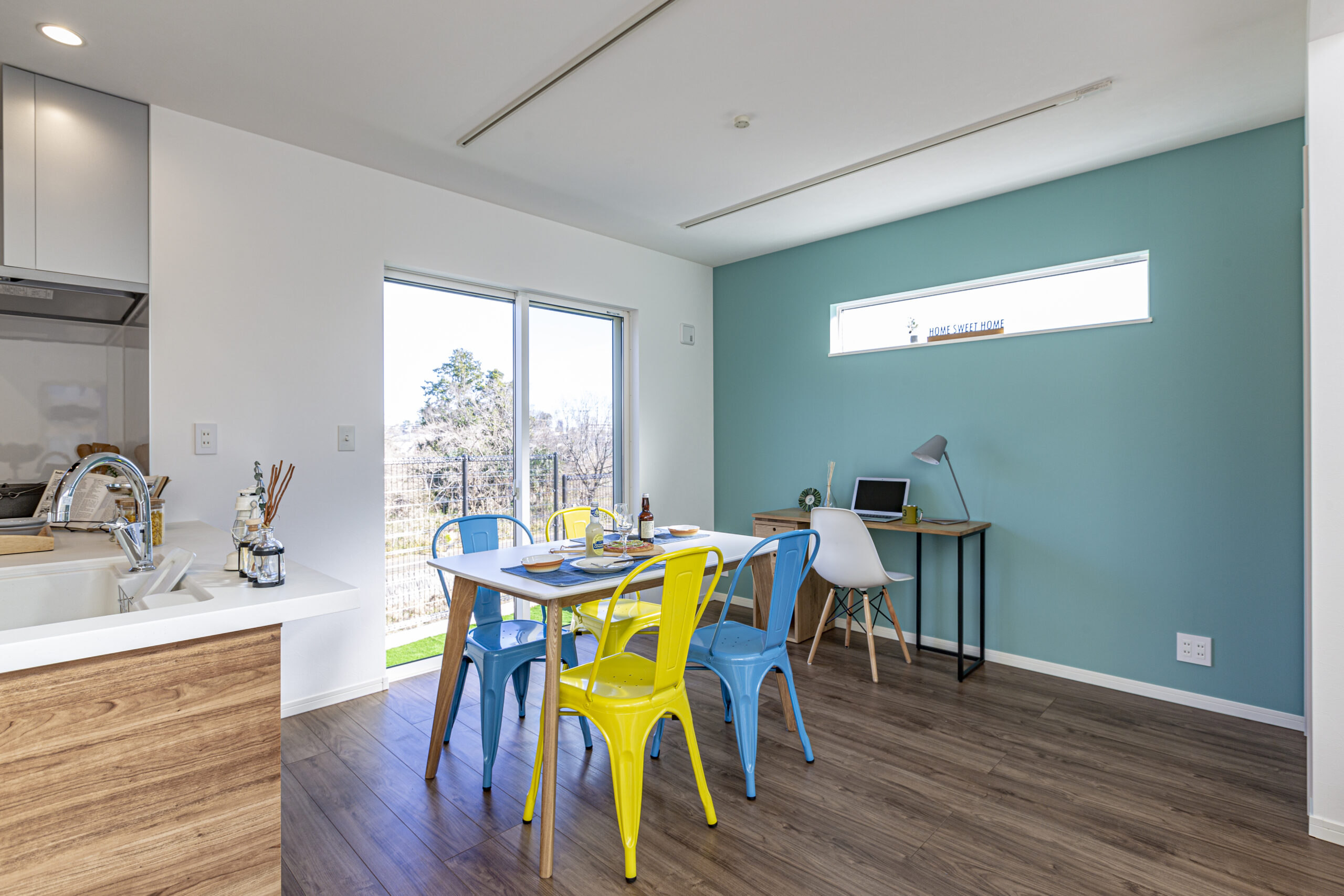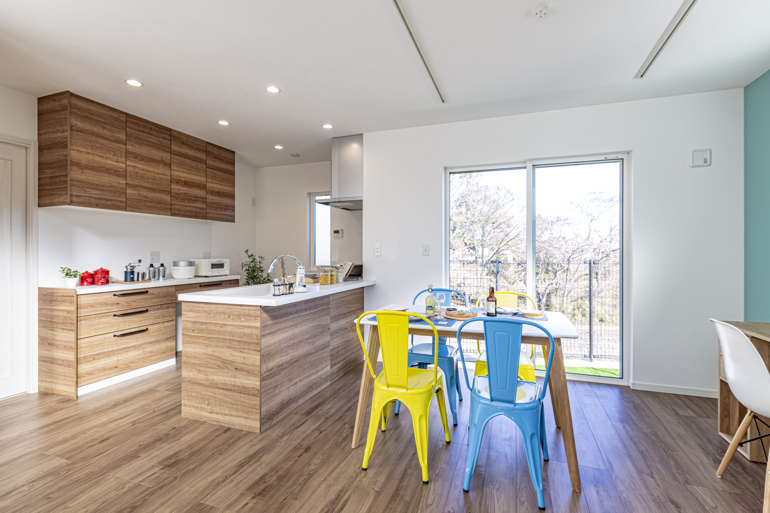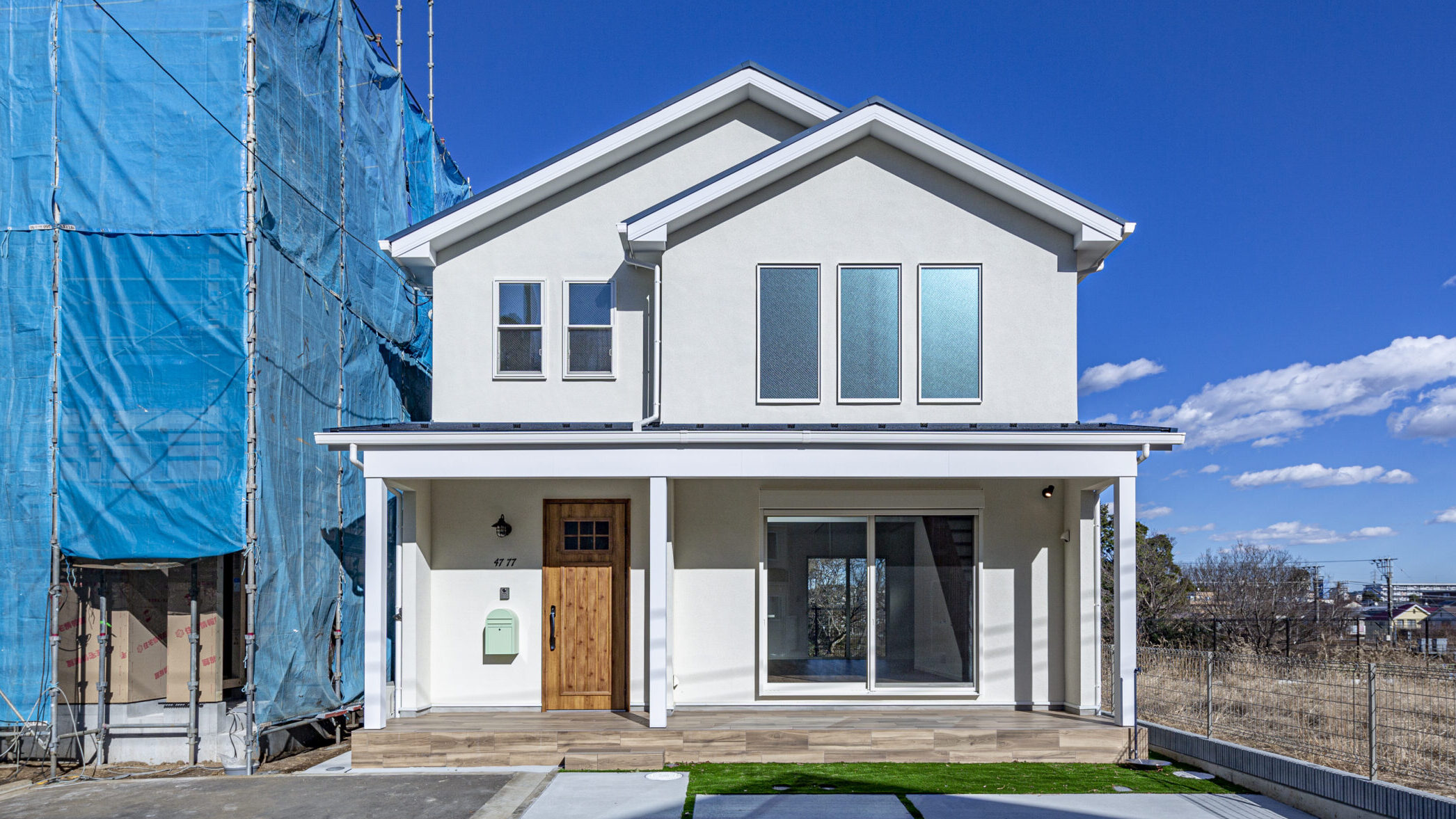 玄関前のポーチとリビングのテラスを一体化させることで、建物全体が横にぐっと広く見える外観デザインに。ひとつながりのスペースが生まれたことで、インテリアやガーデンコーディネートをより楽しめる空間になりました。