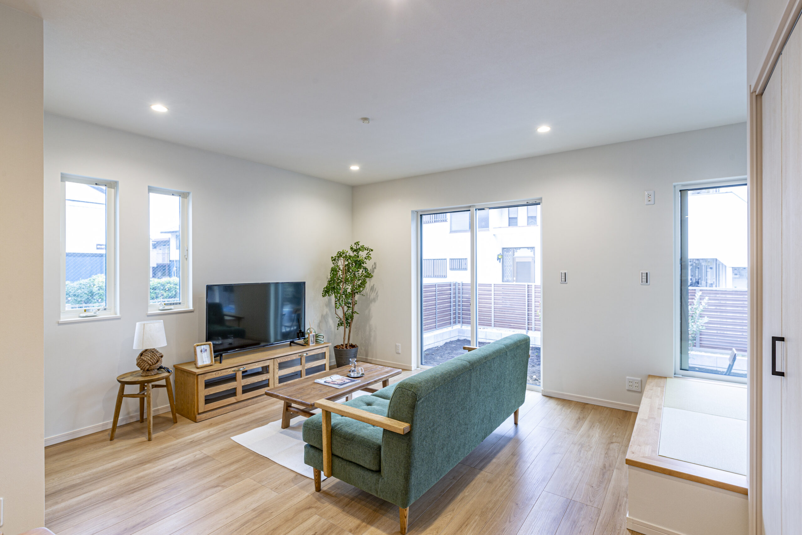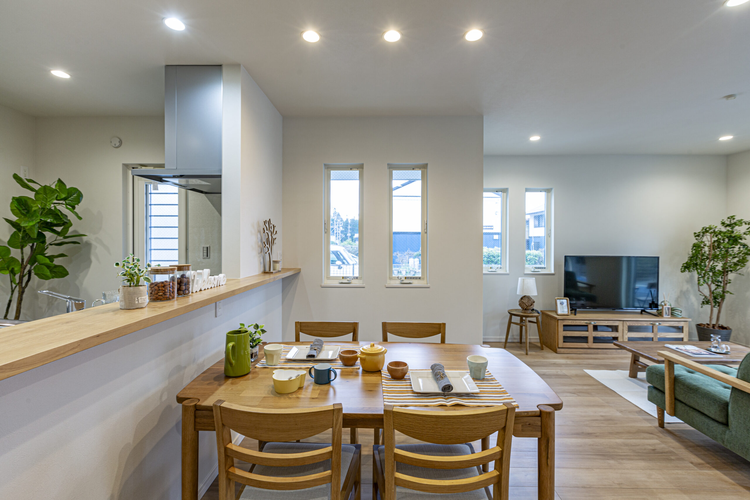 • テラススペースと庭を設けた外構がリビングからもダイニングからも見えるので、奥行きがある広さを感じるリビング&ダイニングとなっています。