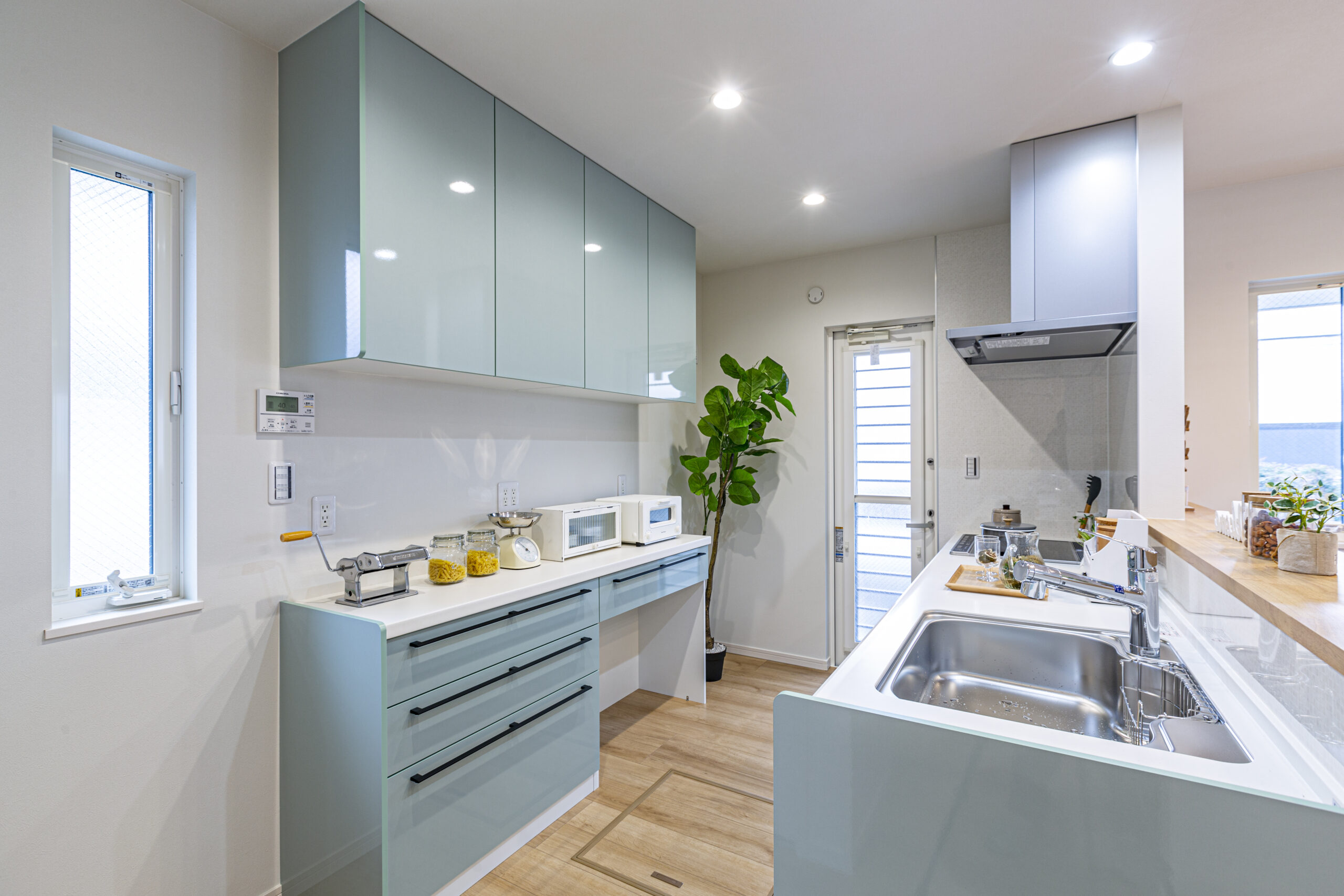 爽やかなカラーでまとめたキッチンは、広めの収納スペースとたっぷりの作業スペースを備え、毎日の料理が快適に。