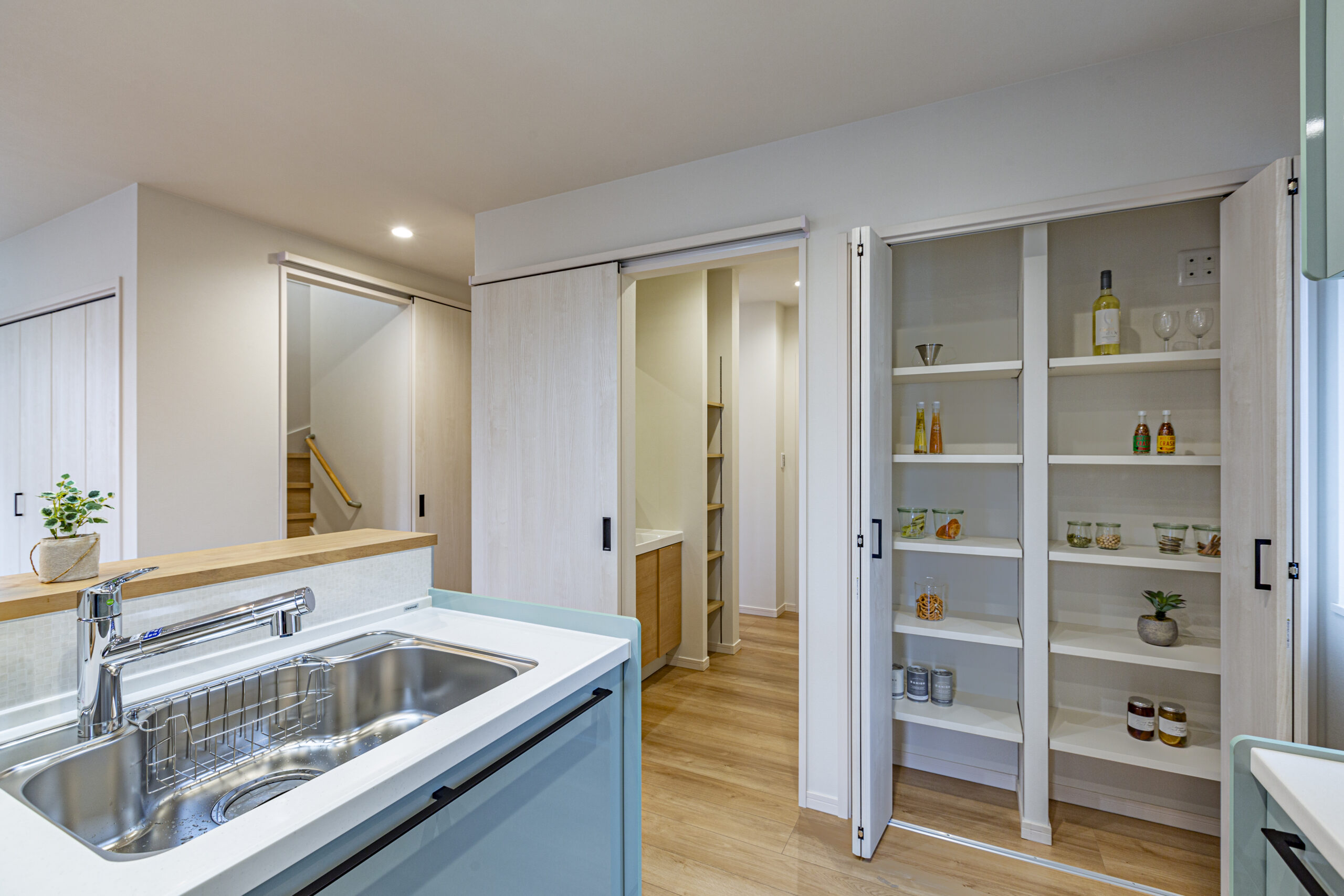 キッチン横にはパントリーを配置し、洗面・浴室へも一直線でつながるスムーズな家事動線となっています。
