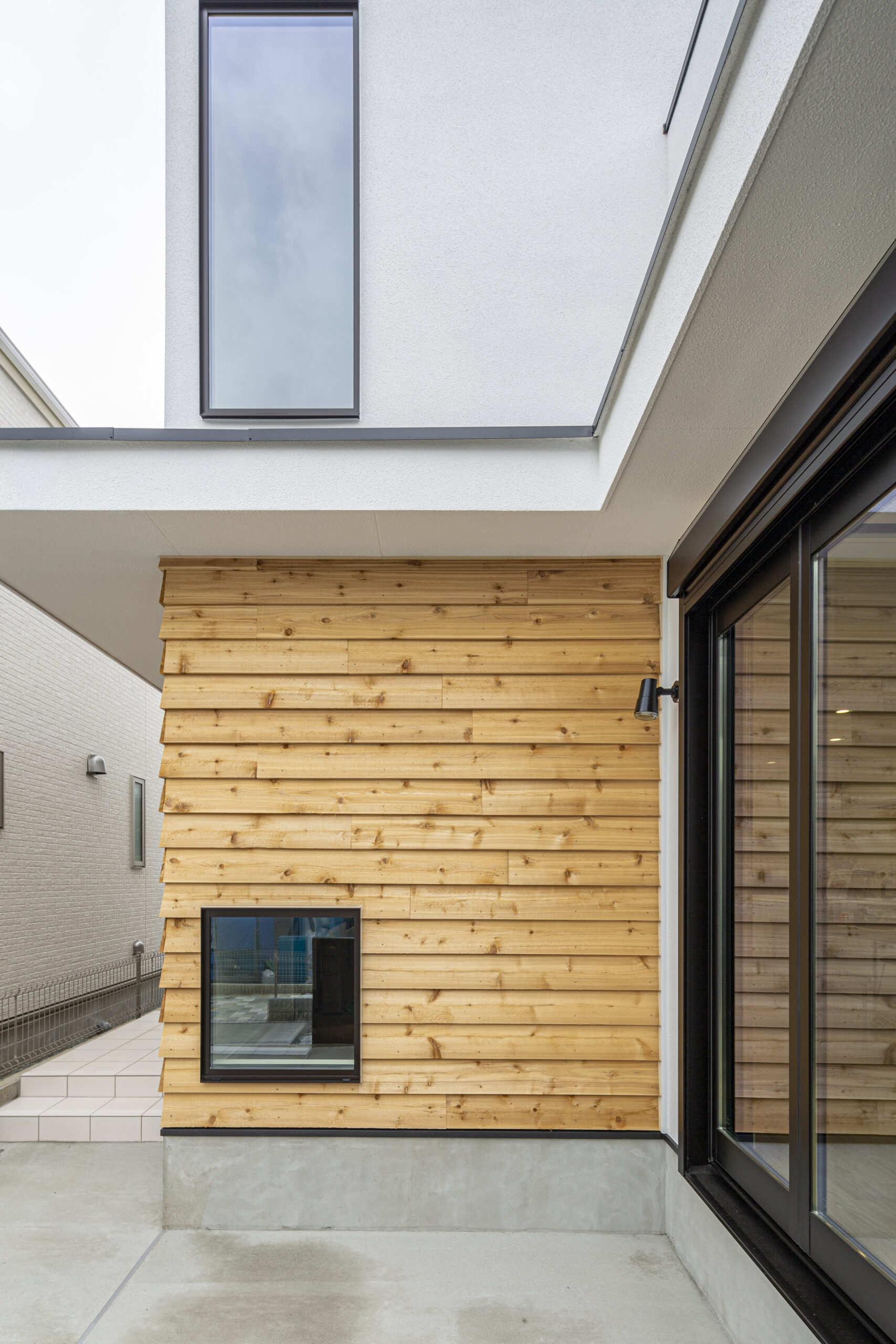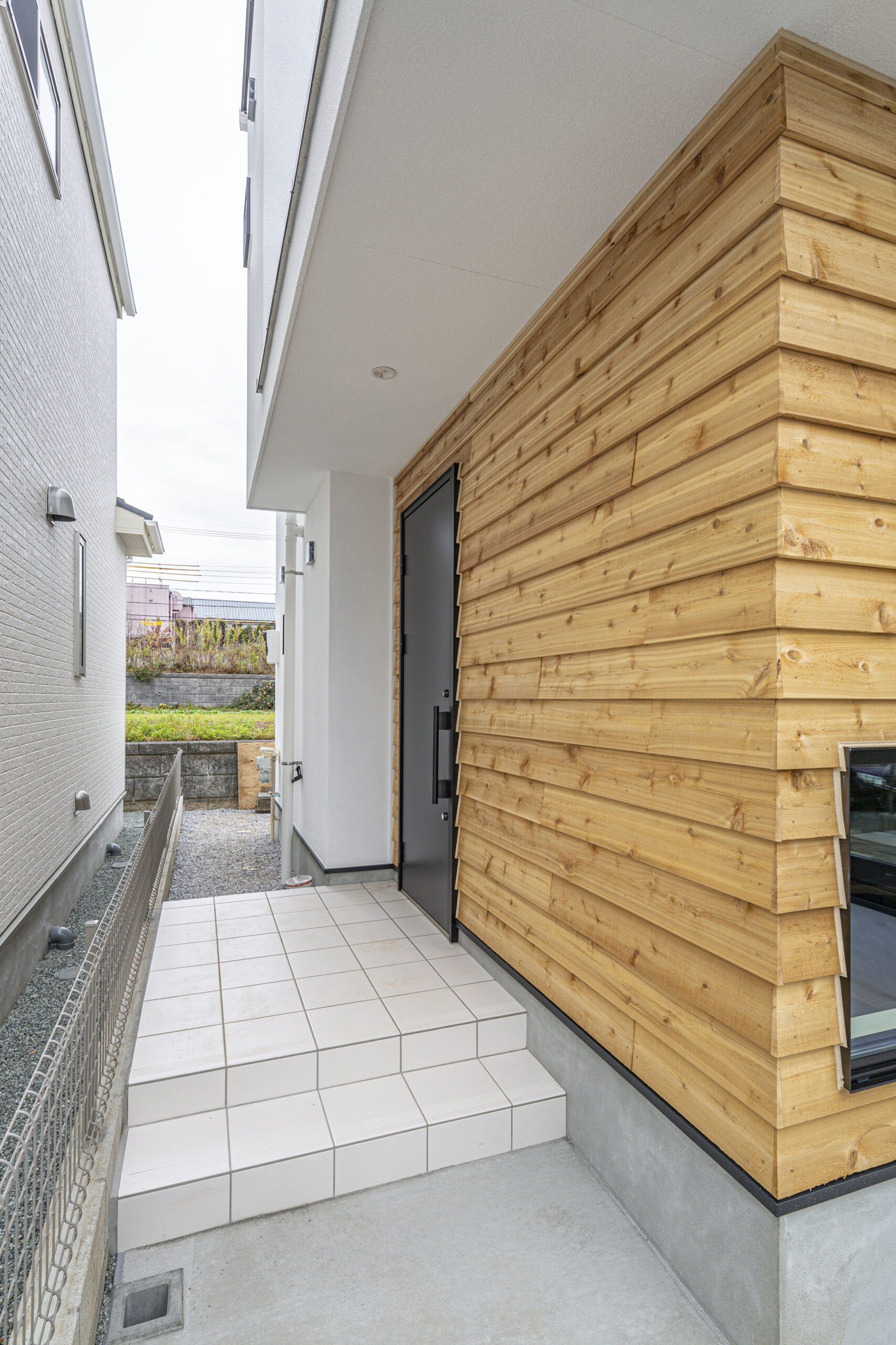 • 内装のテーマとなっている“白×木×黒”が外装にも統一されており、特に木質特有の重厚感がある外壁アクセントがポイントとなっています。