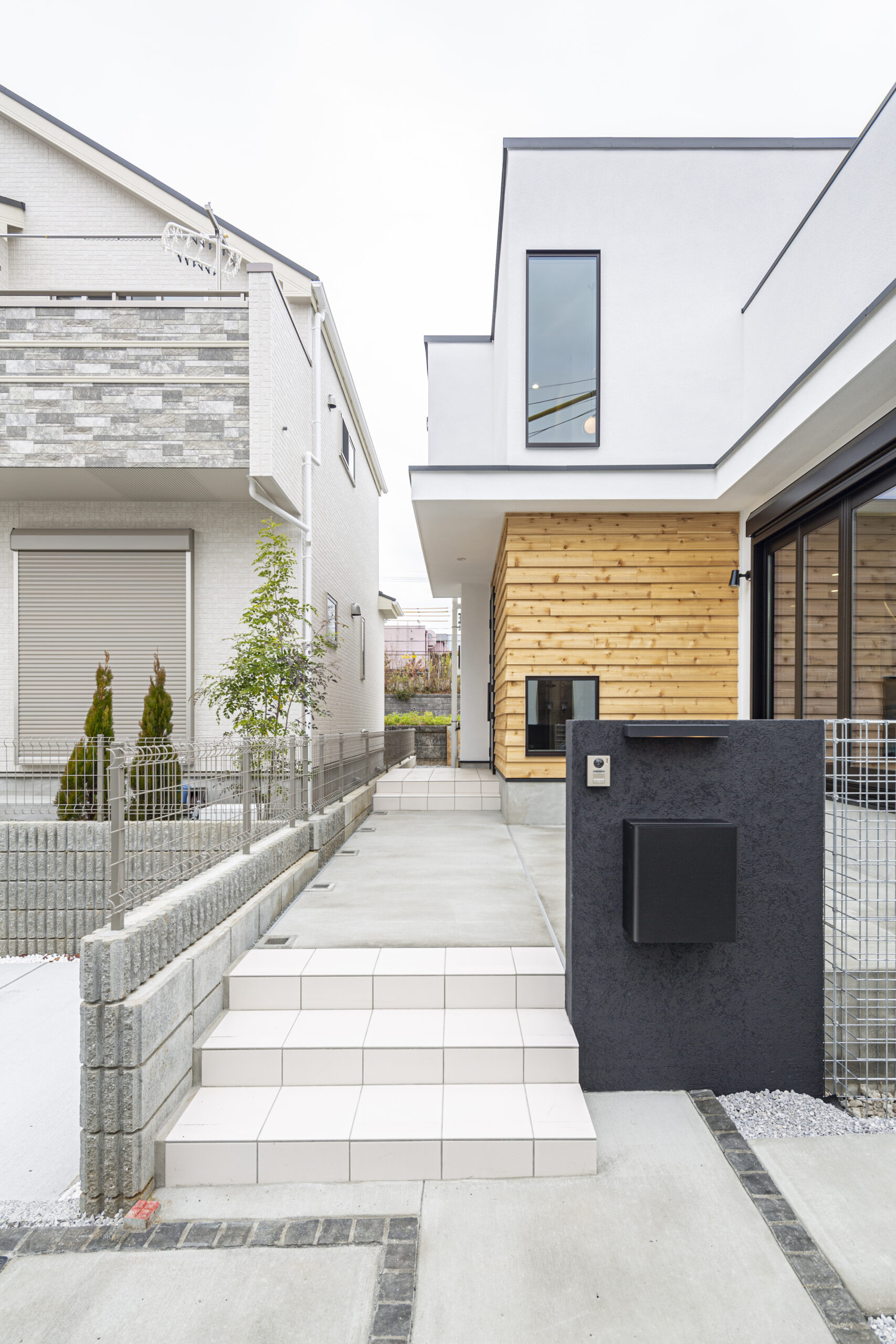 長方形の土地に直線的な外観デザインを合わせながらも、外壁に凹凸をつくることで、S様邸ならではの個性が際立つファサードに。