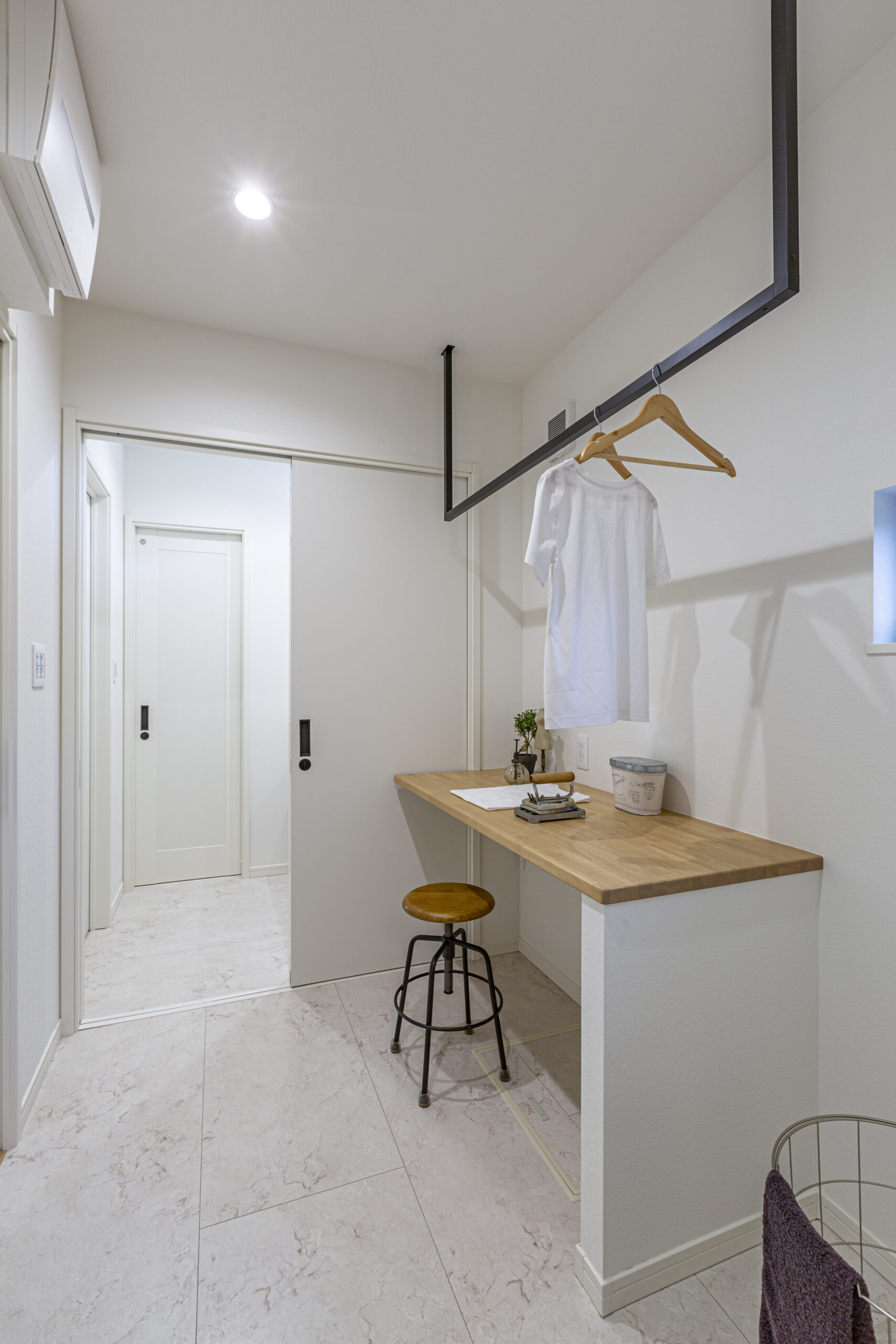 • ランドリースペースは、横長のカウンターで作業しやすいスペースを広々と確保。天井付けの物干し金物は黒を採用し、“白×木×黒”のテーマにマッチした仕様です。