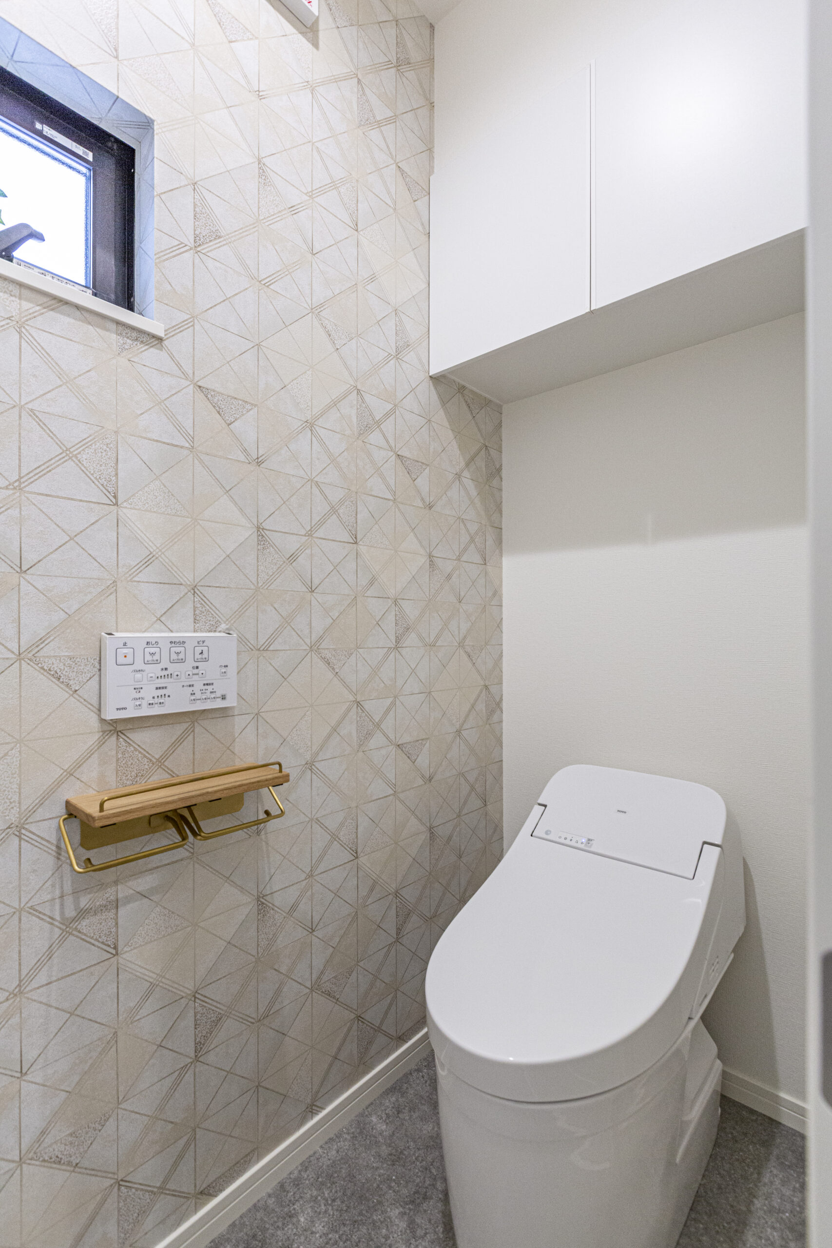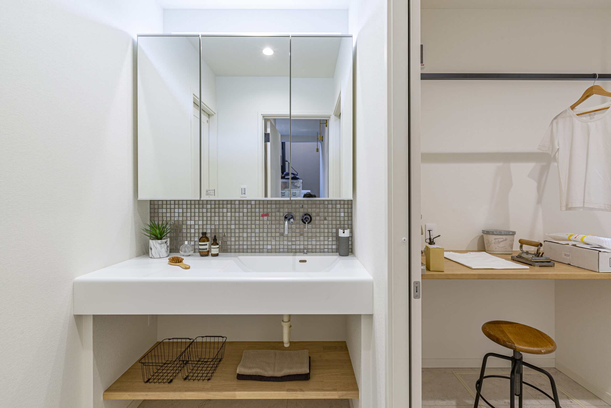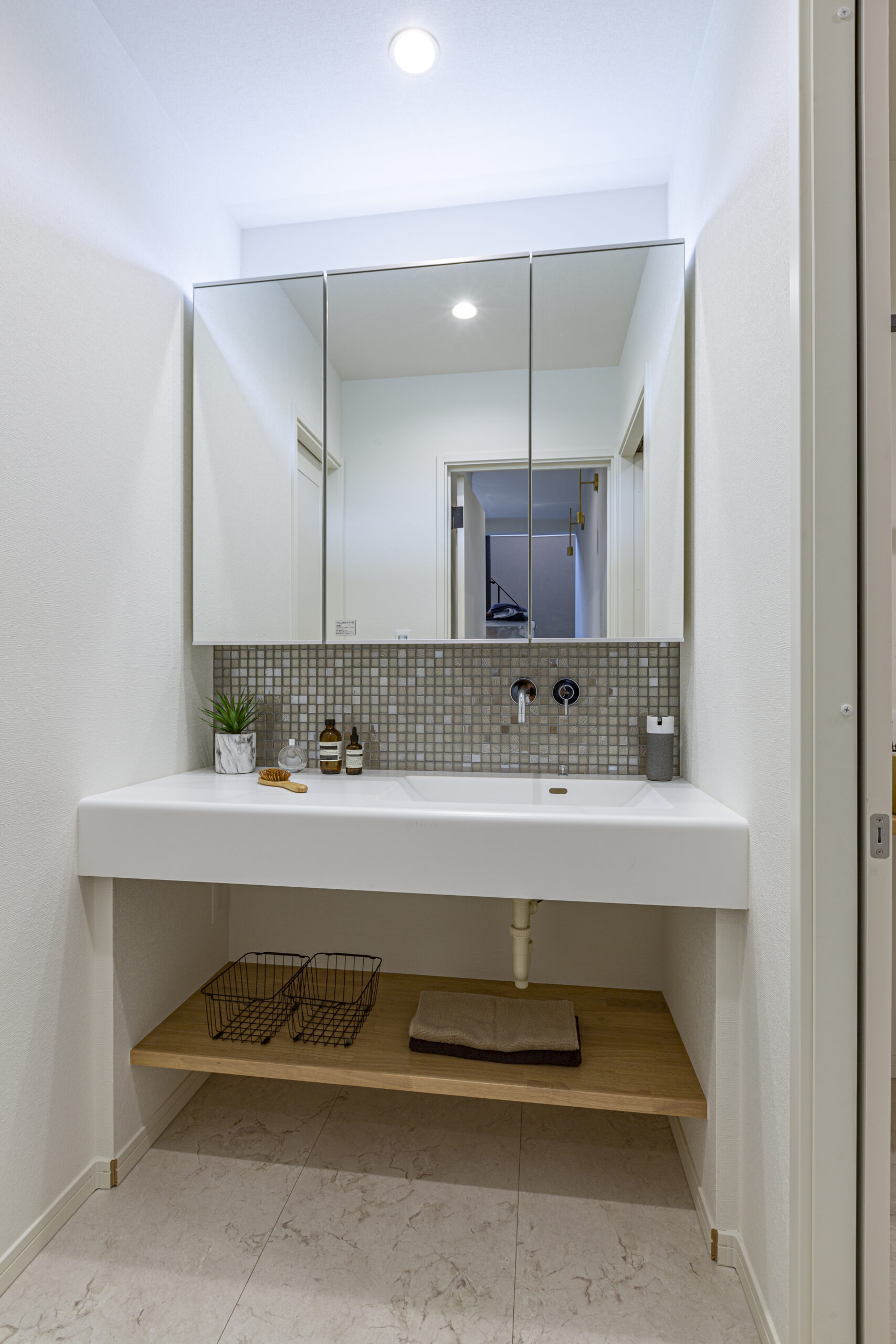 • 洗面台は、名古屋モザイクのモザイクタイル べラルーチェACB-R7010 目地グレーを使用しており、主張しすぎることなく、一味違う造作洗面台となっています。