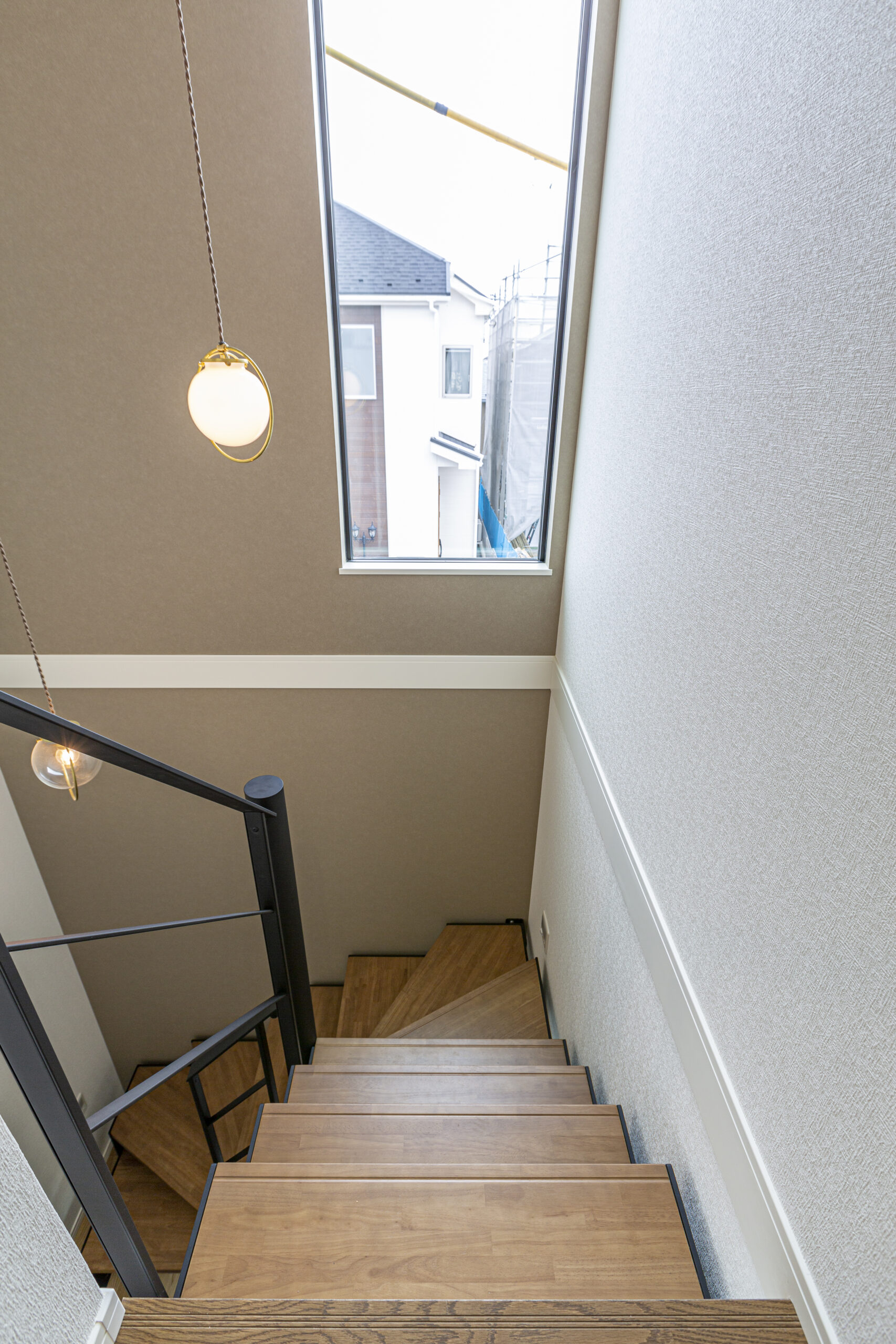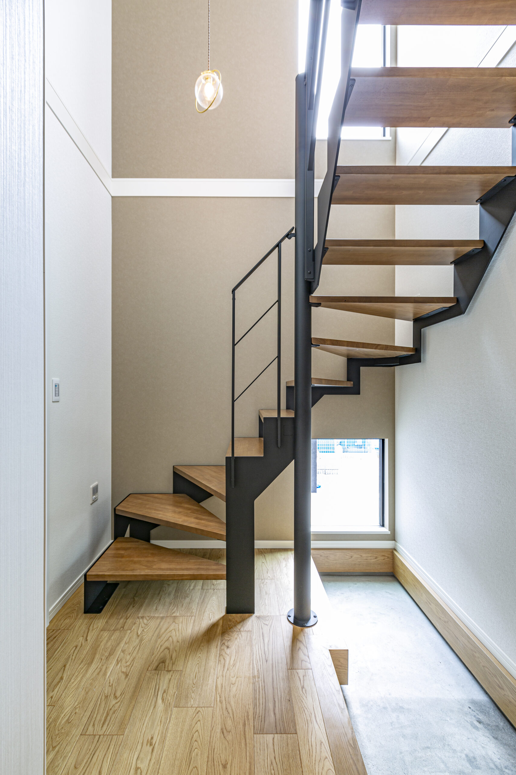 直線の多い空間に、階段の曲線的な動きが加わり、内装の個性をより引き立てています。