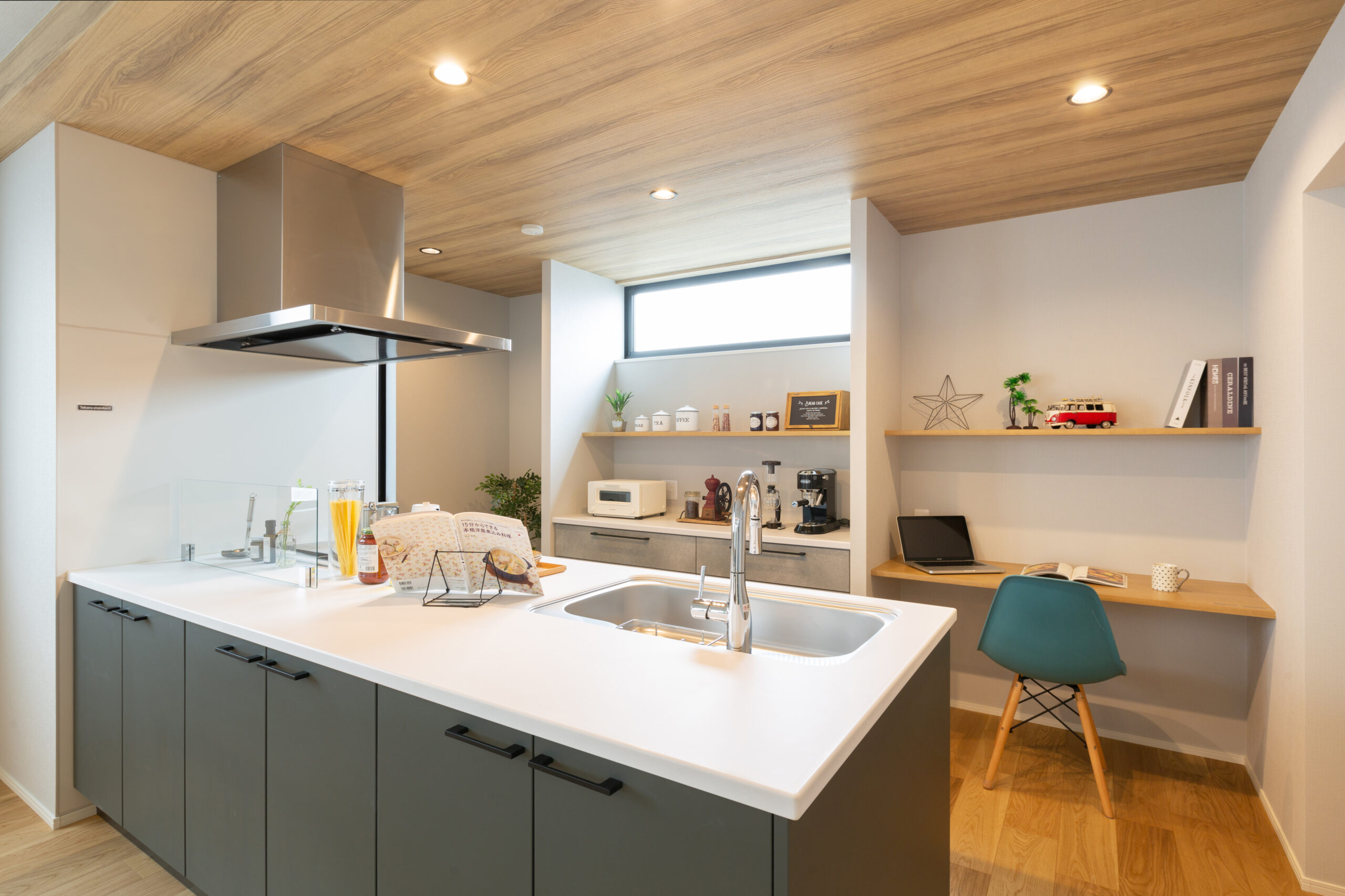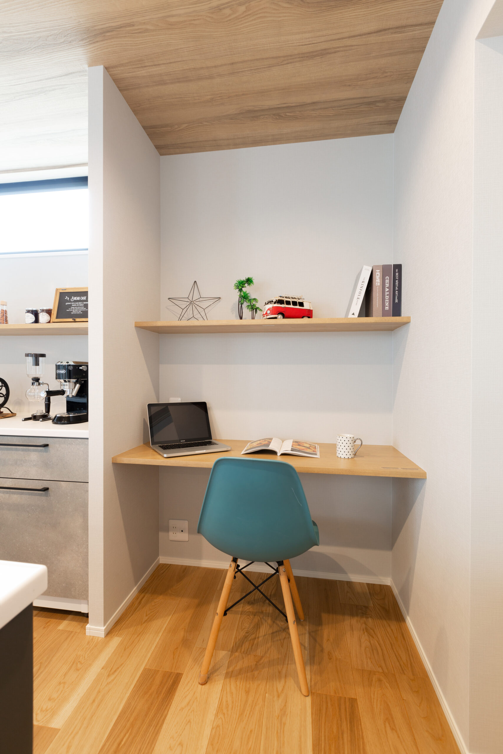 ワークスペースをキッチン横に設けさせていただき、子供が勉強をするスペースとして使っていただくと、キッチンで作業をしていても、すぐに確認することが出来ますし、勉強で使用していないときには、家事の合間の休憩に使用して頂けるように設置させていただきました。