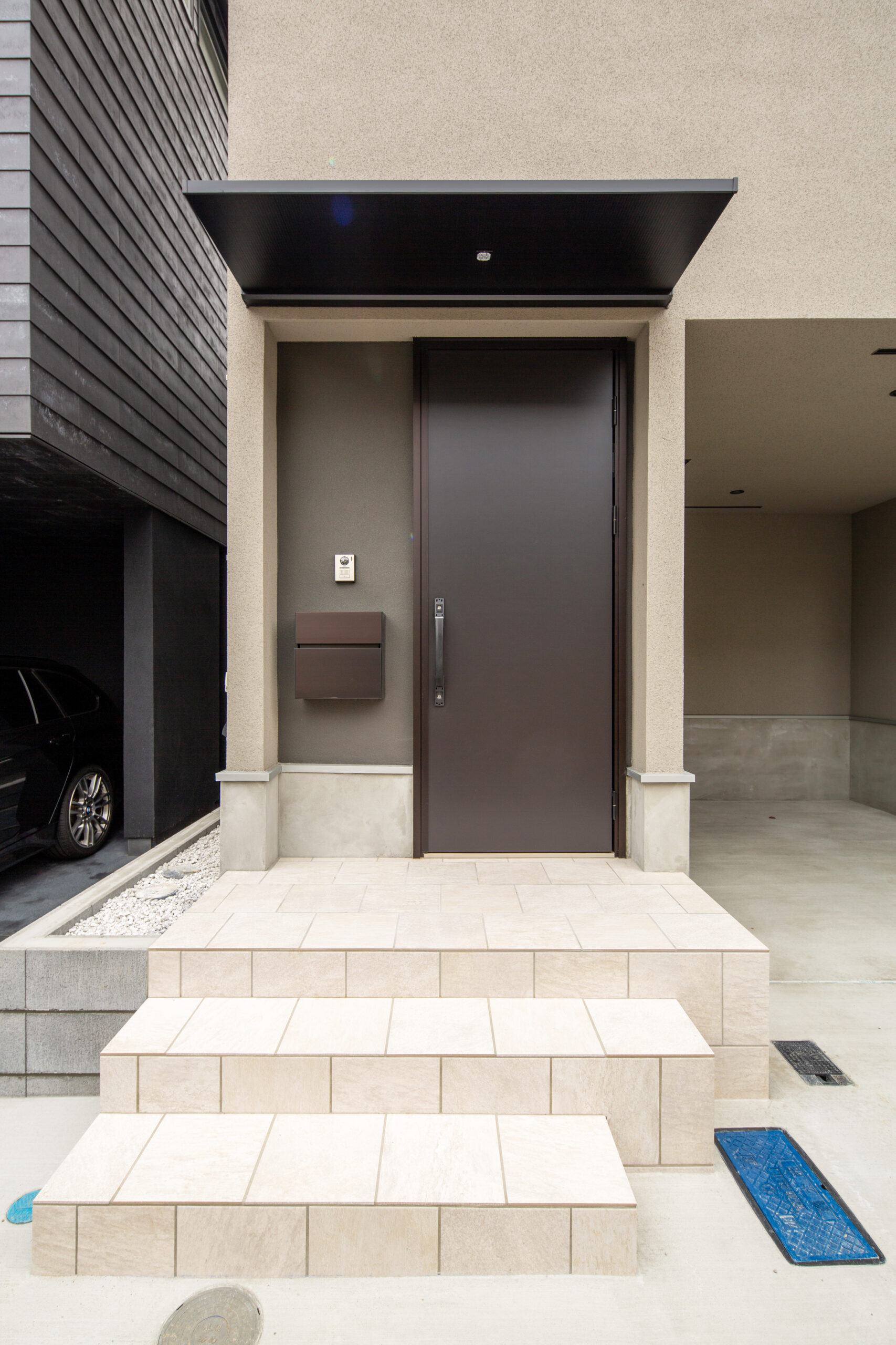 玄関ポーチからは落ち着いた雰囲気のある色味でまとめてあり、家に入ってすぐの廊下の足元に大きく窓を設けてありますので、とても明るい印象の玄関になっております。