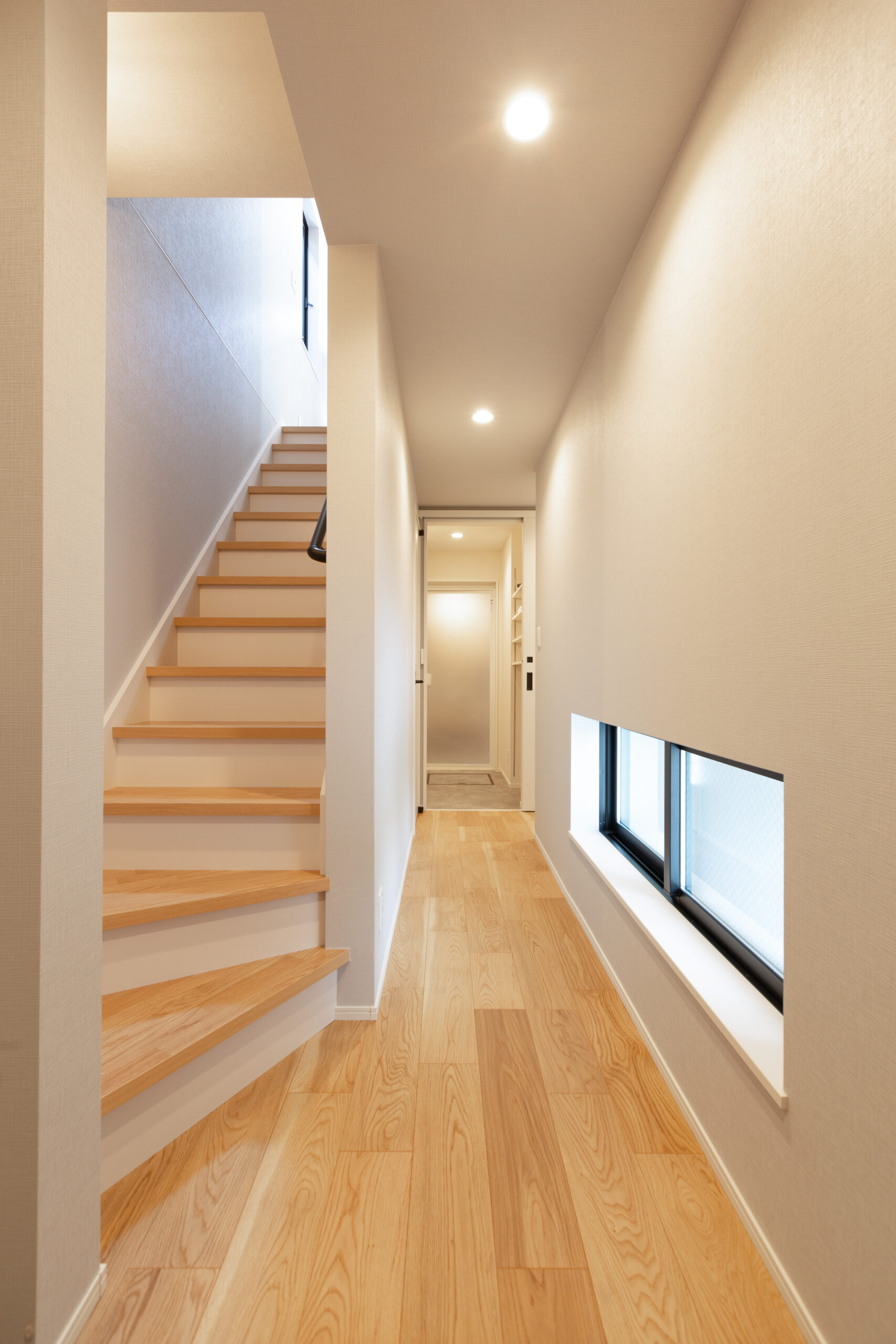 玄関ポーチは落ち着いたトーンでまとめ、家に入ってすぐの廊下には足元に大きな窓を配置。自然光が差し込むことで、玄関全体が明るく爽やかな印象に仕上がっています。