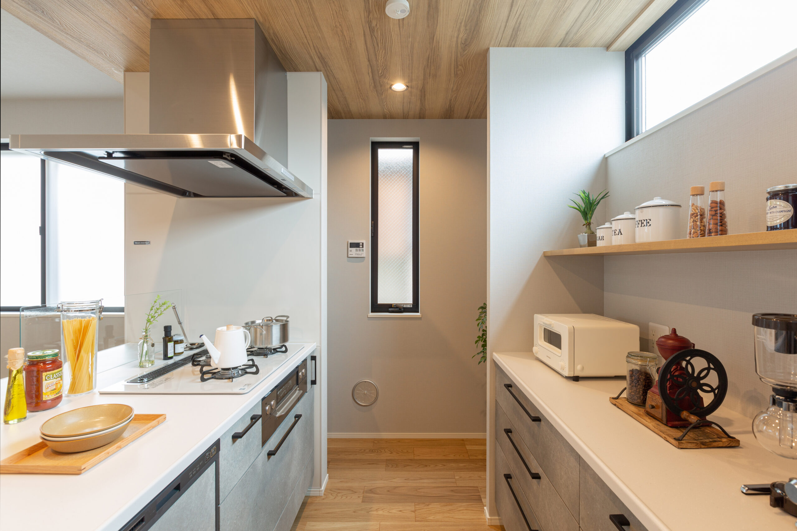 カップボードは、下部の収納のみ既製の物を使用しており上部には造作棚で見せる収納にしました。 その上には横長の窓を設置しておりますので、とても明るいキッチンになっております。 他にもキッチン正面から冷蔵庫やパントリーが見えないように配慮するなど、店舗設計をされているご主人のセンスが光る空間です。