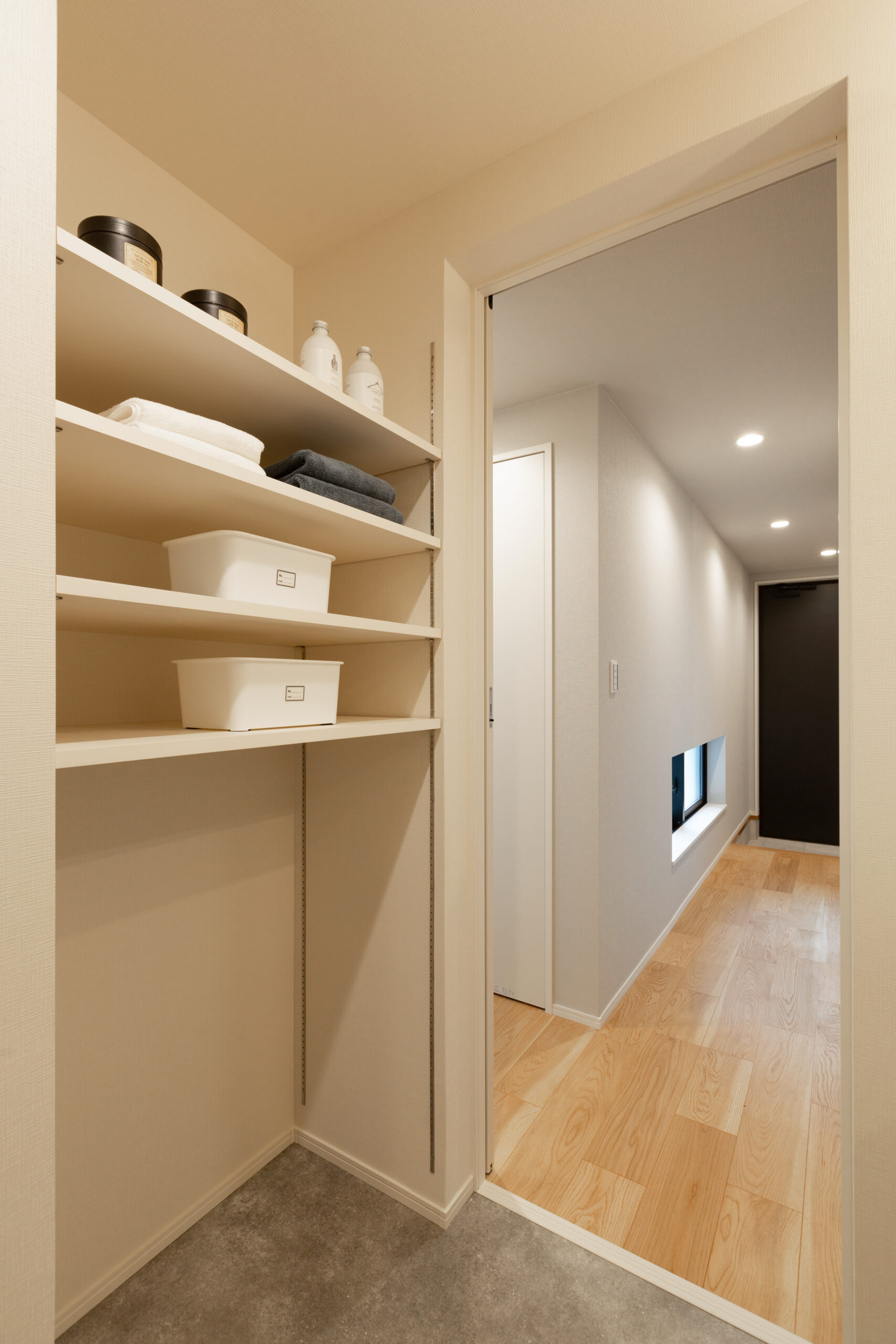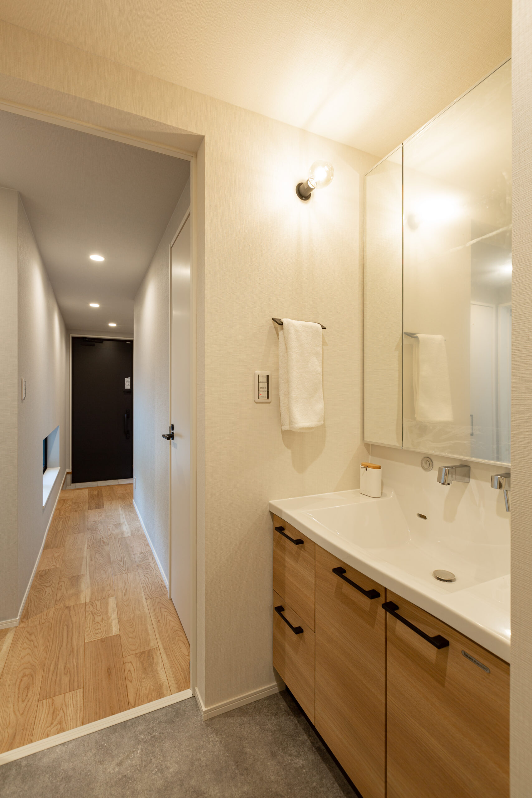 洗面化粧台は、幅が900mmの洗面化粧台で収納量としては、下部には観音開きの大きな収納の横に、スライドの棚がついているものになっています。 洗面化粧台の後ろに収納を設けさせていただき、洗面で使用するタオルなど、物の大きさによって高さを変えられる可動棚で収納をつくってあります。