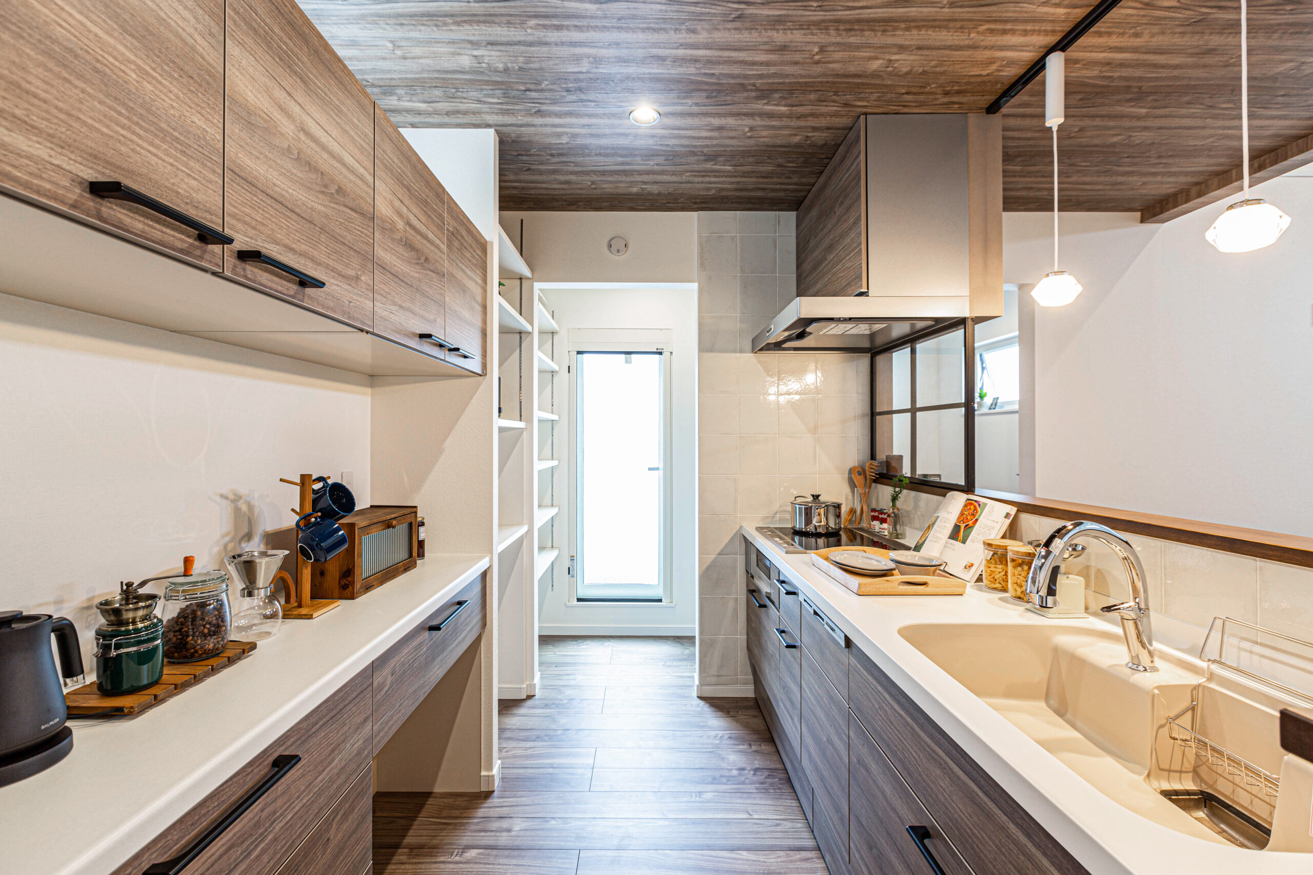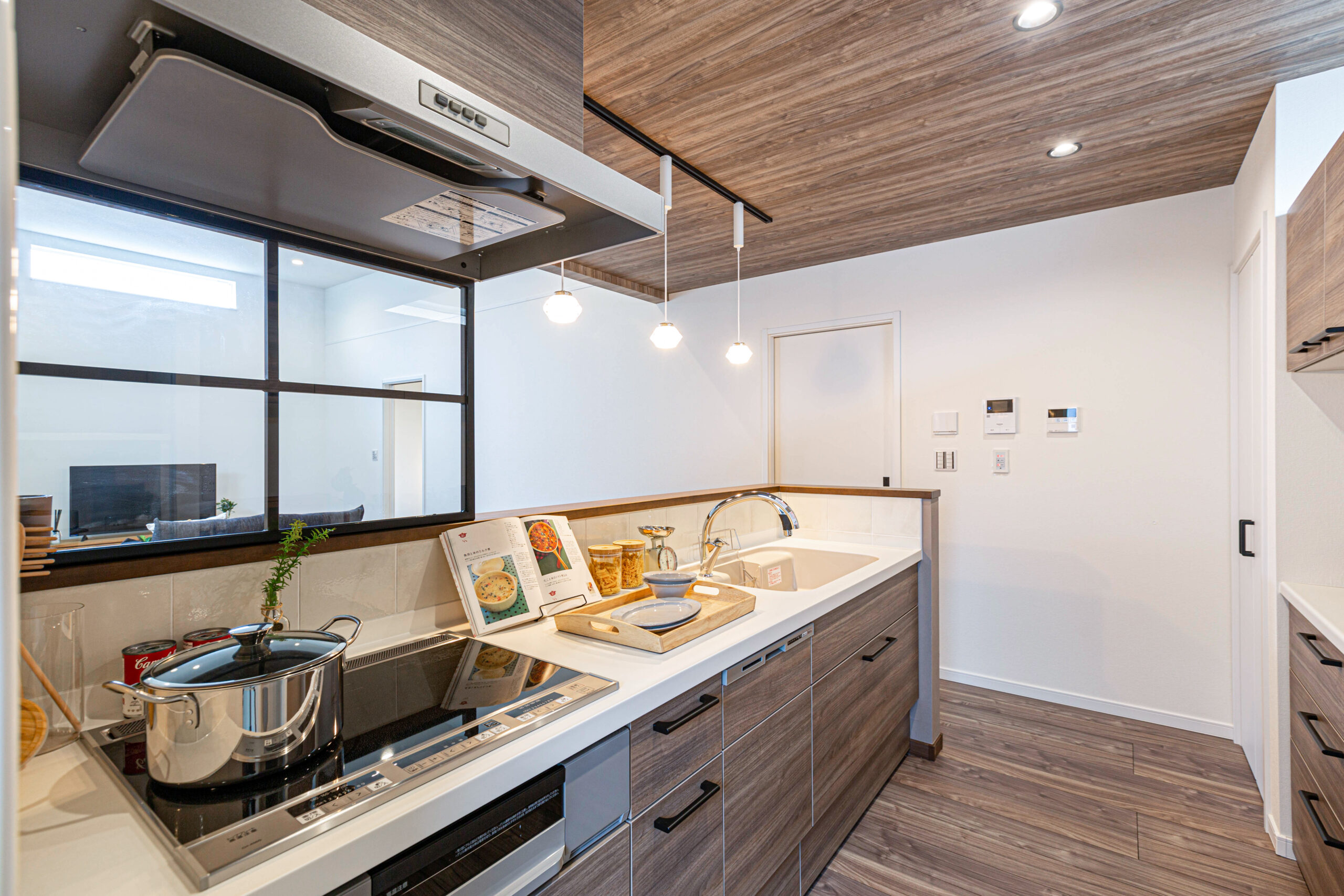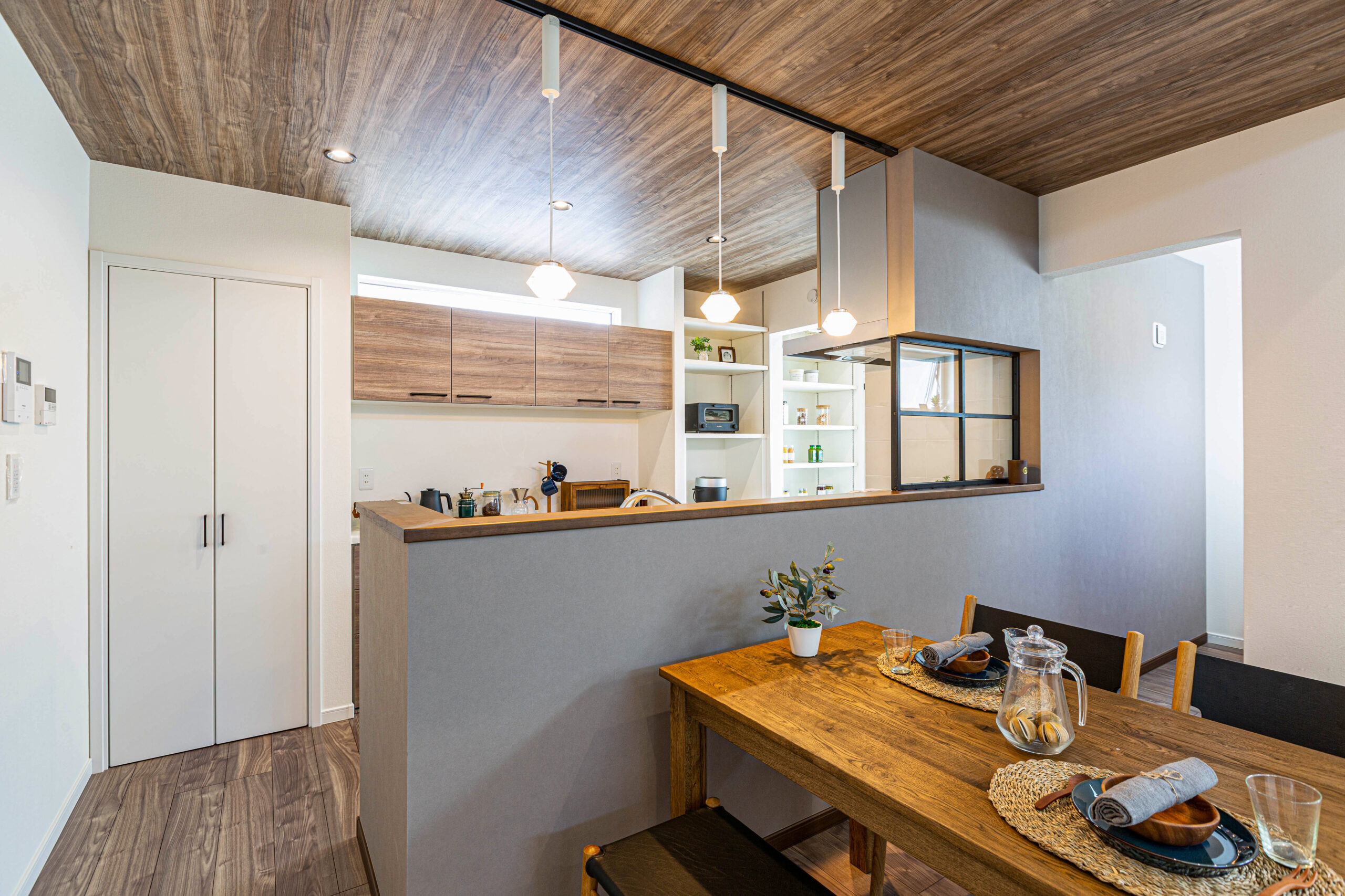 • ダイニング、キッチン部は、天井高が2.4mになっており、床材の色味に合わせて木目のクロスを天井にアクセントとして採用し、統一感のあるオシャレな空間になっております。