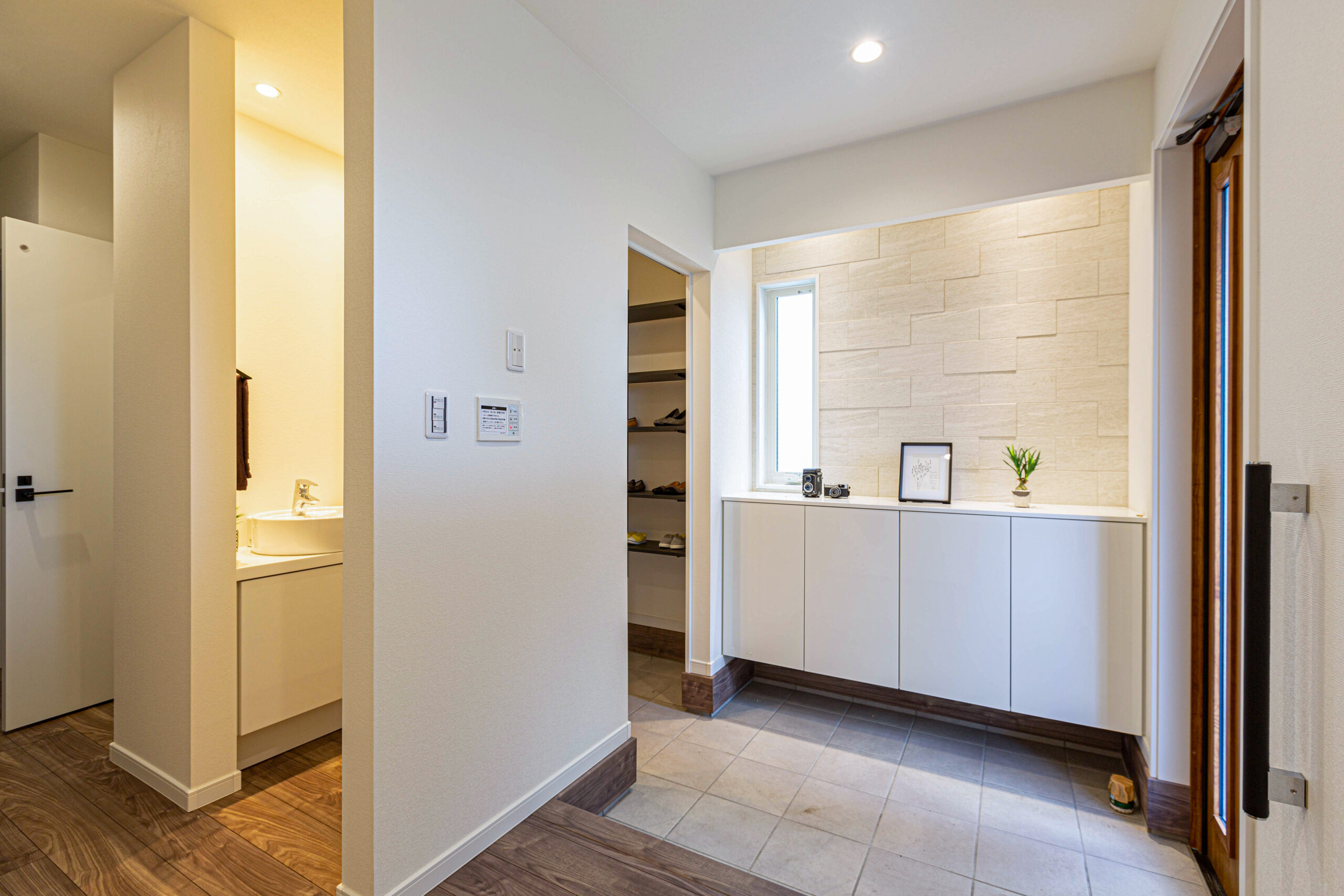 収納はカウンター収納に加え、通り抜けのできるシューズスルークロークを採用し、靴や上着をたっぷり収められる快適な玄関にしています。
