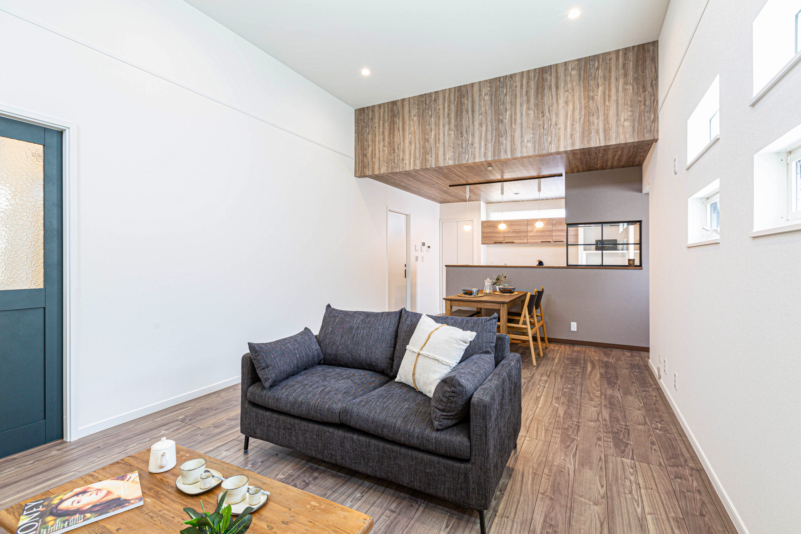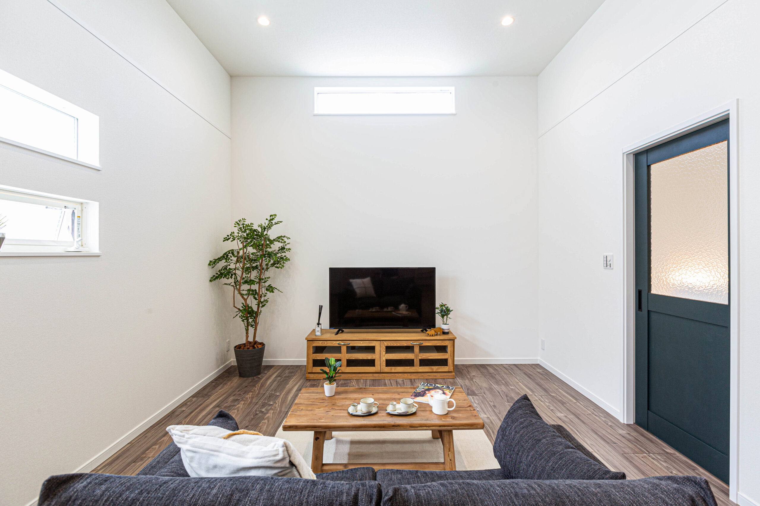 • リビング部は天井の高さが3mあります。天井付近には横長のFIX窓を設置し、高い位置から明かりを取り入れることで、明るく開放的なリビングに!