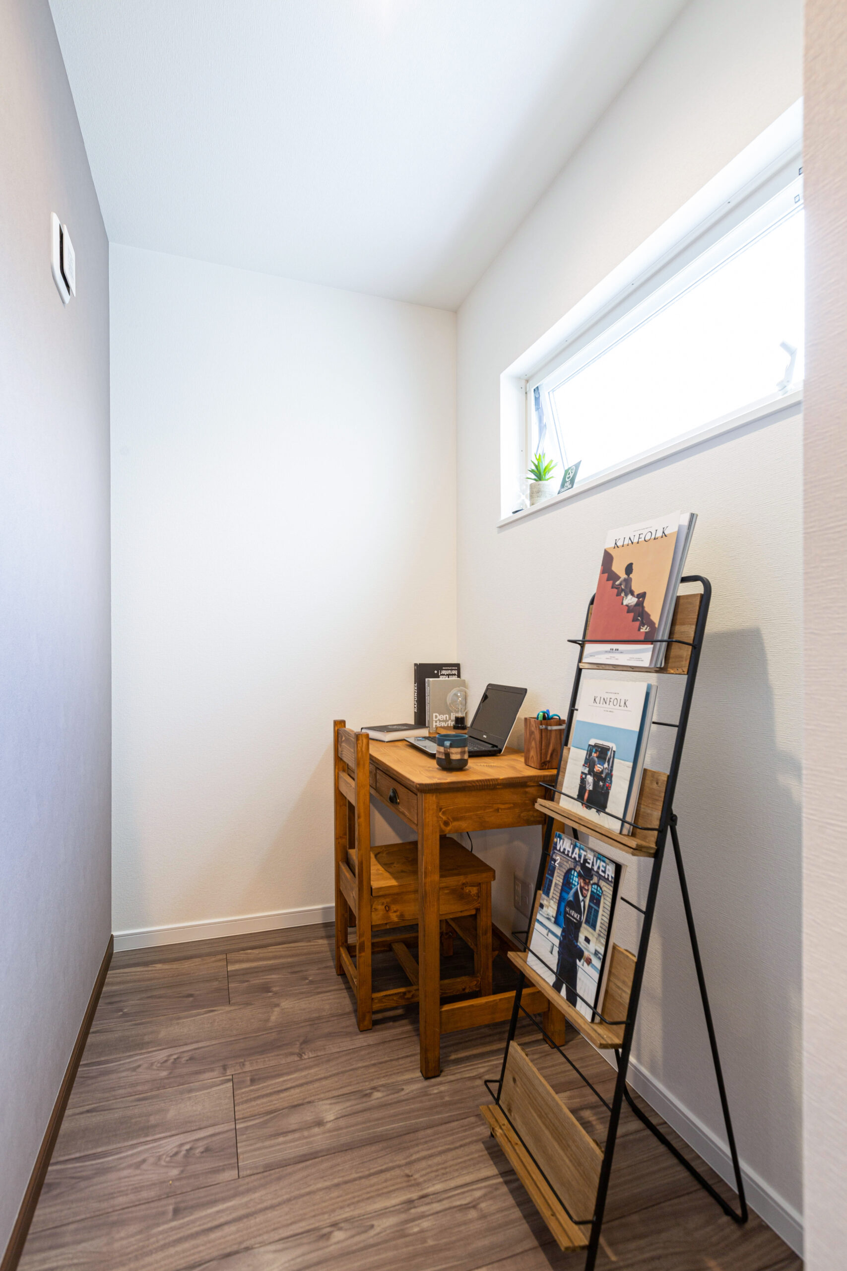 • ワークスペースもリビングの隣に設置するプランをご提案いたしました。オンライン会議を行う際も、背面はアクセントクロスになっているので、背面の生活感や物などを気にせずオンライン会議に臨めます。