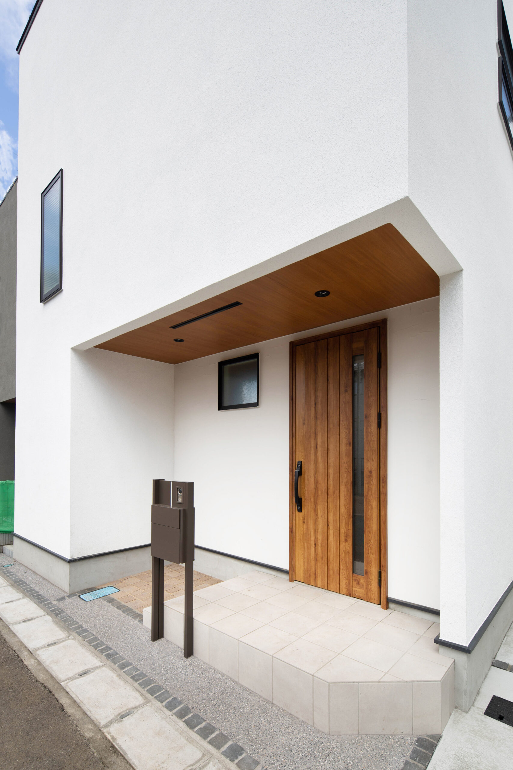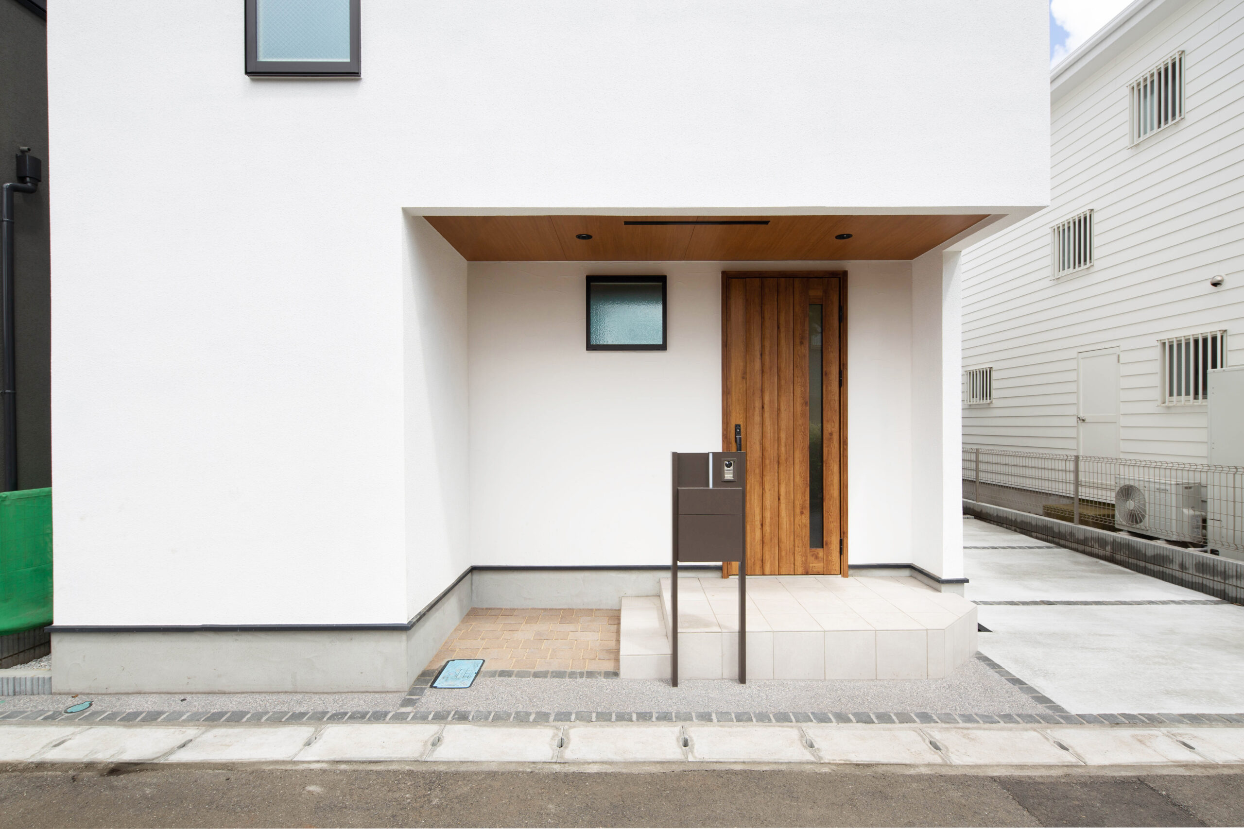外観は吹き付けモルタル仕上げに、玄関まわりへ左官仕上げのアクセントをプラス。