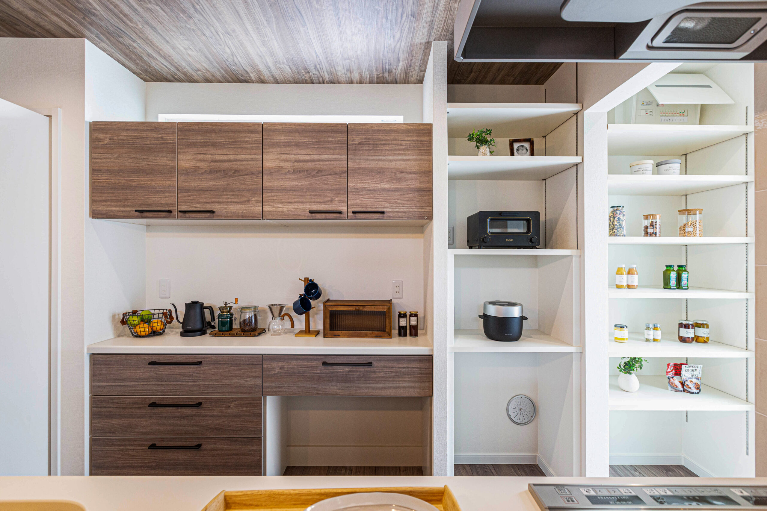 • キッチン背面には収納棚を多く設置しており、キッチン下部の収納と合わせると相当数の食器や料理器具、家電や食料のストックなど十分に収納することが出来るようになっております。