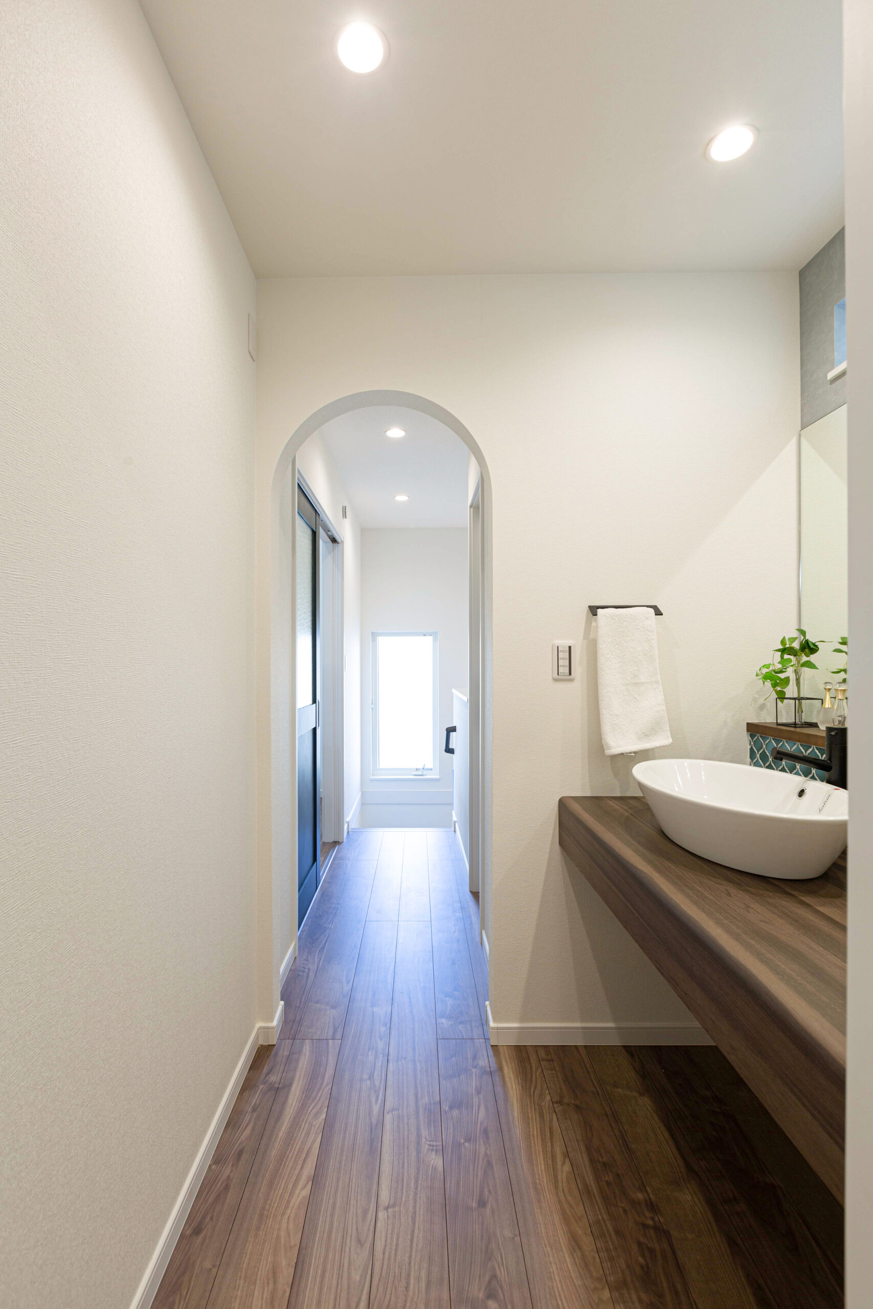 • 洗面に向かう壁の上部はR(アール)壁といって柔らかなアーチ状にしており、ドアを設置しない部分はこのように壁の上部をオシャレにすることも可能です。