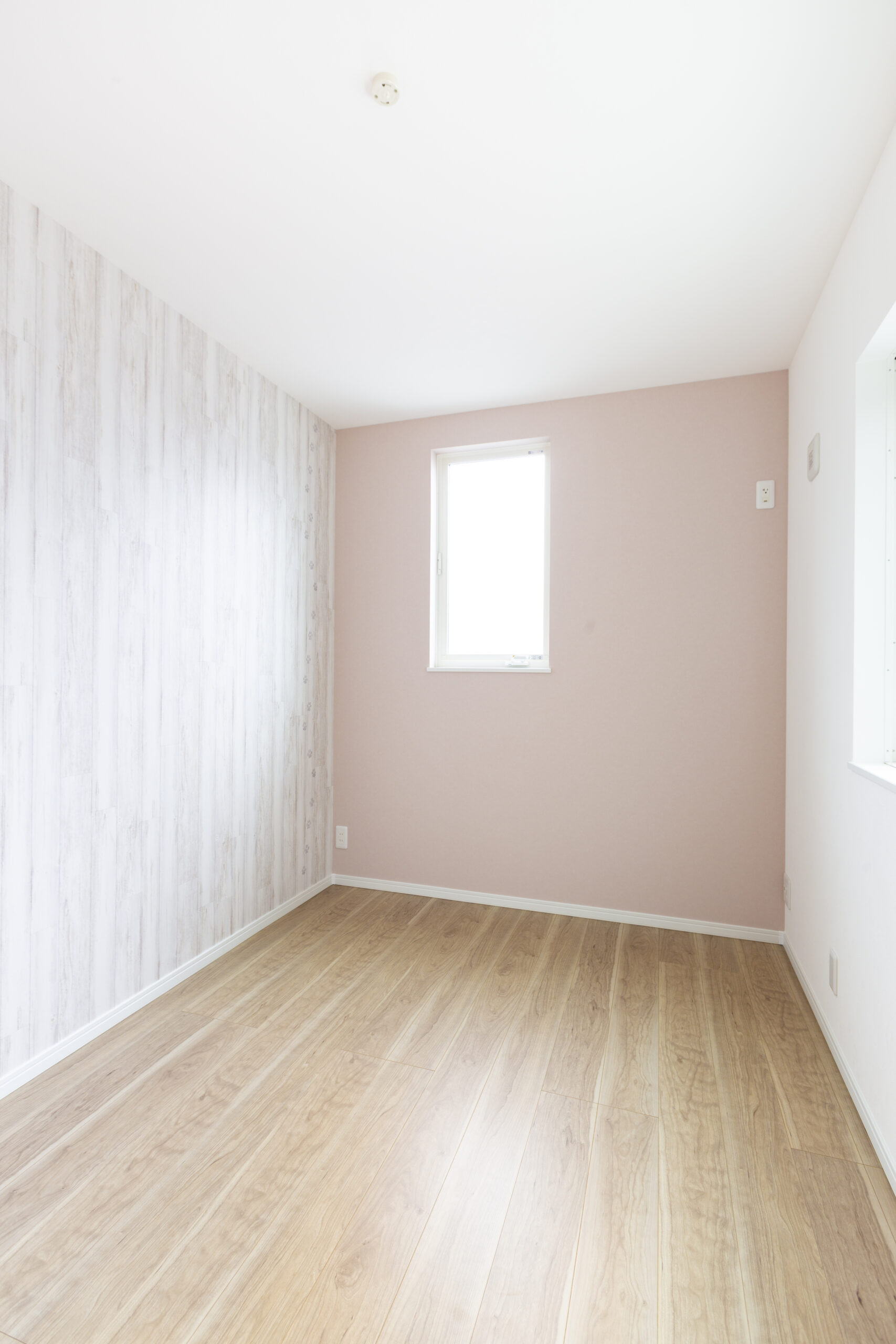 他の部屋はピンク色のクロスだけではなく、白木目に足跡がついた柄のアクセントクロスで可愛らしさが強調された印象のお部屋になっています。