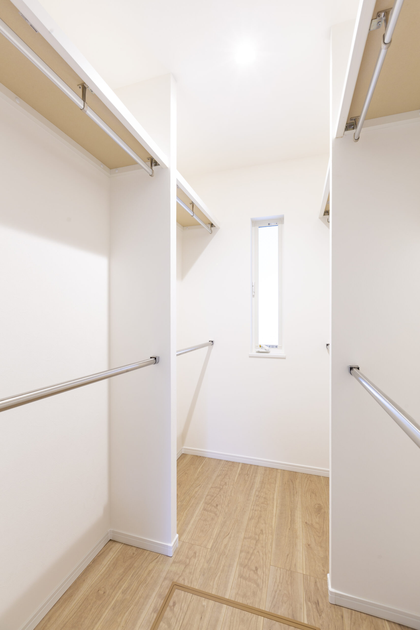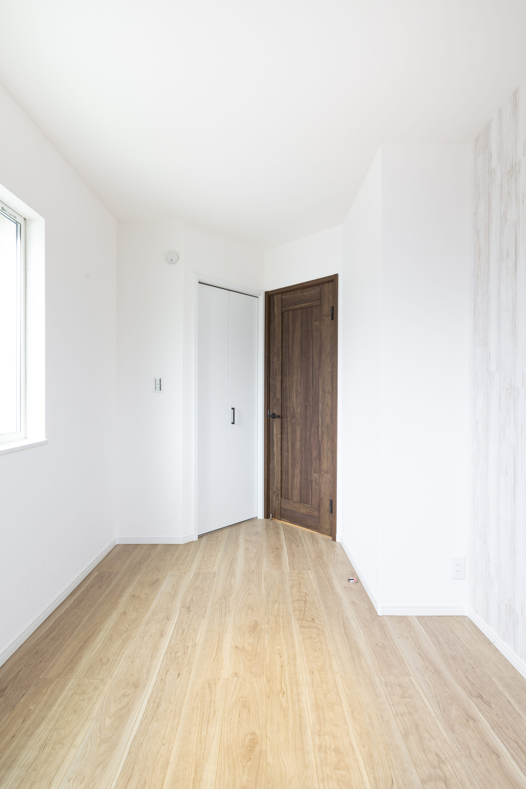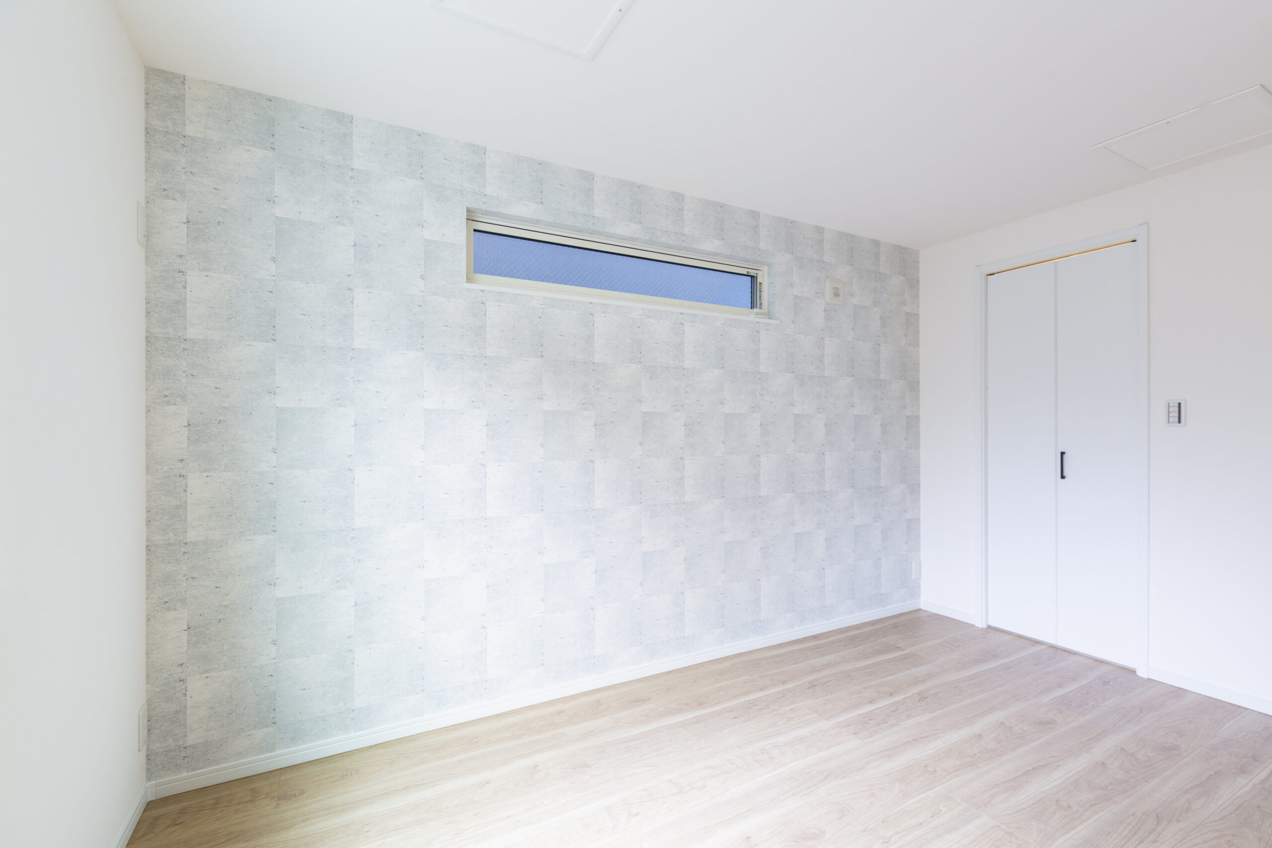 洋室は1階に3部屋。その内の2部屋にはWICを設けて、収納スペースを確保しています。ひとつの部屋のアクセントクロスには、サンゲツRE51305を採用し他の空間とは異なる変化をつけています。