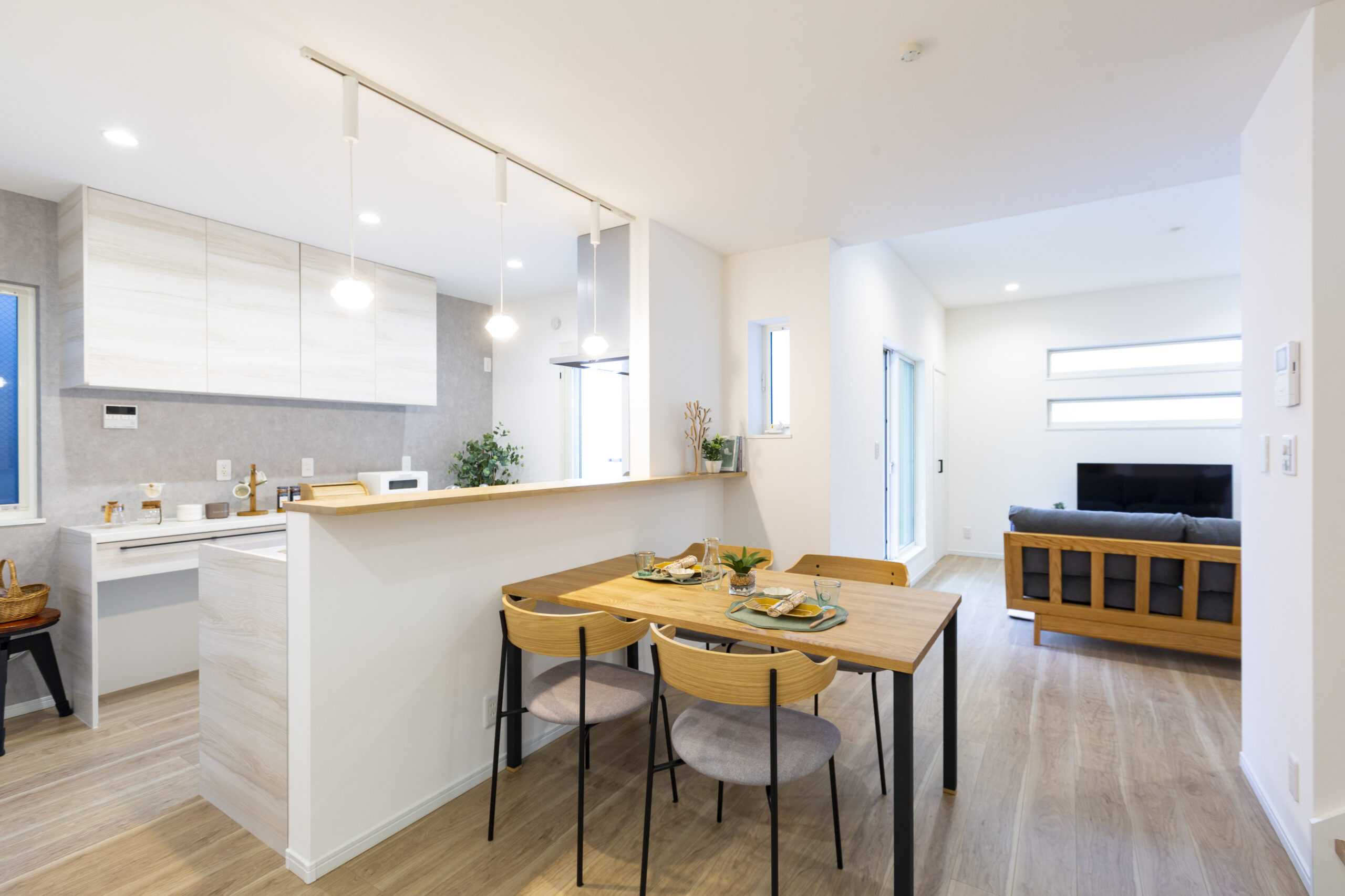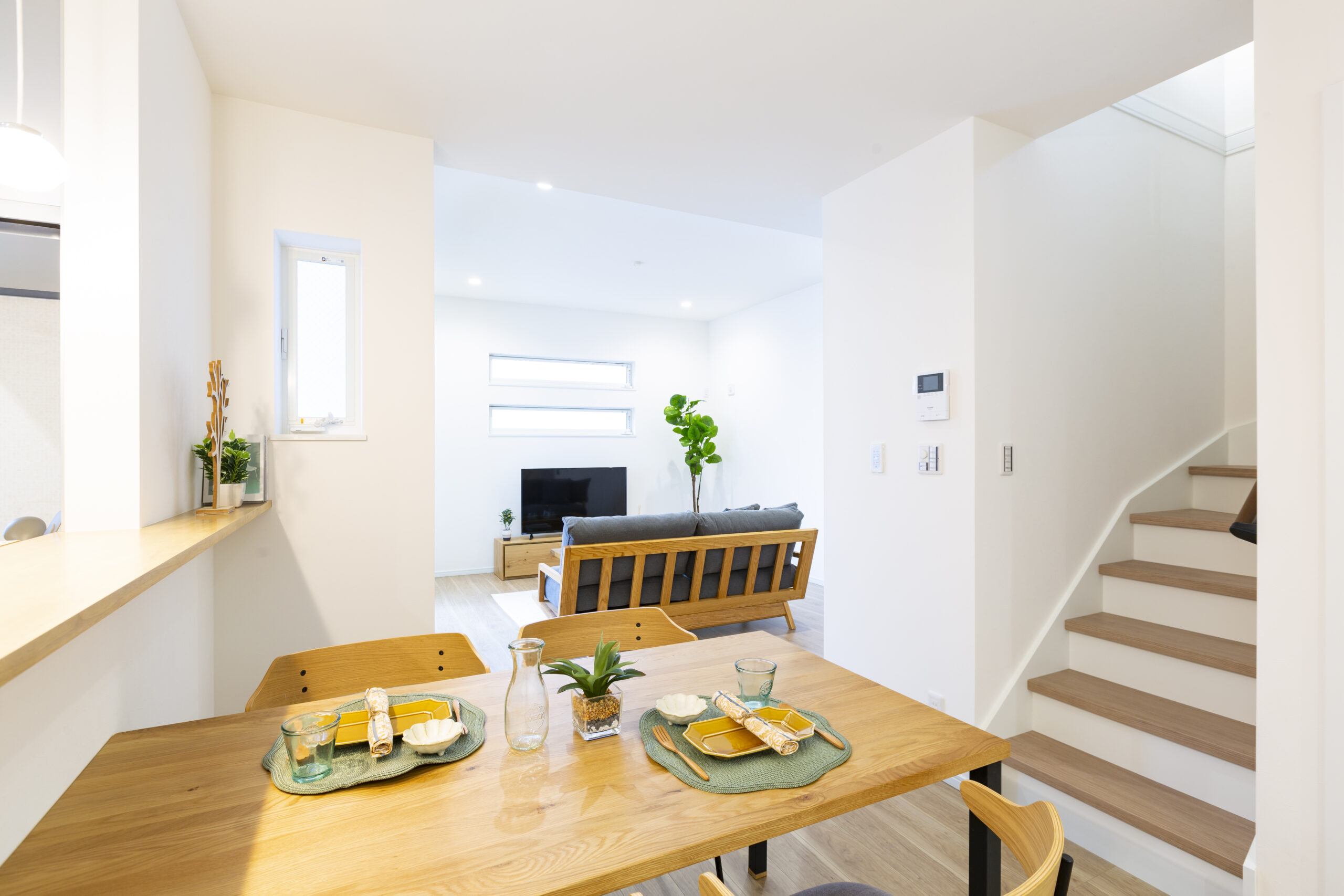 白基調でまとめられているLDK。ダイニングにはロフトへと上がる階段が繋がっています。