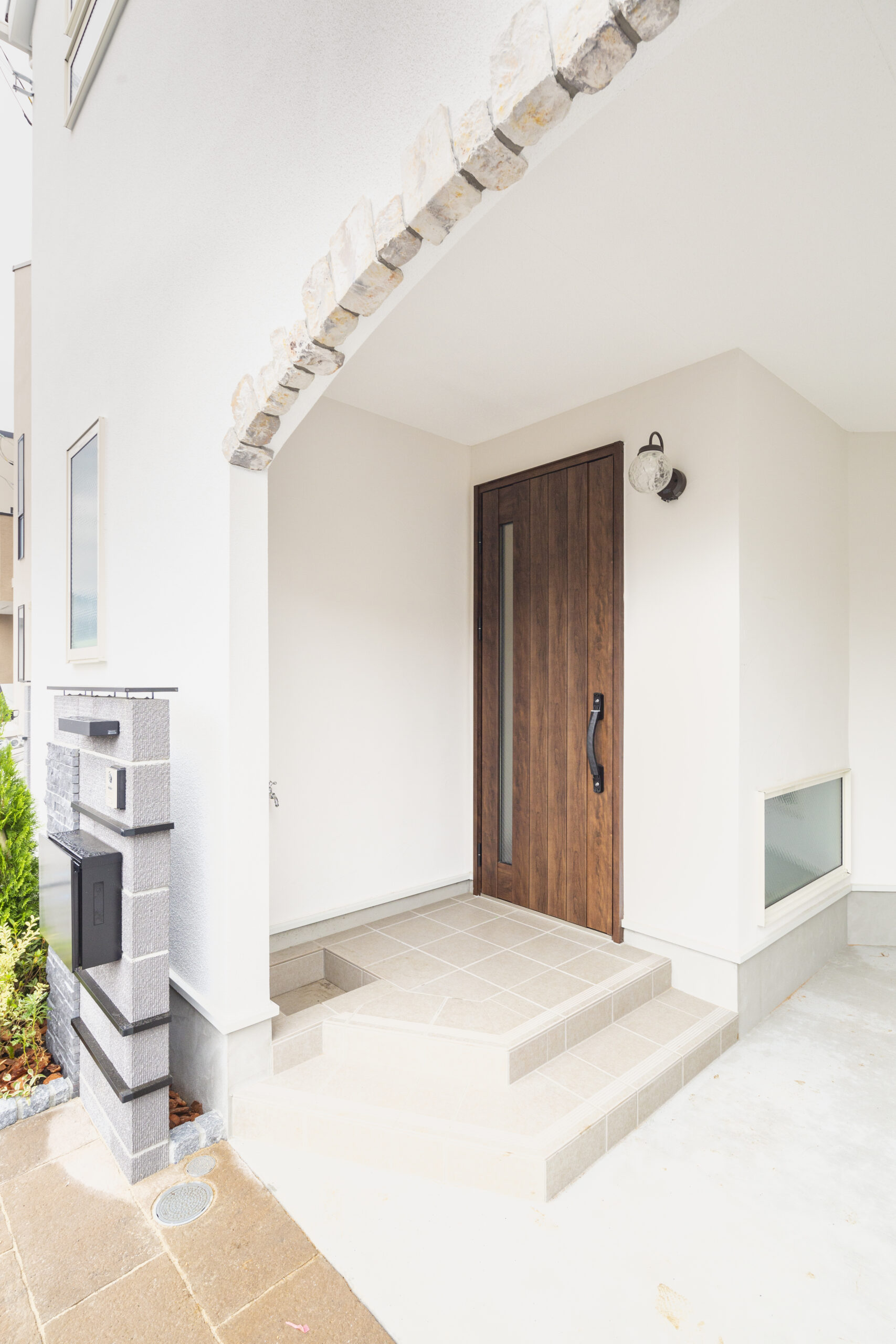 玄関ポーチとインナーガレージの入口が、アーチ状になっているのがポイントの外観。