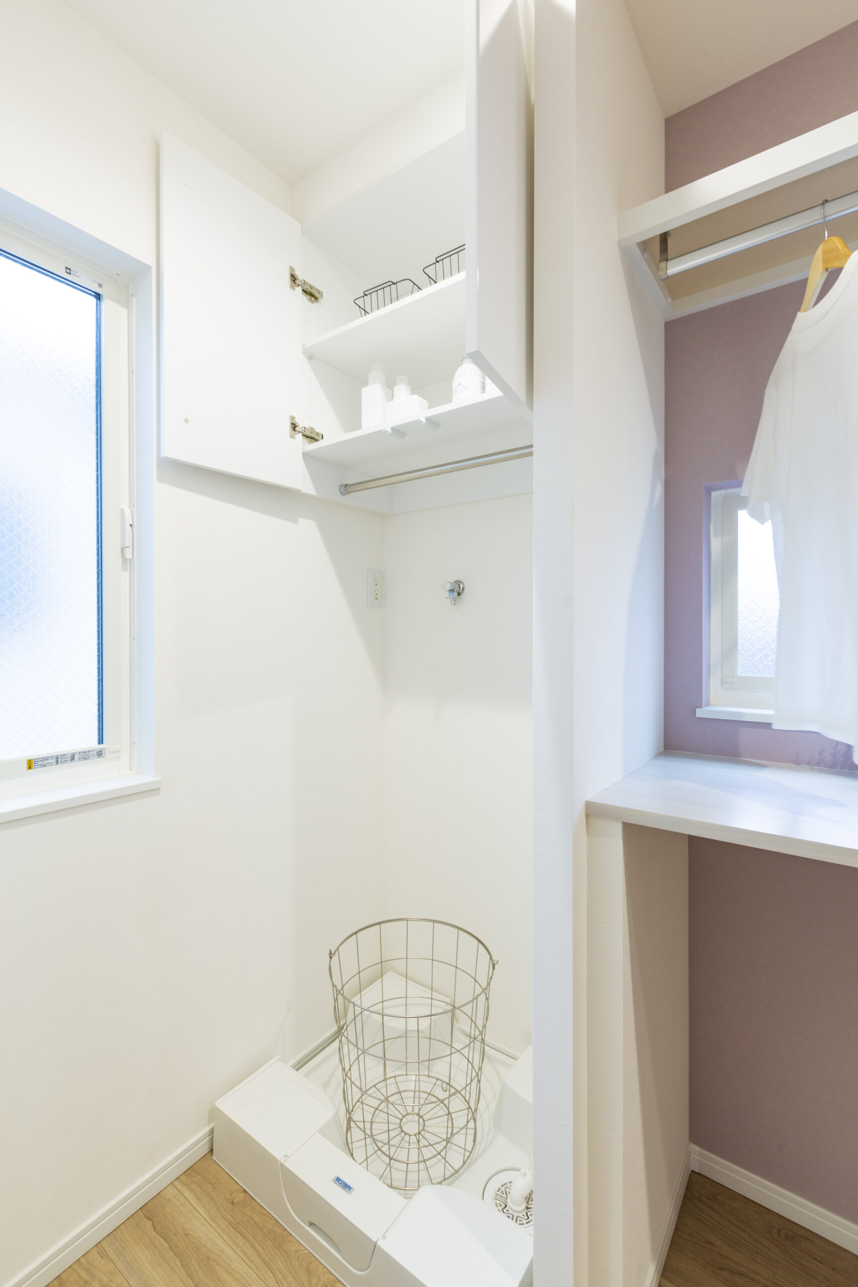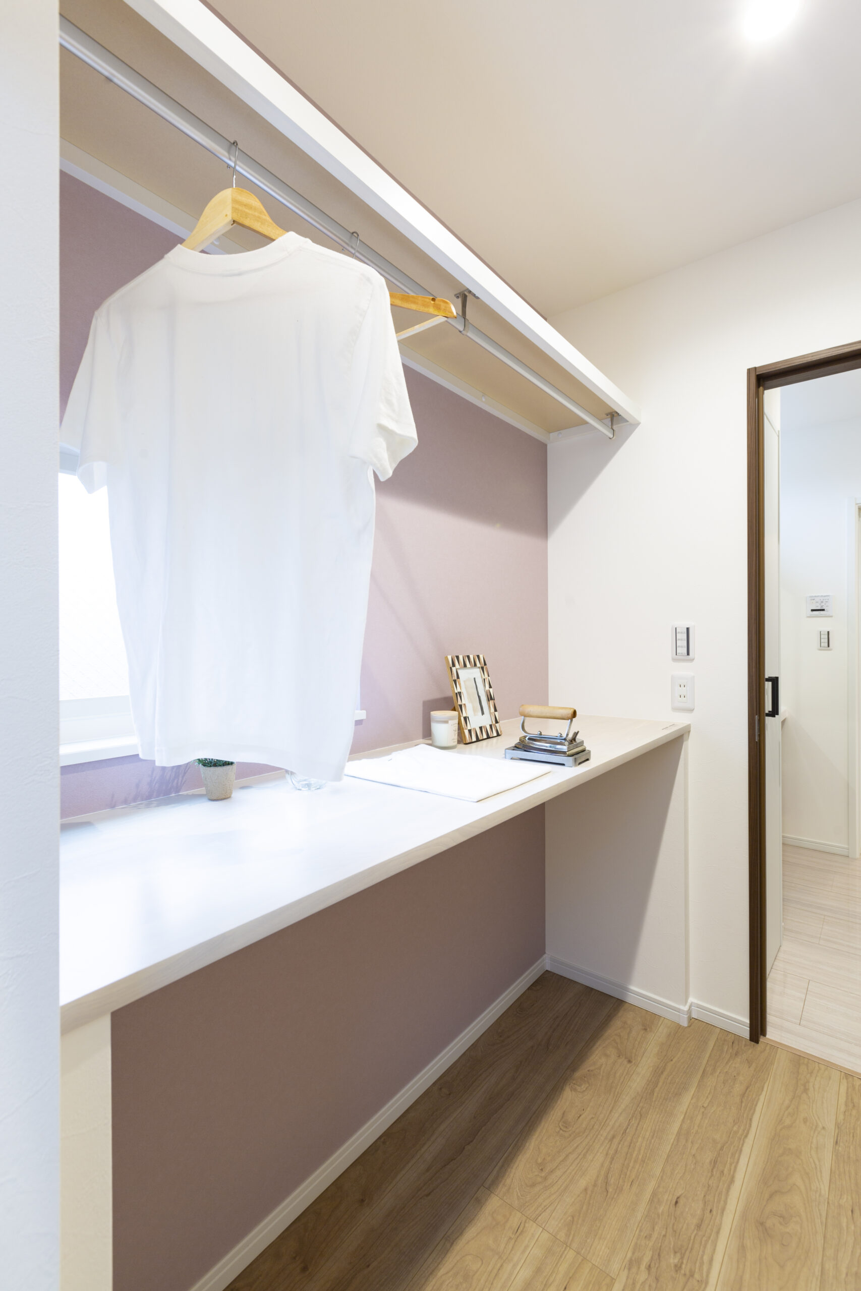 洗濯機から取り出した洗濯物は、横に設置しているハンガーパイプにかけて干すことができます。花粉やアレルギー、外に干すことで服に汚れがつくことを避けたい方には、ランドリールームはピッタリな仕様です。