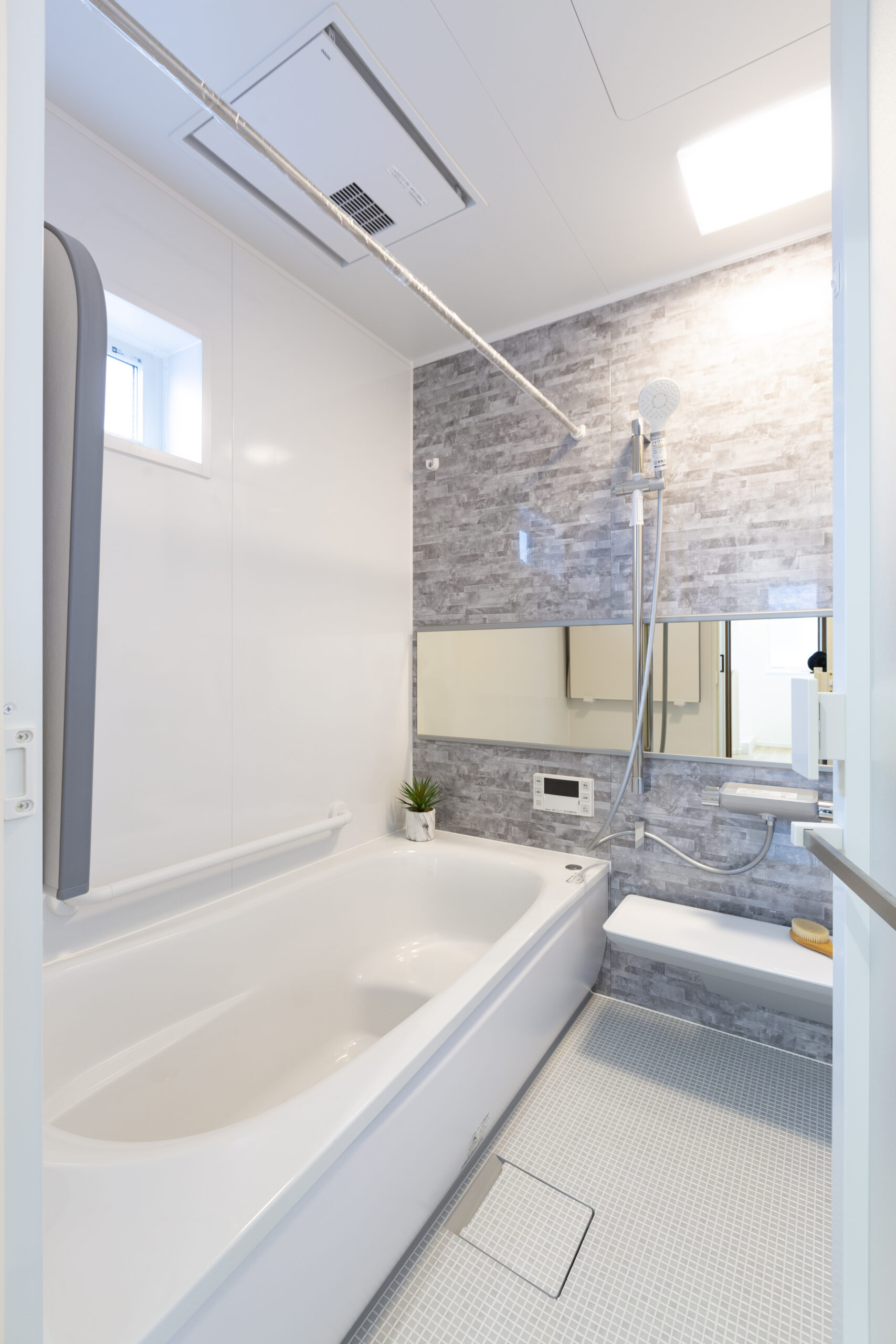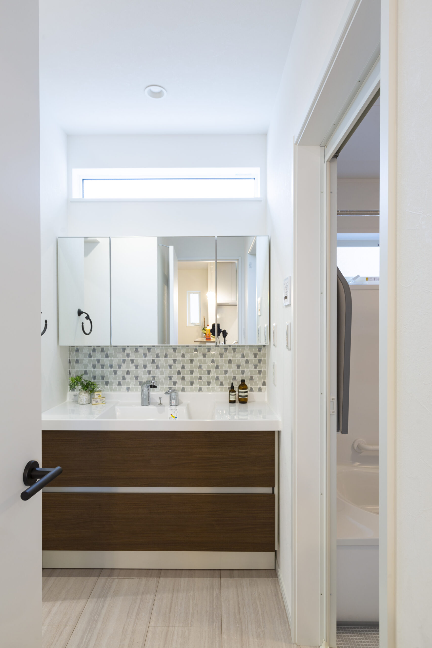ランドリールーム-洗面脱衣室-浴室までが一直線に並ぶ間取り。