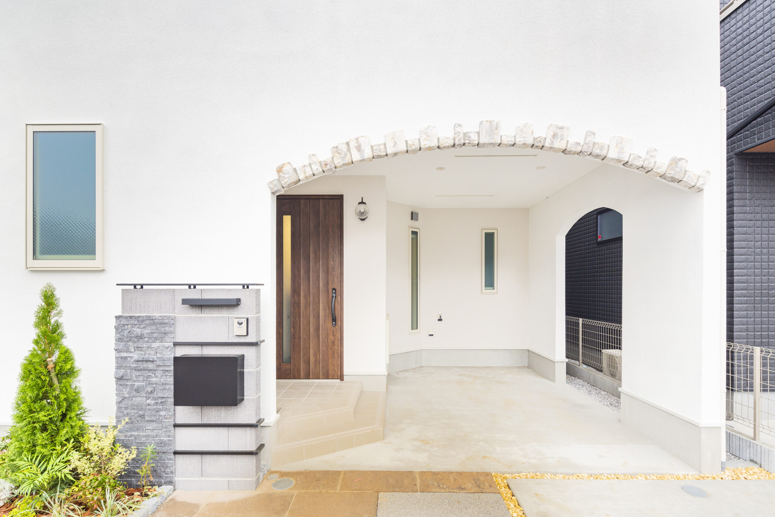 玄関ポーチとインナーガレージの入口をアーチ状にデザインした、やわらかな可愛らしさが魅力の外観。真っ白でシンプルな外壁ながら、アーチのラインに沿ってあしらったレンガが、上品で落ち着いたアクセントになっています。