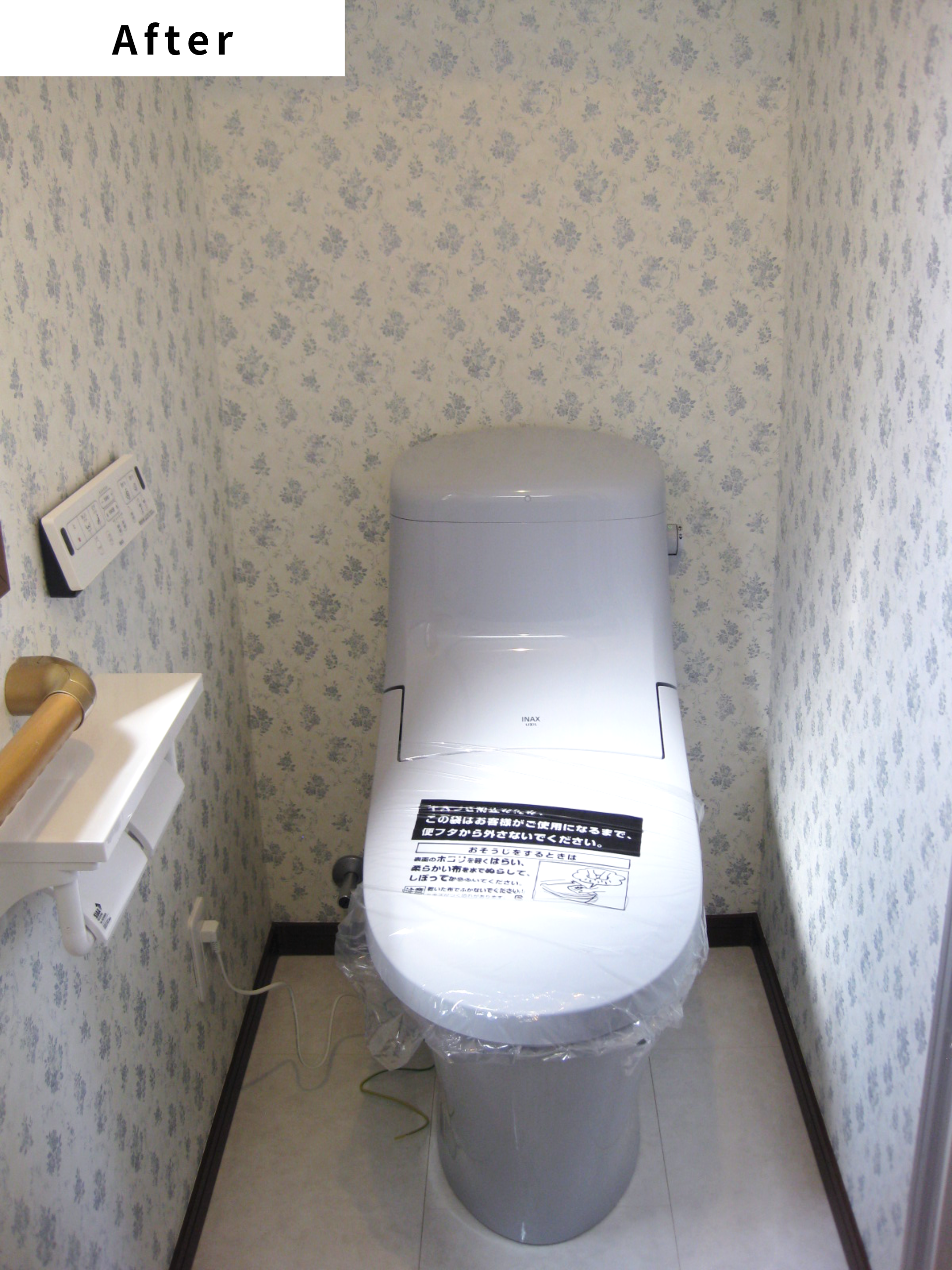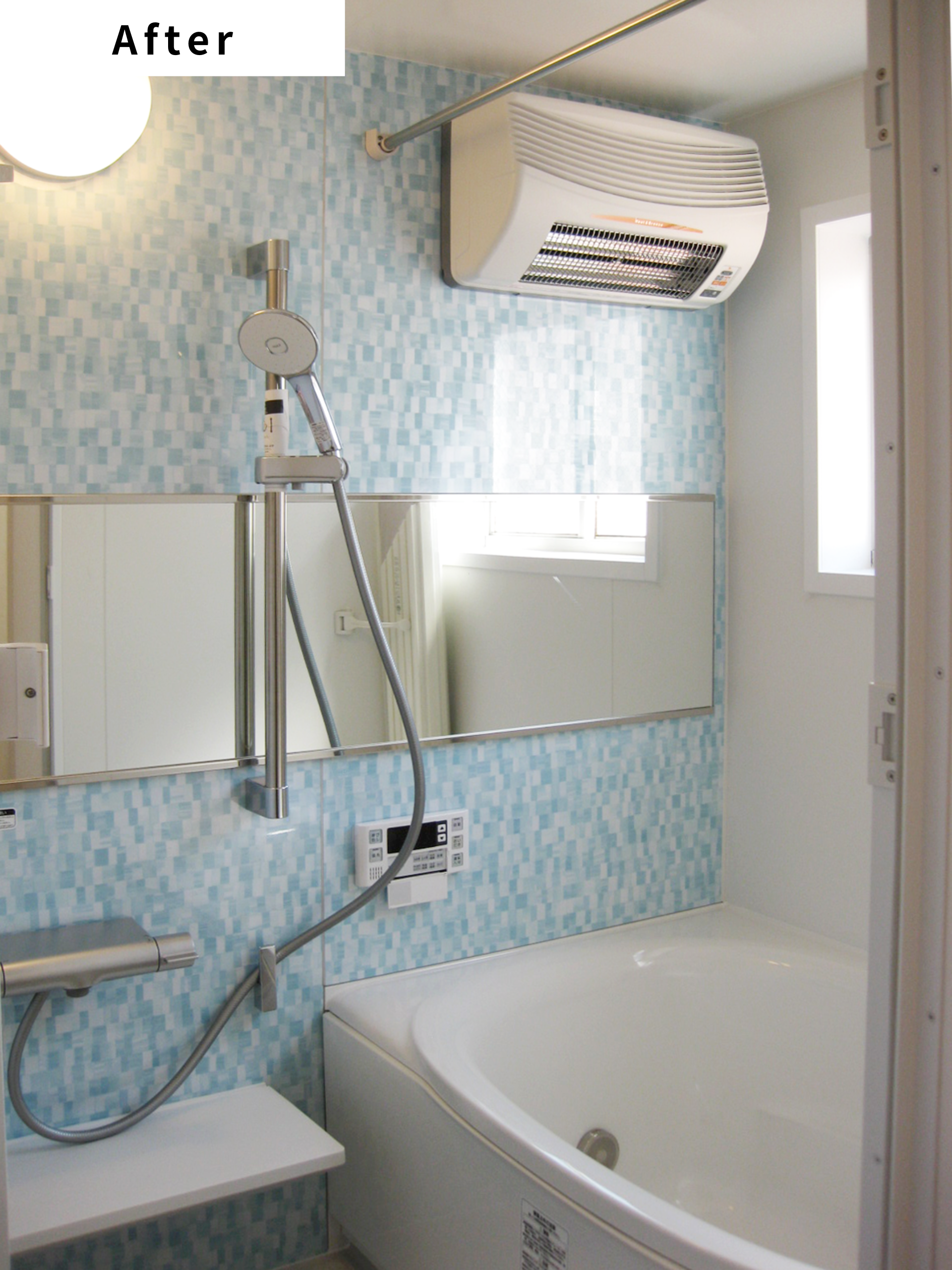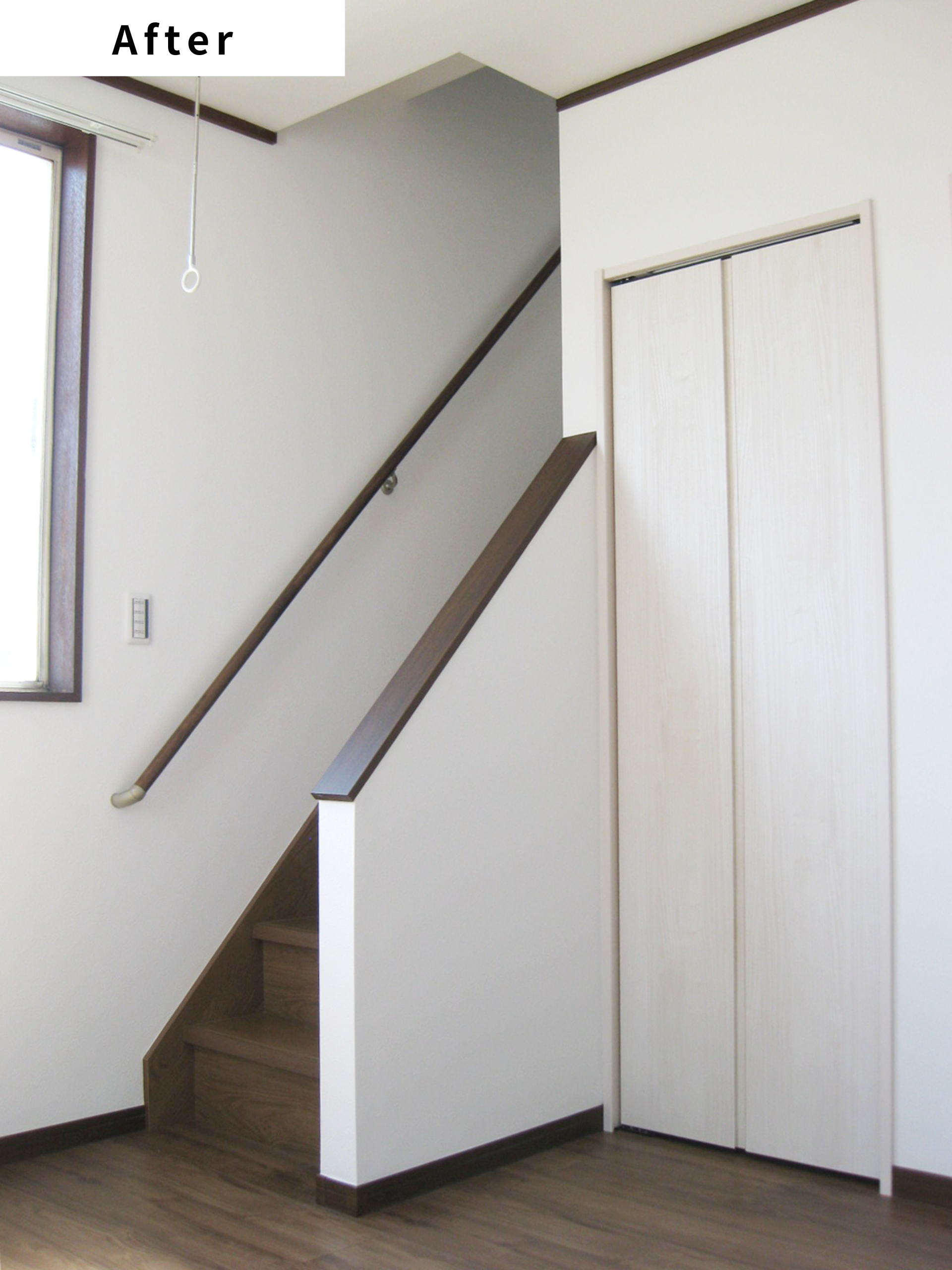 また、1階と2階をつなぐスキップフロアにはトイレと浴室を設け、横に広げられない狭小住宅の構造を活かした設計に。ホワイトを基調とし、淡いブルー柄の壁クロスで爽やかな水回りに仕上げました。さらに、2階上部の屋根裏収納には、これまでのはしごに代わり固定階段を設置。安全性と利便性を高め、日常的に使いやすい収納空間へと生まれ変わりました。