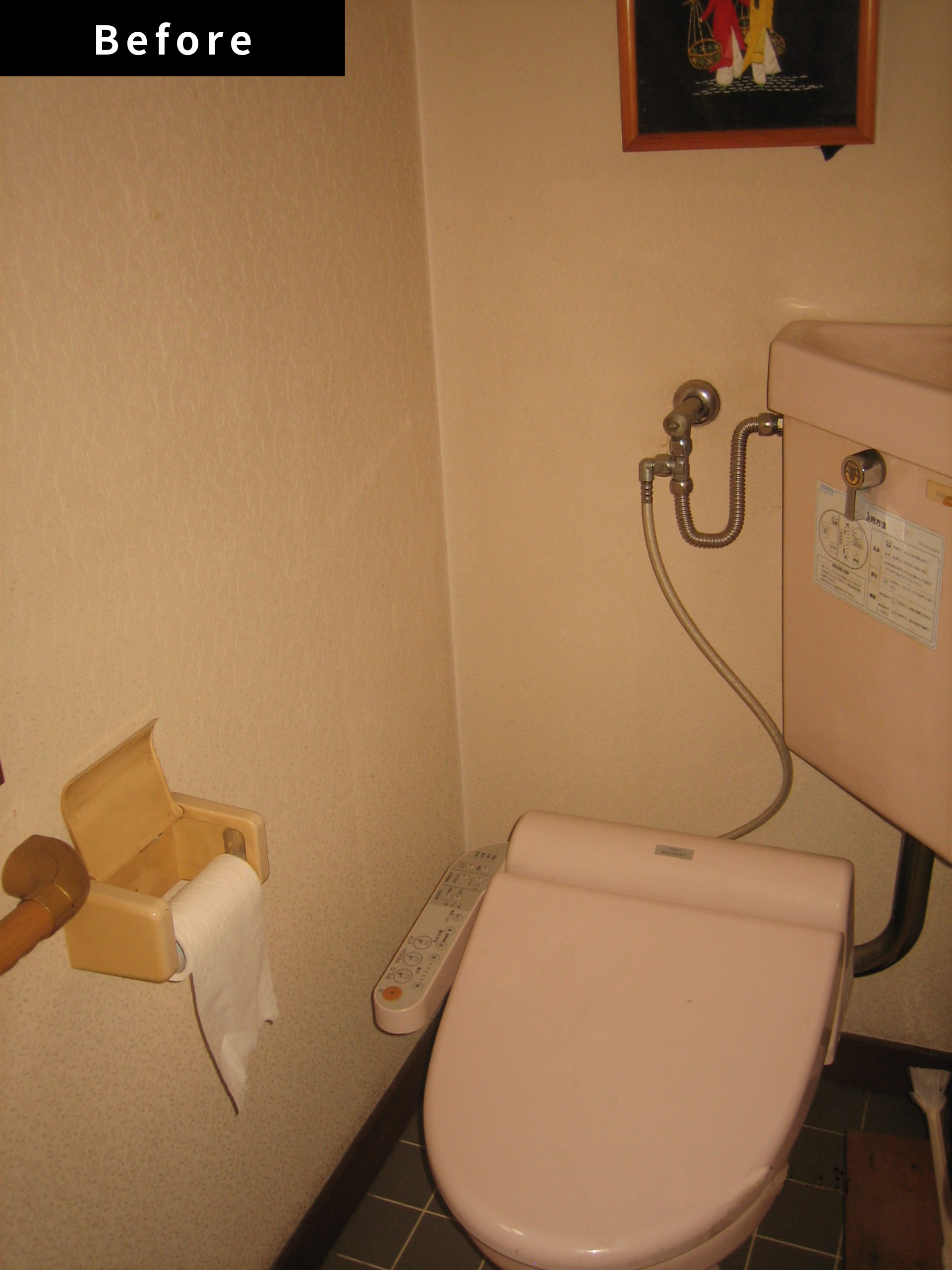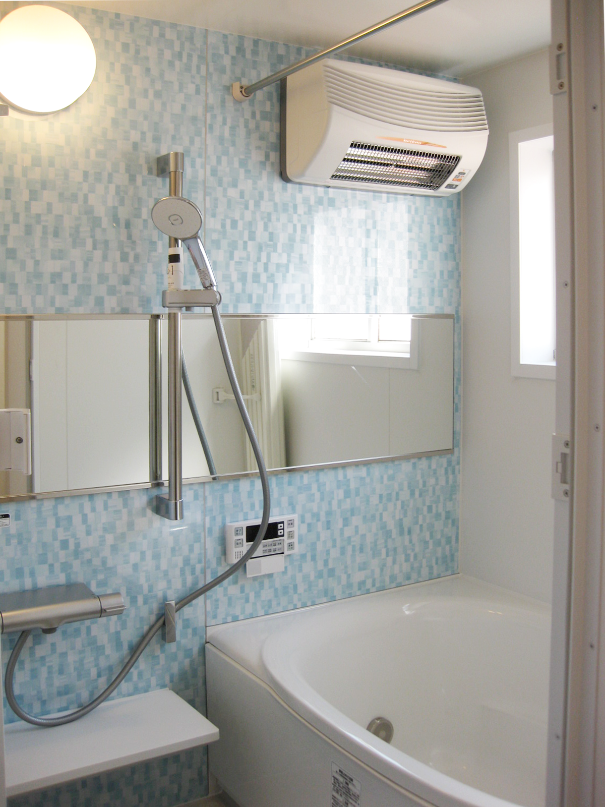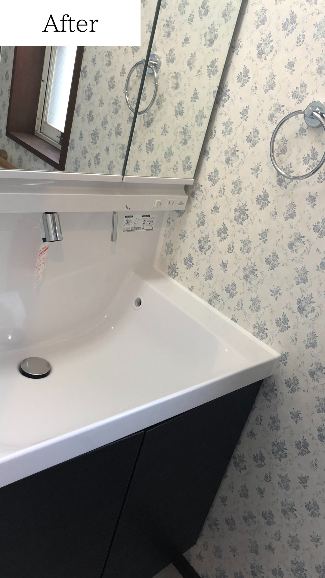 また、1階と2階をつなぐスキップフロアにはトイレと浴室を設け、横に広げられない狭小住宅の構造を活かした設計に。ホワイトを基調とし、淡いブルー柄の壁クロスで爽やかな水回りに仕上げました。さらに、2階上部の屋根裏収納には、これまでのはしごに代わり固定階段を設置。安全性と利便性を高め、日常的に使いやすい収納空間へと生まれ変わりました。