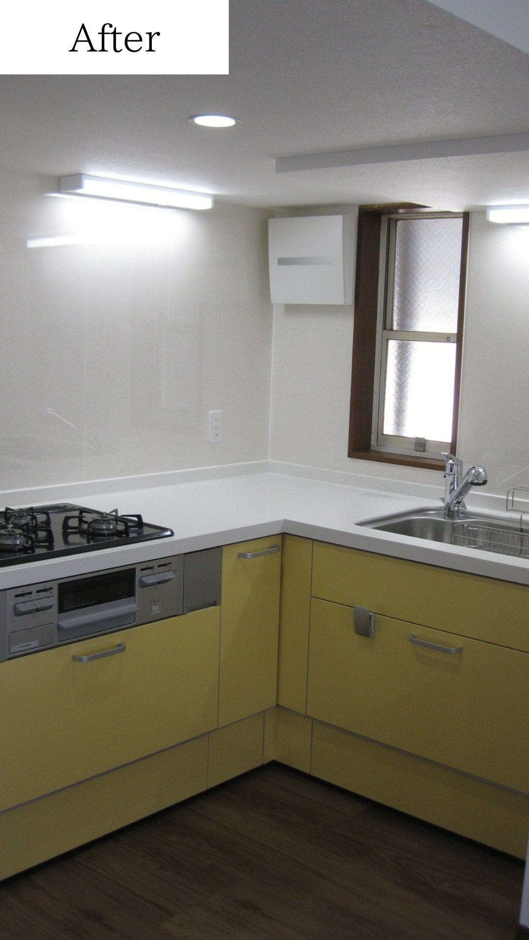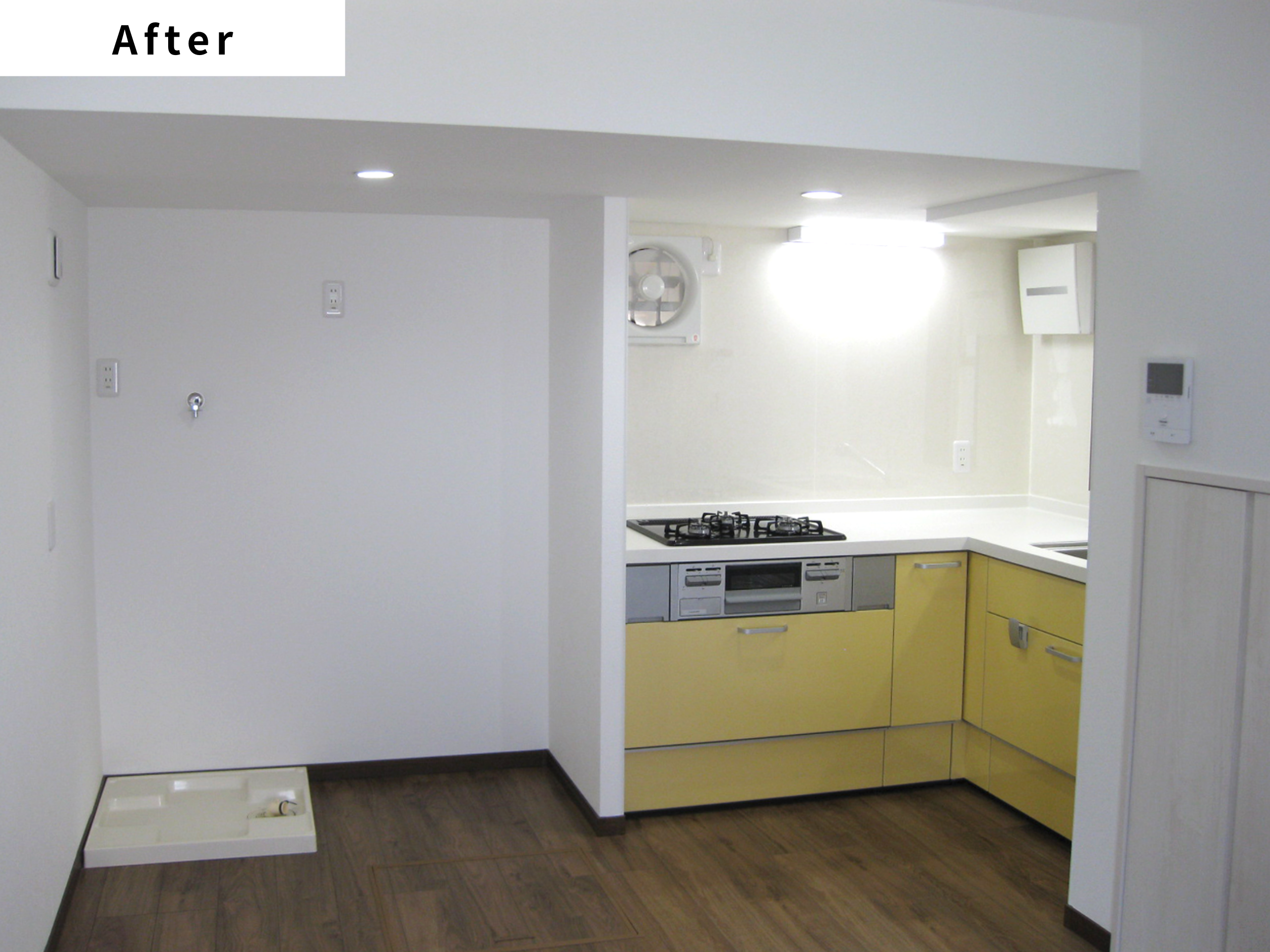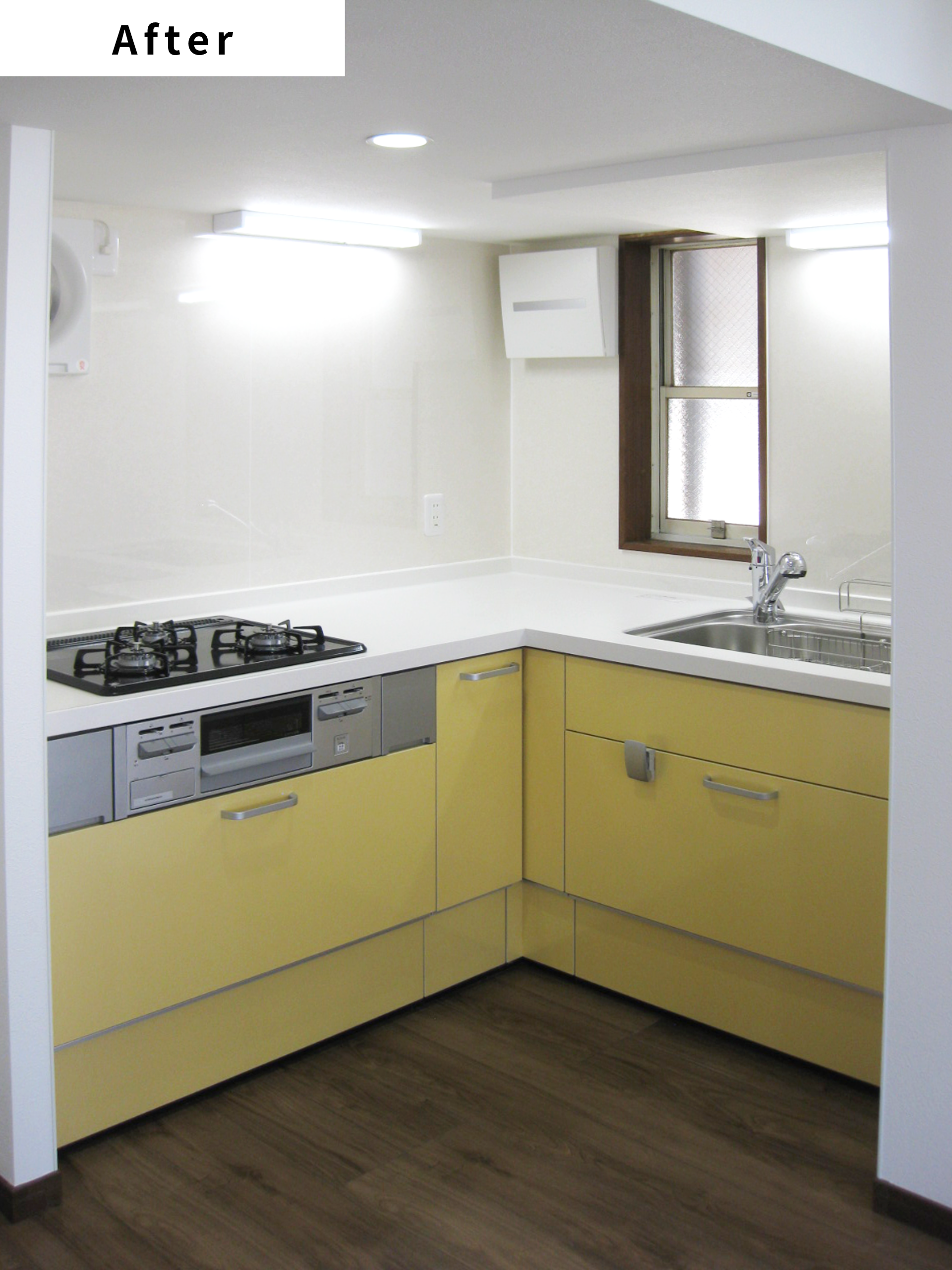 キッチンと家電スペースの配置を入れ替え、階段下にL字キッチンを設置することでデッドスペースを有効活用。ホワイトの壁パネルで空間に広がりを持たせつつ、イエローのキッチンが明るく心地よい印象を演出しています。